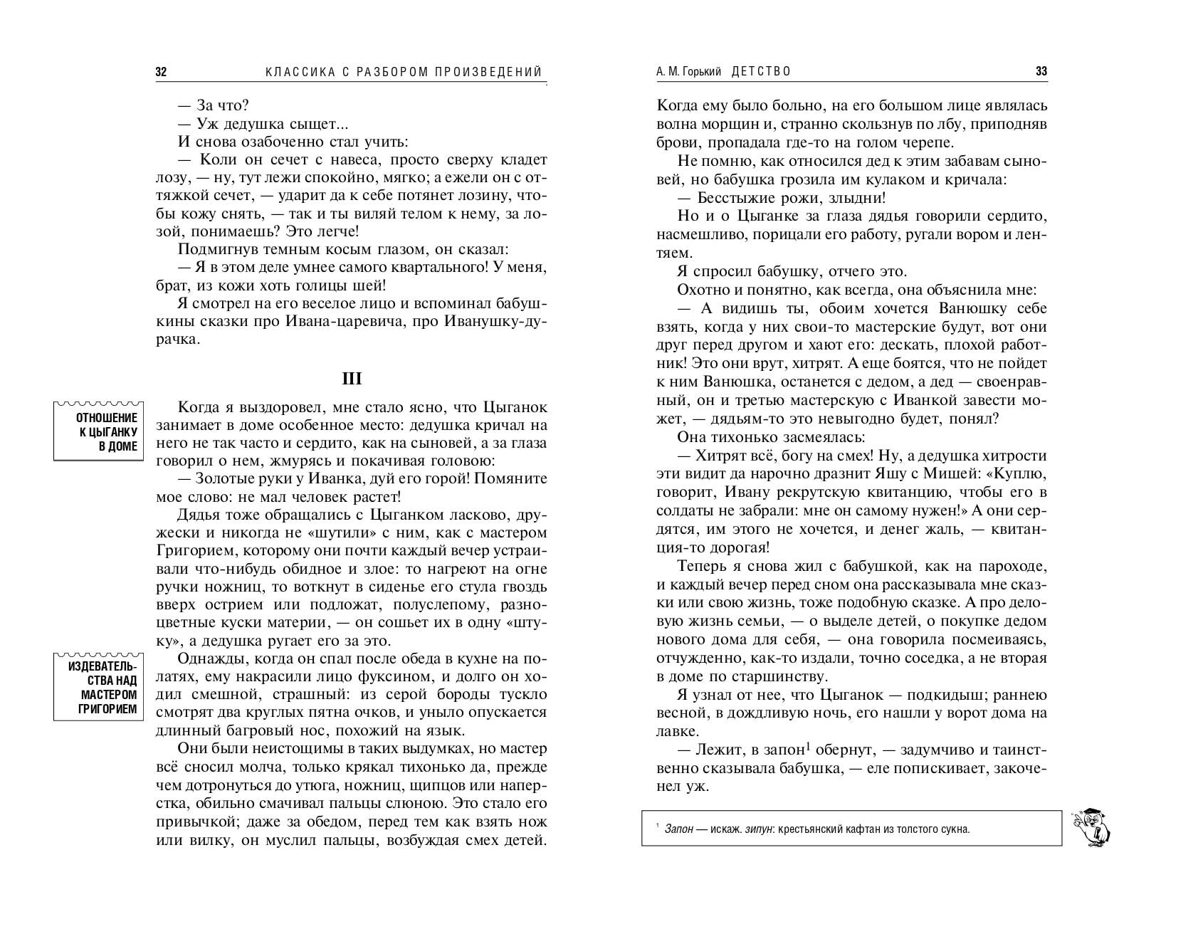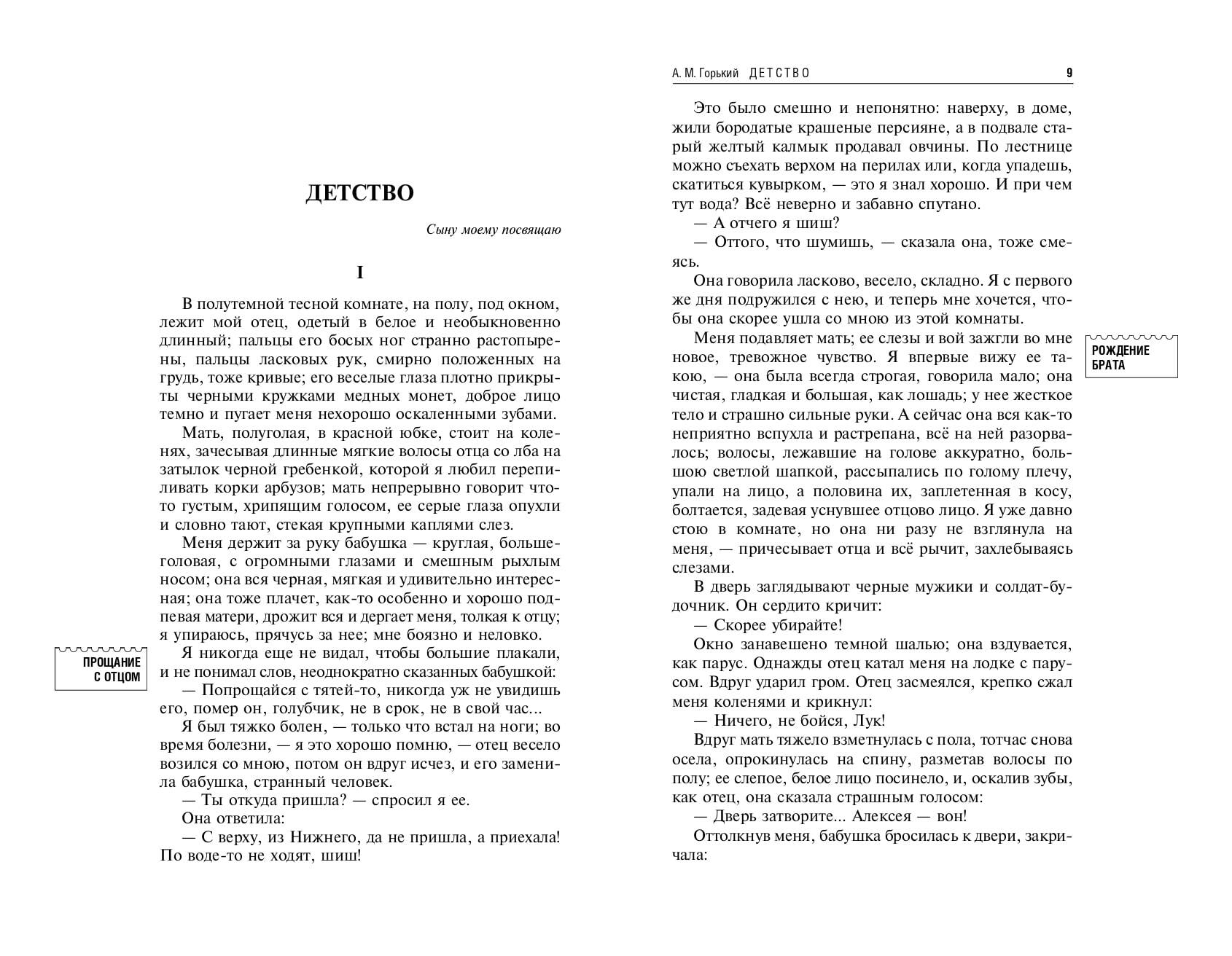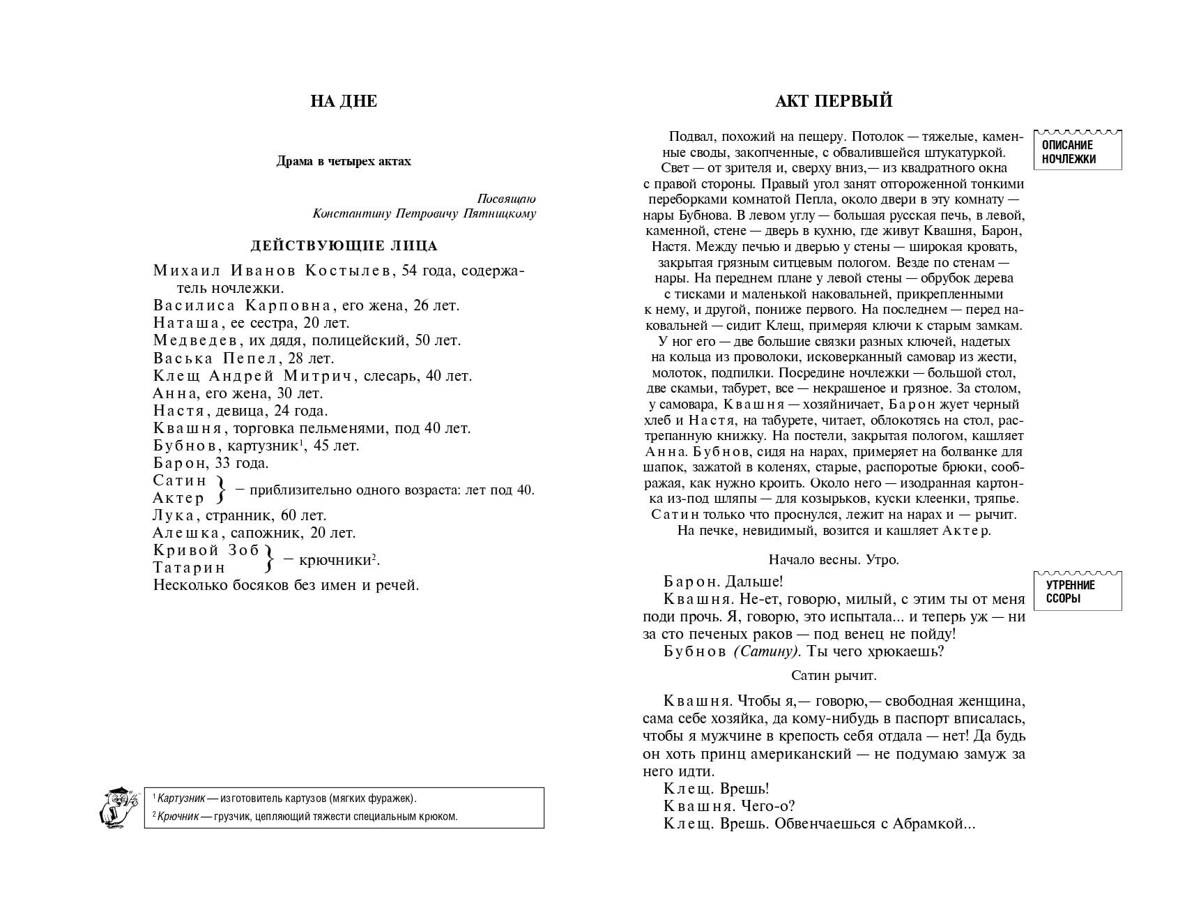 В книгу вошли два легендарных произведения русской литературы, написанные пятикратным номинантом на Нобелевскую премию М. Горьким. Повесть «Детство» и пьеса «На дне» до сих пор пользуются большой популярностью как среди школьников, так и среди представителей старшего поколения. Новое издание этих произведений в невероятном оформлении с голографической фольгой на обложке станет не только незаменимым помощником в подготовке к ЕГЭ, ОГЭ, урокам литературы, но и приятным подарком для всех ценителей классической литературы. В нем вы найдете уникальные справочные материалы: заметки на полях для быстрого поиска нужного фрагмента, развернутые комментарии, где объясняются устаревшие слова и непонятные факты, историю создания произведений, указатель имен и событий. Все это поможет не только быстро и легко подготовиться к экзаменам, но и узнать новые факты, которые можно было упустить на уроке. Повесть «Детство» является автобиографической и рассказывает о жизни и воспитании Алеши Пешкова (настоящее имя автора) в глухой провинции XIX века. Через воспоминания главного героя автор показывает жестокость и лицемерие общества, сохраняя при этом веру в человечность и светлое будущее. Герои социально-философской драмы «На дне» - изгои, «бывшие» люди, влачащие жалкое существование в ночлежке для бедных - делятся своими трагическими жизненными историями. Появление таинственного странника Луки заставляет героев поверить в светлое будущее, привносит веру в лучшее, однако суровая реальность не дает их надеждам осуществиться. Собрание всех книг серии «Классика с разбором произведений» в стильных обложках станет невероятным украшением домашней библиотеки. Ее яркое оформление можно будет заслуженно назвать жемчужиной вашей коллекции.| Издательство | ООО "Издательство "Эксмо" |