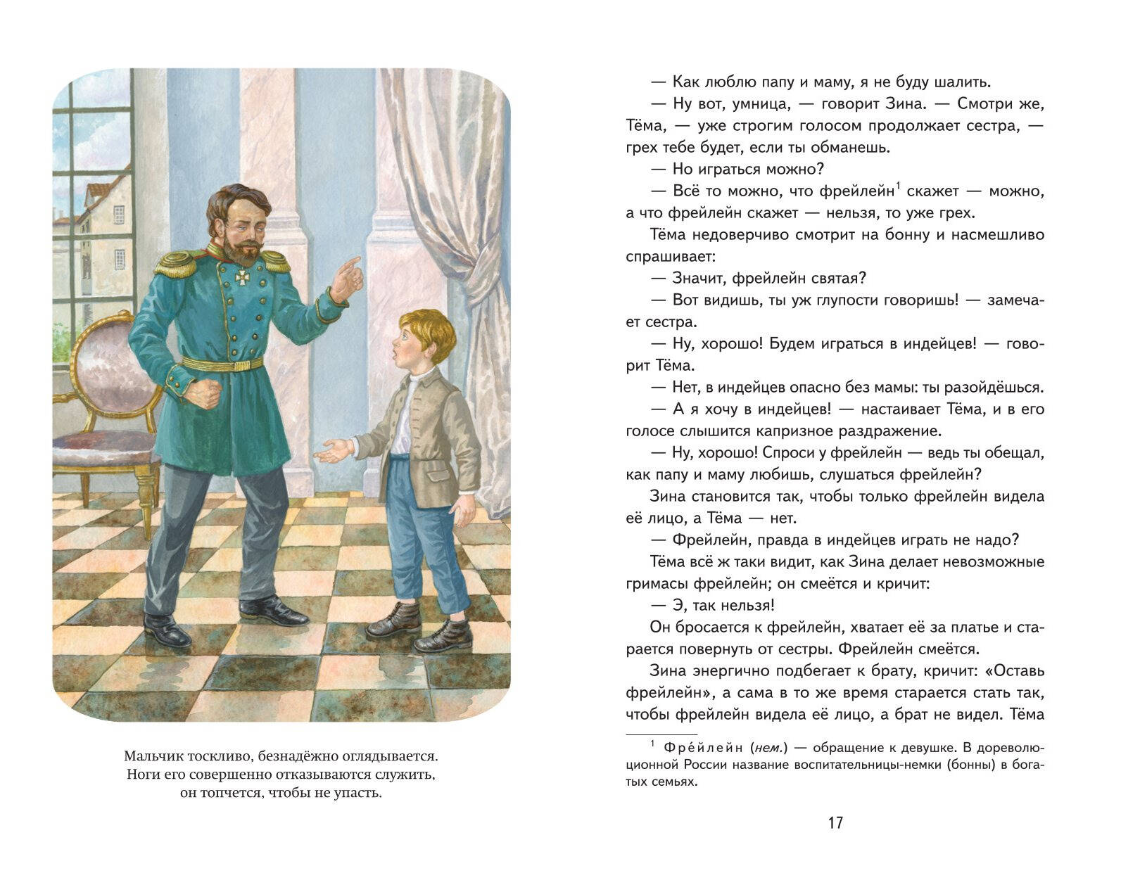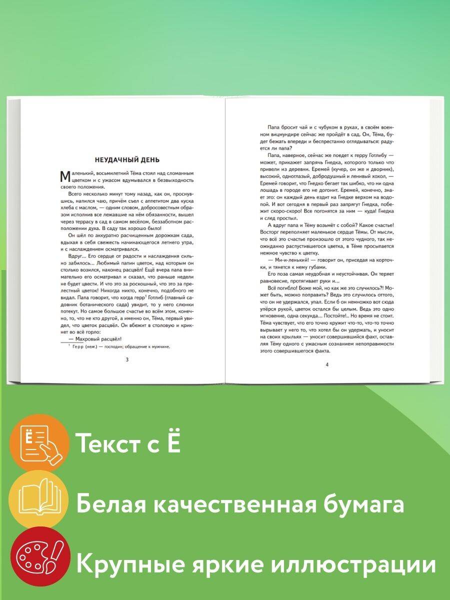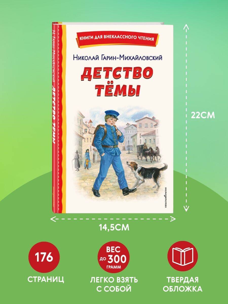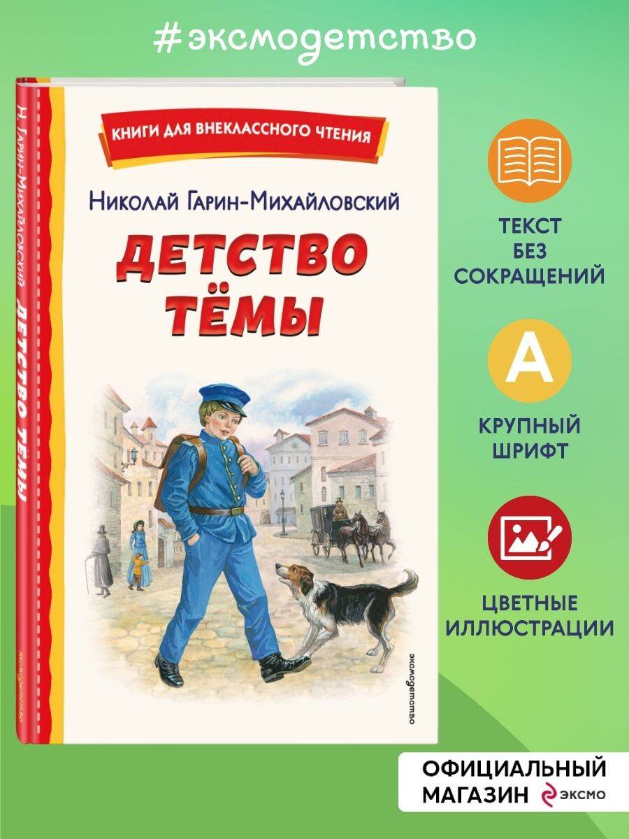«Детство Темы» - повесть Николая Гарина-Михайловского, в которой юный главный герой, восьмилетний Тема, делает первые шаги во взрослую жизнь. Расти в доме строгого отца - отставного генерала - совсем не просто, и все же Тема остается живым и непоседливым ребенком, который допускает ошибки и учится на них. Это произведение остается актуальным и сегодня: трогательная история взросления знакома каждому, а в Теме легко увидеть самого себя - свои сомнения, мечты и страхи. Для читателей 10-11 лет (4-5 классы). Яркие полноцветные иллюстрации Екатерины Лопатиной увлекут ребенка и помогут ему полюбить чтение! Серия «Книги для внеклассного чтения» - это широкий список классических произведений русской и зарубежной литературы, включённых в школьную программу начальной и средней школы. В серию входят самостоятельные произведения без сокращений, сборники рассказов и стихов, хрестоматии и сборники внеклассного чтения. «Книги для внеклассного чтения» - это: • Соответствие школьной программе - книги рекомендованы для внеклассного чтения. • Классика детской литературы - лучшие произведения русских и зарубежных авторов. • Цветные иллюстрации - яркие картинки делают чтение увлекательным. • Удобный формат и твердый переплёт - удобно брать с собой, надежно в использовании. • Доступная цена - качественные книги в бюджетном сегменте. Книга станет хорошим подарком школьнику, пригодится на уроках литературного чтения и при освоении чтения на лето, поможет подготовиться к новому учебному году.| Издательство | ООО "Издательство "Эксмо" |