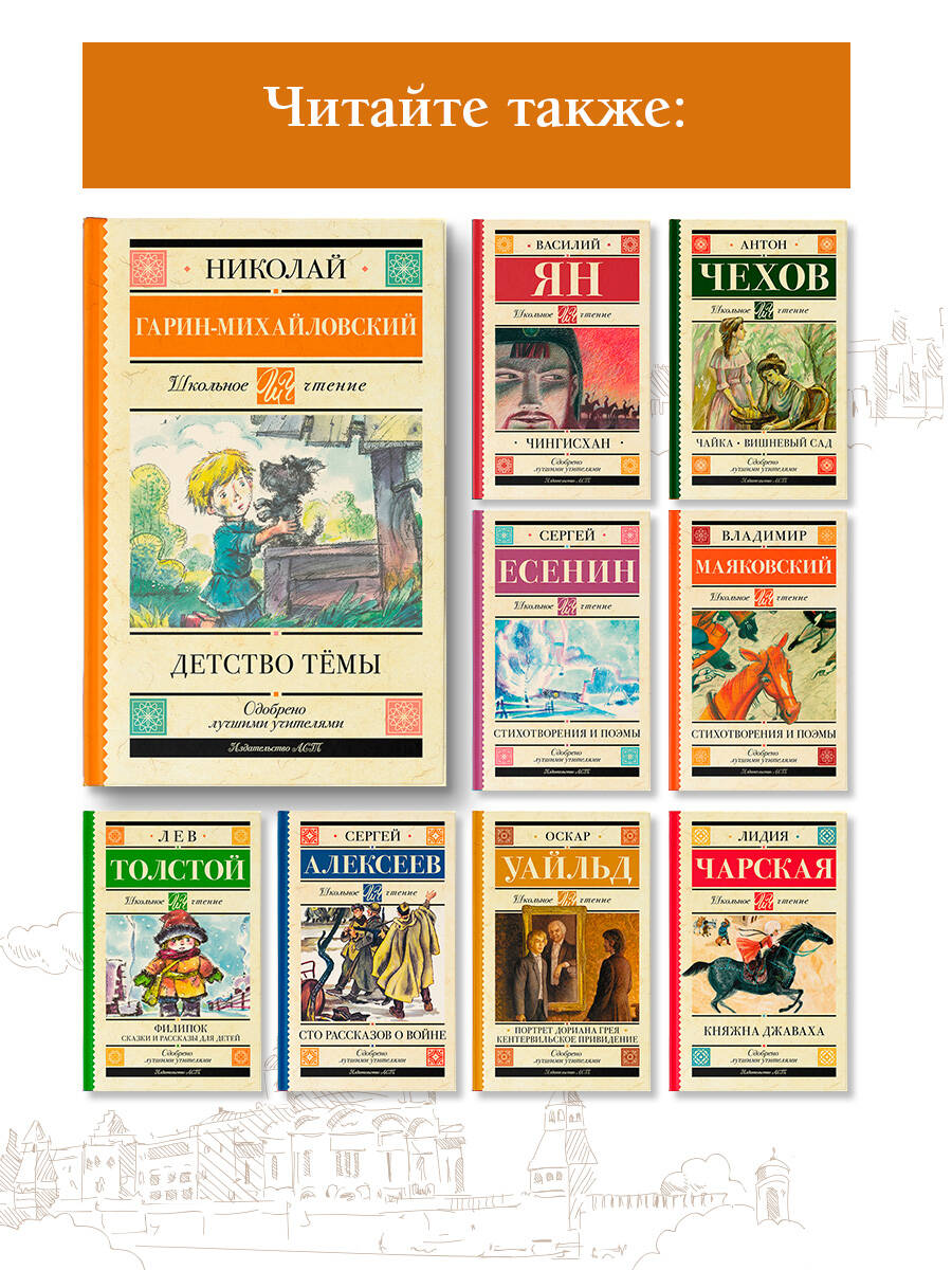 Знаменитая повесть Николая Георгиевича Гарина-Михайловского! «Детство Тёмы» - автобиографическая повесть. В ней Николай Георгиевич Гарин-Михайловский увлекательно, «без утайки и рисовки» рассказывает о своем детстве, пережитых радостях, проступках, мечтах. Детские проказы и невольные проступки, душевные порывы и мечты - история Тёмы Карташёва не оставит читателей равнодушными. В серию включены лучшие произведения отечественной и зарубежной литературы, входящие в школьную программу с 1 по 11 класс и в списки дошкольного чтения. Книги в твердом переплёте сделают знакомство с литературой легким и увлекательным. Серия, которая не ударит по семейному бюджету и поможет юному читателю расти нравственно и интеллектуально!| Издательство | АСТ |