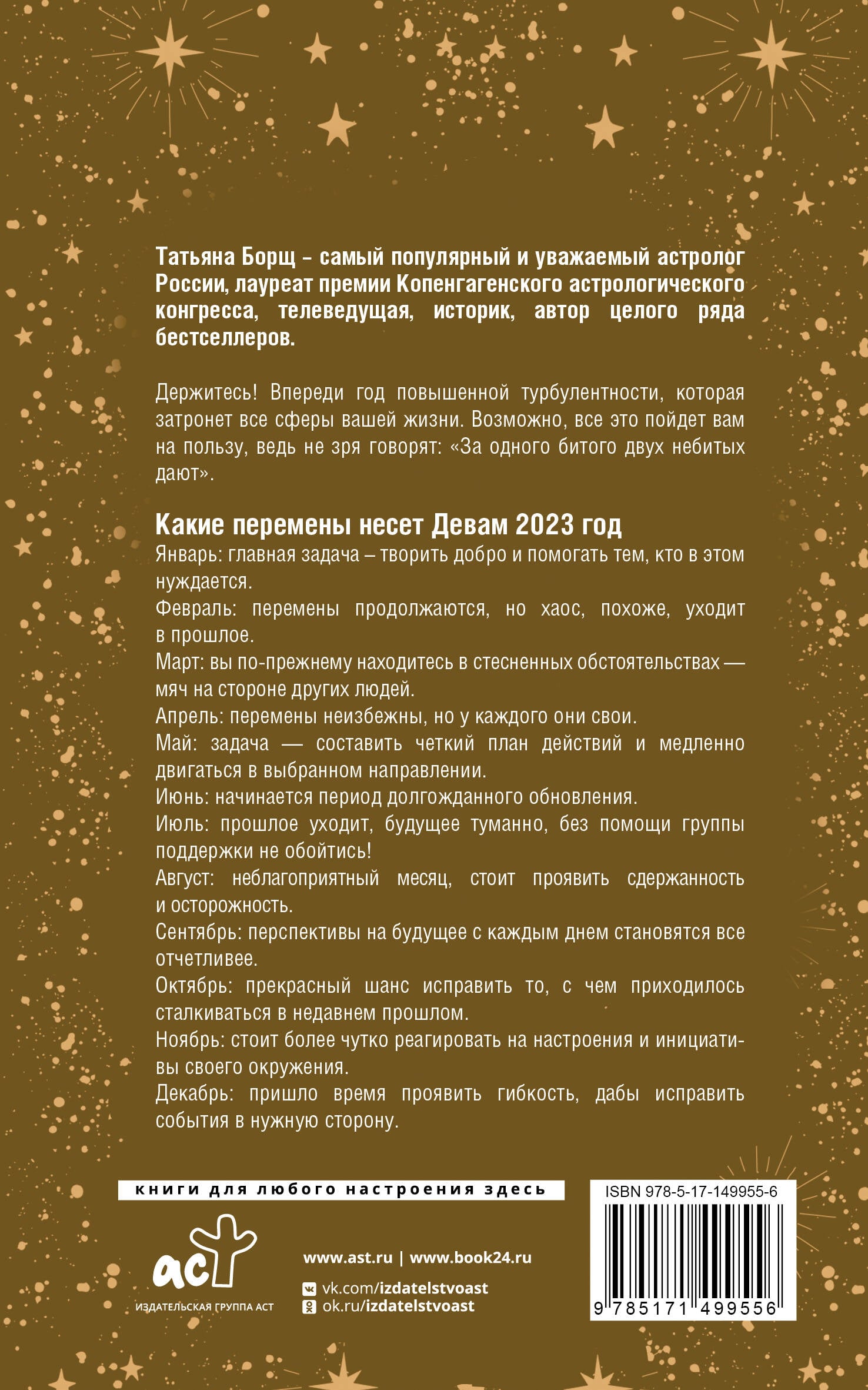Гороскопы на 2023 год для каждого знака зодиака от одного из самых популярных и уважаемых астрологов России Татьяны Борщ. Календари серии расскажут, что ждет вас в сфере работы, личной жизни, семьи и творческой реализации в каждый из месяцев нового года. Вы сможете заведомо подготовиться к непростым периодам и получить четкие рекомендации, которые помогут навести порядок в жизни вопреки неудачному расположению планет.| Издательство | АСТ |