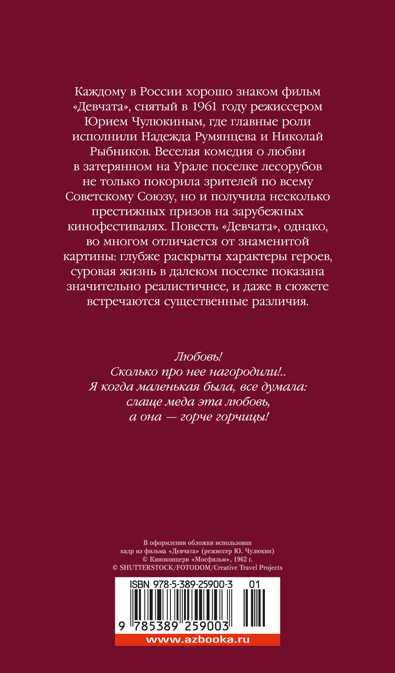 Борис Васильевич Бедный - советский писатель, ветеран Великой Отечественной войны, преподавал в Литературном институте на Высших литературных курсах (среди его учеников много прославленных писателей, например Чингиз Айтматов). Славу Борису Бедному принесла повесть "Девчата", переведенная на пятнадцать иностранных языков и легшая в основу одноименной кинокартины. Каждому в России хорошо знаком фильм "Девчата", снятый в 1961 году режиссером Юрием Чулюкиным, где главные роли исполнили Надежда Румянцева и Николай Рыбников. Веселая комедия о любви в затерянном на Урале поселке лесорубов не только покорила зрителей по всему Советскому Союзу, но и получила несколько престижных призов на зарубежных кинофестивалях. Повесть "Девчата", однако, во многом отличается от знаменитой картины: глубже раскрыты характеры героев, суровая жизнь в далеком поселке показана значительно реалистичнее, и даже в сюжете встречаются существенные различия.| Издательство | Азбука-Аттикус Издат.группа ООО |