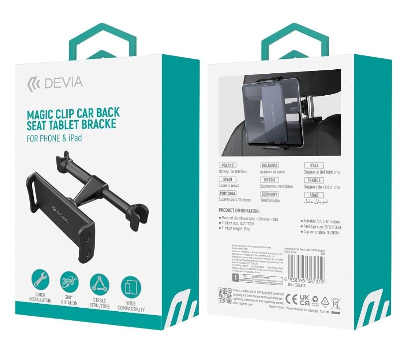 Devia Magic Clip - это универсальный держатель для подголовника автокресла. Расстояние между подлокотниками позволит вам удобно пользоваться смартфоном или планшетом в автомобиле, а каждому пассажиру на заднем сиденье будет удобнее путешествовать.