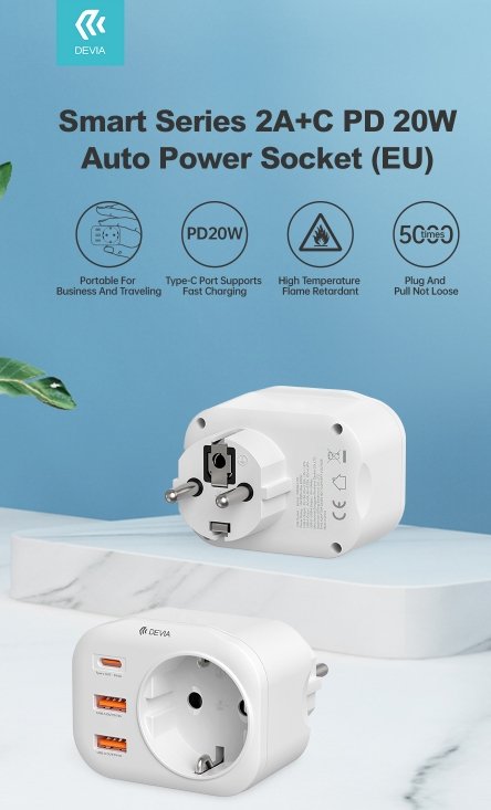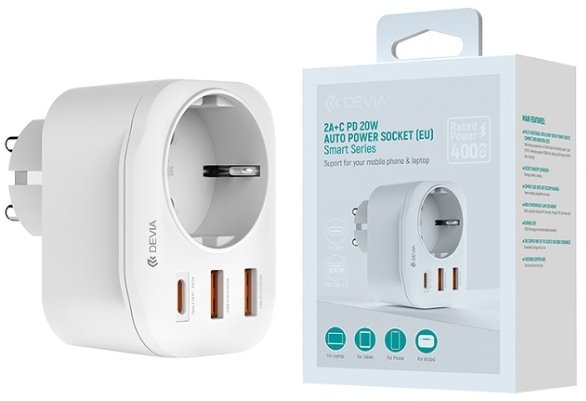 Одно устройство и много портов зарядки? Электрическая розетка от Devi оснащена 3 портами зарядки: 2x USB и 1x USB-C, что позволяет удобно заряжать несколько устройств одновременно.