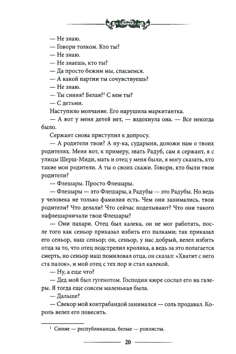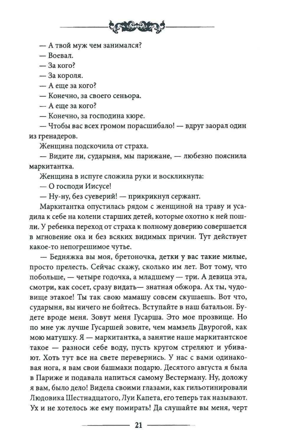 «1793-й - год, схожий с грозою своим гневом и своим величием». В этот год нерешительный король Людовик XVI удивил свой народ - смело шагнул на эшафот, прощая всех. Народ возликовал, растерялся, ошалел. И Франция стала новым царством - царством террора. Кто там был прав, кто виноват - на эти вопросы своими книгами пытались ответить Бальзак, Дюма, Диккенс... Вслед за их романами-драмами о Великой революции убеленный сединой и горьким опытом Гюго решился создать свой последний роман-трагедию - роман, ни на что не похожий, трагедию эпохи дикой охоты, где зверь, загонщик и ловчий непостижимо и фатально меняются ролями. События этой грандиозной энеиды развиваются и на суше, и на море - сначала в штормовой Бретани, затем в пьяном от страха Париже и, наконец, в оскалившихся джунглях Вандеи. На страницах этого захватывающего дух романа моряки и аристократы, священники и солдаты, бродяги, патриоты и заговорщики, «люди, львы, орлы и куропатки» - песчинки в маховике истории - мучаются вопросом: может ли добрый поступок оказаться дурным? «Кто спасает волка - убивает ягнят». Настоящее издание романа Виктора Гюго «Девяносто третий год» украшают более двухсот иллюстраций, среди них большой комплект к французскому книжному изданию XIX века (гравюры известных иллюстраторов и самого Гюго) и редкий комплект рисунков Эжена Дамблана, публиковавшийся только во французской прессе в начале XX века.