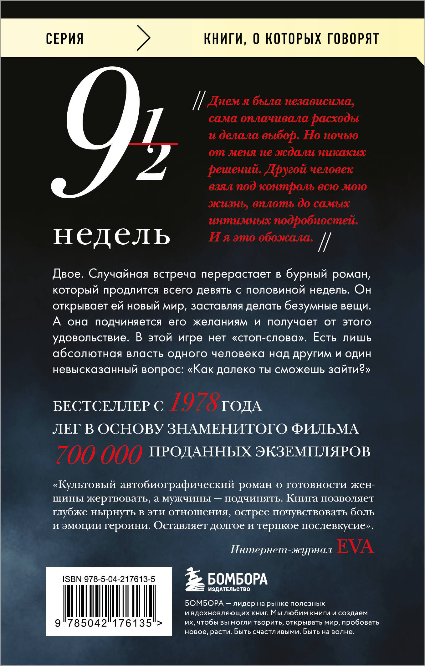 «Днем я была независима, сама оплачивала расходы и делала выбор. Но ночью от меня не ждали никаких решений. Другой человек взял под контроль всю мою жизнь, вплоть до самых интимных подробностей. И я это обожала». РЕЗОНАНСНЫЙ БЕСТСЕЛЛЕР ТЕПЕРЬ В КАРМАННОМ ФОРМАТЕ. Двое. Случайная встреча перерастает в бурный роман, который продлится всего девять с половиной недель. Он открывает ей новый мир, заставляя делать безумные вещи. А она подчиняется его желаниям и получает от этого удовольствие. В этой игре нет «стоп-слова». Есть лишь абсолютная власть одного человека над другим и один невысказанный вопрос: «Как далеко ты сможешь зайти?» БЕСТСЕЛЛЕР С 1978 года. ЛЕГ В ОСНОВУ ЗНАМЕНИТОГО ФИЛЬМА. 700 000 ПРОДАННЫХ ЭКЗЕМПЛЯРОВ. «Культовый автобиографический роман о готовности женщины жертвовать, а мужчины - подчинять. Книга позволяет глубже нырнуть в эти отношения, острее почувствовать боль и эмоции героини. Оставляет долгое и терпкое послевкусие». - Интернет-журнал EVA| Издательство | ООО "Издательство "Эксмо" |