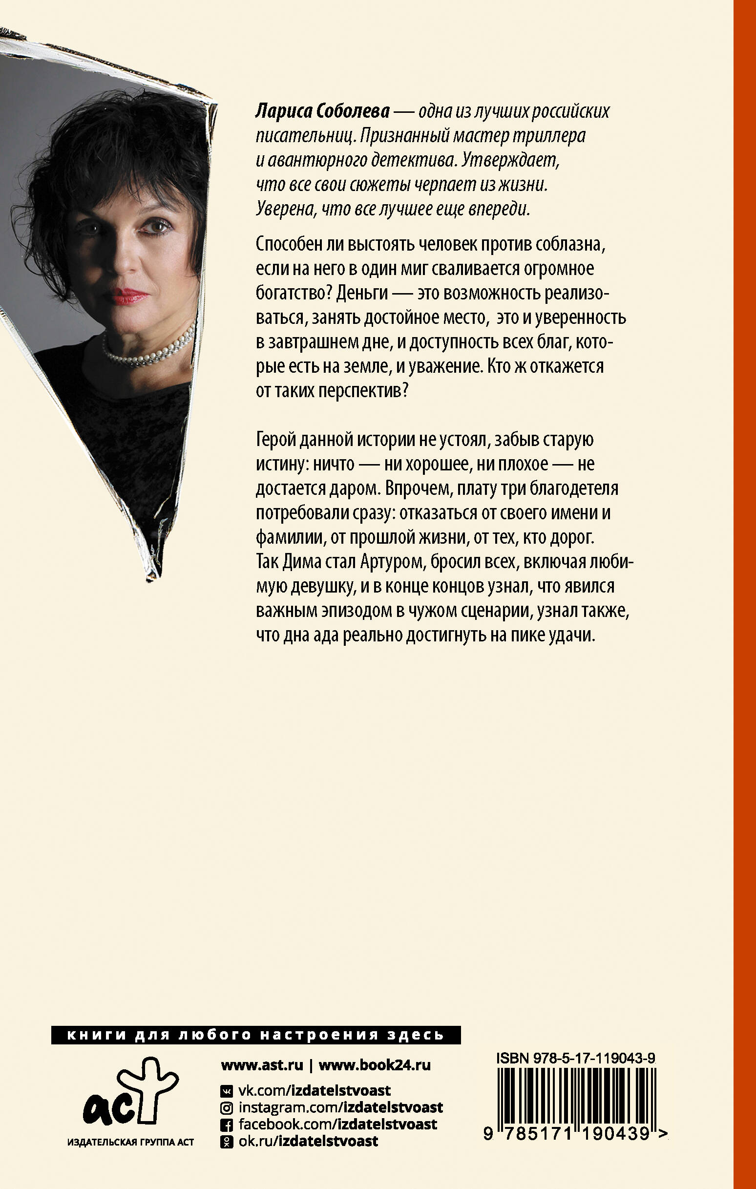 Способен ли выстоять человек против соблазна, если на него в один миг сваливается огромное богатство? Деньги - это возможность реализоваться, занять достойное место, это и уверенность в завтрашнем дне, и доступность всех благ, которые есть на земле, и уважение. Кто ж откажется от таких перспектив? Герой данной истории не устоял, забыв старую истину: ничто - ни хорошее, ни плохое - не достается даром. Впрочем, плату три благодетеля потребовали сразу: отказаться от своего имени и фамилии, от прошлой жизни, от тех, кто дорог. Так Дима стал Артуром, бросил всех, включая любимую девушку, и в конце концов узнал, что явился важным эпизодом в чужом сценарии, узнал также, что дна ада реально достигнуть на пике удачи.| Издательство | Издательство "АСТ" |