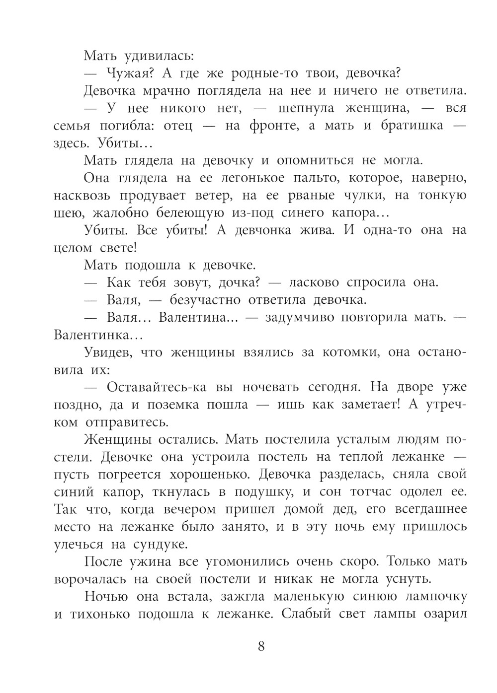 Пожалела ее хозяйка, оставила жить у себя: «У меня было трое ребят - ну, будет четверо. Авось проживем!» Так попала Валентинка в новую семью. Легко ли ей будет привыкнуть к новым людям? Примут ли ее сельские ребятишки в свой дружный круг? Научится ли она, городская, быть помощницей в трудном деревенском быту, ставшем еще суровее в условиях войны? Трогательная повесть о девочке, написанная известной детской писательницей Любовью Воронковой (1906-1976) в 1943 году, и по сей день остается одной из лучший книг о Великой Отечественной войне, обращенной детям. Для среднего школьного возраста.