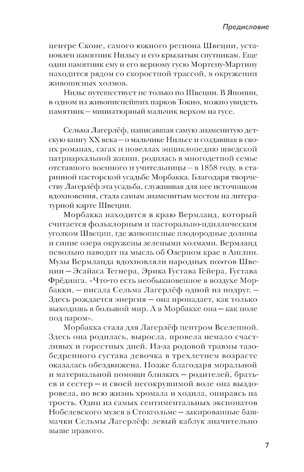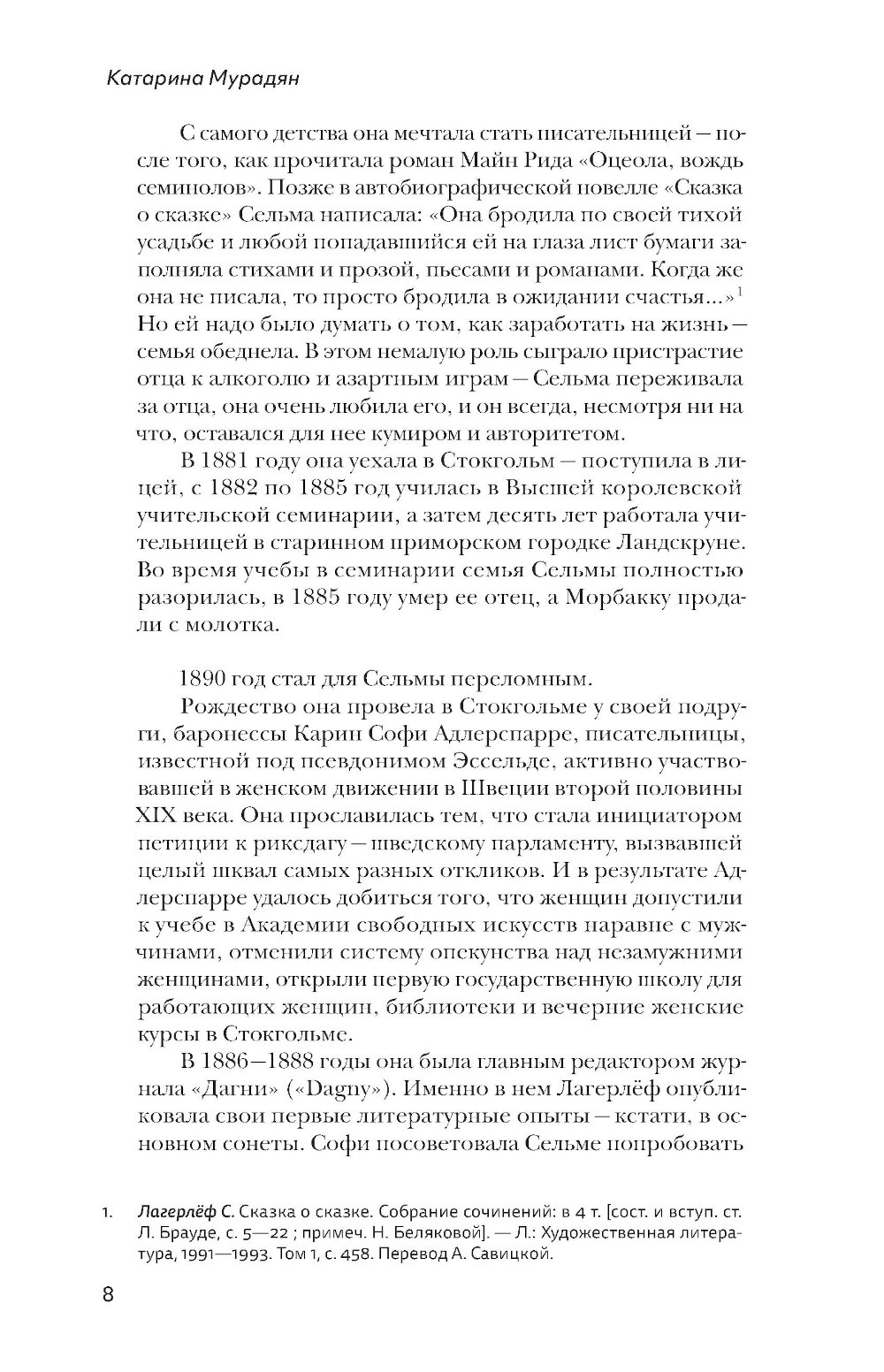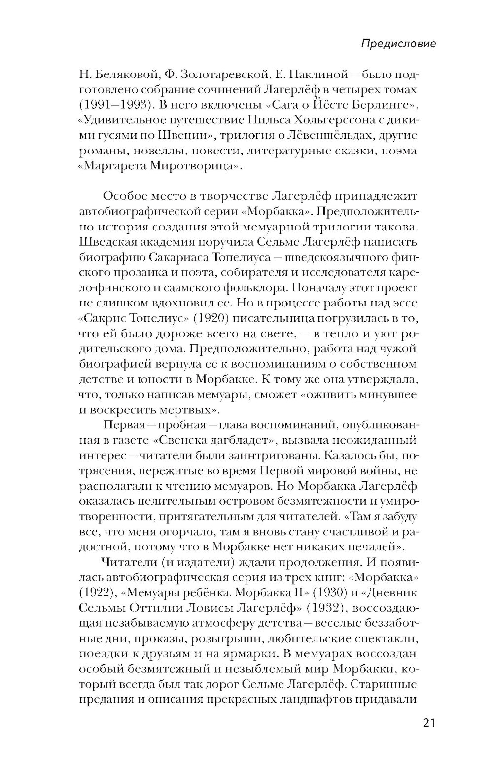 Сельма Оттилия Ловиса Лагерлёф (1858-1940) - шведская писательница, автор «Удивительного путешествия Нильса Хольгерссона с дикими гусями» и «Саги о Йёсте Берлинге», первая женщина, получившая Нобелевскую премию по литературе и избранная членом Шведской академии. Сельма Лагерлёф родилась и выросла в Вермланде, в старинной усадьбе Морбакка, в одном из самых живописных уголков Швеции. Здесь она провела немало счастливых и горестных дней: само по себе детство в окружении любимых и любящих родных - безмятежная пора, однако несколько лет юная Сельма была прикована к постели, а потом хромала. Именно здесь в семилетнем возрасте она решила, что обязательно станет писательницей. Позже умер ее отец, усадьба была продана за долги, но Сельма на всю жизнь осталась предана родному дому и краю. Получив Нобелевскую премию, она выкупила Морбакку, где продолжала жить и работать - до самой смерти. «Записки ребёнка» (1930) и «Дневник Сельмы Оттилии Ловисы Лагерлёф» (1932), вошедшие в эту книгу, - две части мемуарной трилогии, которая была начата повестью «Морбакка» (1922). В своих воспоминаниях Лагерлёф воссоздает атмосферу детства и особый мир Морбакки, который всегда был ей так дорог. Старинные предания вносят неповторимый колорит в повествование, которое соткано из добрых, трогательных и веселых историй, посвященных маленьким-большим событиям в жизни умной девочки 10-14 лет. В этих тонких наблюдениях кроется удивительная сила духа и редкое свойство замечать хорошее и интересное в самых незначительных событиях, оставаться жизнелюбивой и свободной. Морбакка - исток литературного дара Лагерлёф, ее личный «золотой век».| Издательство | Иллюминатор |