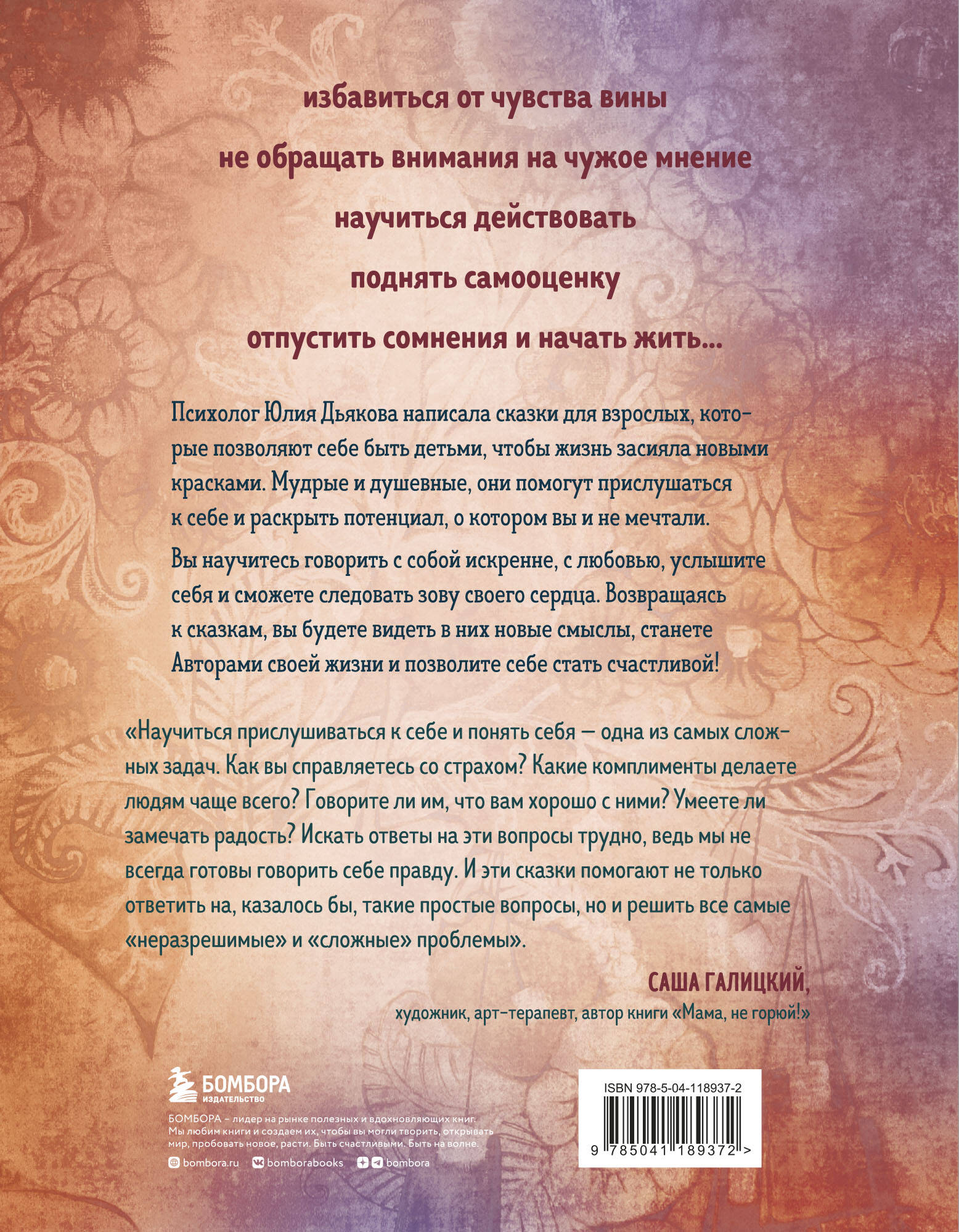 Разрывать шаблоны. Позволить себе мечтать. Радоваться жизни. Избавиться от чувства вины. Подмечать счастье в мелочах. Оставаться ребенком. Не откладывать жизнь на потом! Всем нам иногда необходимо решаться на перемены, чтобы осуществить свои желания и мечты. Юлия Дьякова (@avtor.live) написала сказки для взрослых, которые позволяют себе быть детьми, чтобы жизнь засияла новыми красками. Мудрые и душевные, они помогут прислушаться к себе и раскрыть потенциал, о котором вы и не мечтали. Эта книга поможет увидеть себя и стать Авторами своей жизни. Возвращаясь к сказкам, вы будете видеть в них новые смыслы. Взрослея, научитесь открывать и создавать новые миры. По образованию Юлия - тренер и психолог, а по призванию - та, кто превращает сказки в реальность. Сама себя автор называет «инициатором переходов» - той, кто способна поддержать решившихся изменить свою жизнь и помочь им создать свою уникальную историю. К сказкам даны практические задания - они помогут не только проработать внутреннее «я», но и ответить на многие вопросы, которые давно не дают вам покоя. Внутри подарочного издания иллюстрации известной художницы Анны Силивончик. Окутать теплом вас смогут не только сказки внутри, но и приятная бархатная обложка. ОТЗЫВЫ: «Научиться прислушиваться к себе и понять себя - одна из самых сложных задач. Как вы справляетесь со страхом? Какие комплименты делаете людям чаще всего? Говорите ли им, что вам хорошо с ними? Умеете ли замечать радость? Искать ответы на эти вопросы трудно, ведь мы не всегда готовы говорить себе правду. И эти сказки помогают не только ответить на, казалось бы, такие простые вопросы, но и решить все самые "неразрешимые" и "сложные" проблемы». - Саша Галицкий, художник, арт-терапевт, автор книги «Мама, не горюй!» «Душевные сказки Юлии Дьяковой читаются на одном дыхании и содержат в себе много золотых ключиков, открывающих как внезапно захлопнувшиеся, так и неизведанные двери в жизнь, полную смыслов и радости. Я думаю, что эта прекрасная, лишенная назидательности, очаровательная книжка будет очень полезна как тем, кто самостоятельно ищет свой путь, так и опытным коучерам и психологам». - Хана Шнайдман, психолог «Каждому иногда бывает нужно пообщаться с собой. И Юлия Дьякова с удовольствием дает читателям такую возможность. Сказки и сами по себе наводят на размышления, да еще к каждой из них автор добавляет письменные задания. Если обдумать все истории и ответить на все вопросы, получится еще одна книга - ваша собственная». - Ирина Мальцева, психолог «"Когда смотришь на все глазами любви, мир становится волшебным…" Именно этот посыл зримо или подспудно ощущается во всех сказках автора - сказках о жизненных ситуациях, в которых в той или иной мере оказывается каждый человек. И если дать вдумчиво анализировать сюжеты прочитанного, можно почерпнуть много полезного для себя, хоть это и просто сказки, пусть и для взрослых. Сказочнице свободно и непринужденно даются как яркие, образные сравнения и метафоры, так и глубокий анализ внутреннего мира и состояния души героев, безграничное сопереживание и любовь к ним. Феи и Принцессы, Русалки и Скрепки дарят нам надежду на всеобщий, всеобъемлющий, часто выстраданный happy end, и никакие Желтые Маркеры не в силах помешать этому... После прочитанных страниц, написанных невероятно изящно, остается неж