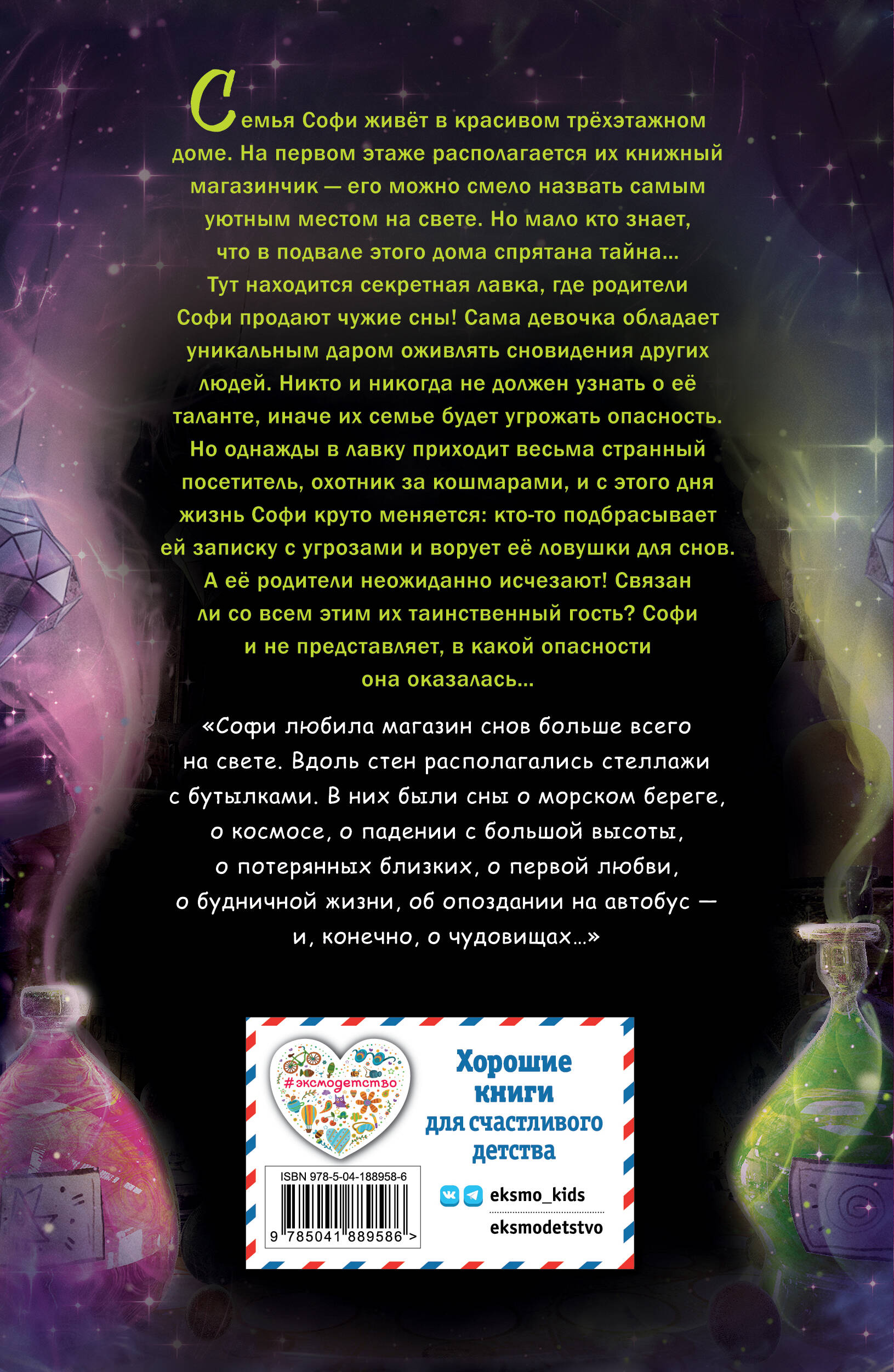 Семья Софи живёт в красивом трёхэтажном доме, на первом этаже которого располагается уютный книжный магазинчик. Но мало кто знает, что в подвале этого дома спрятана тайна… Тут находится секретная лавка, где родители Софи продают чужие сны! Однажды в лавку приходит весьма странный посетитель, охотник за кошмарами, и с этого дня жизнь Софи переворачивается с ног на голову. Кто-то подбрасывает ей записку с угрозами, а её родители… неожиданно исчезают! Связан ли с этим их таинственный гость? Софи и не представляет, в какой опасности она оказалась…| Издательство | ООО "Издательство "Эксмо" |