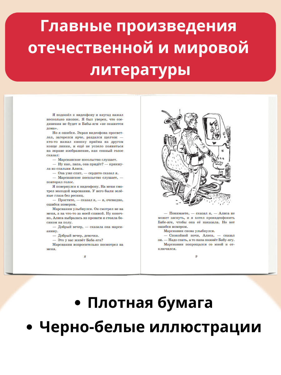 В серии «Детская библиотека» представлены лучшие произведения отечественной и мировой литературы для детей от 5 до 16 лет. Это фольклор и литературные сказки, стихи, рассказы и повести выдающихся писателей-классиков. Все произведения входят в образовательные программы по литературе и рекомендованы Министерством просвещения РФ для изучения в школе и самостоятельного чтения. У Алисы Селезнёвой ни дня без приключений - ведь её папа самый настоящий профессор космозоологии! Спасти бронтозаврёнка в Московском космозоопарке, случайно обнаружить следы таинственной цивилизации Тутексов на Марсе, помочь японскому профессору вернуть своё тело. Любознательная, умная и смелая Алиса на этом не останавливается! Ведь ей предстоит разгадать важнейшую загадку планеты Колеида, отправившись в прошлое в качестве временщика… В сборник вошли «Девочка, с которой ничего не случится» и «День рождения Алисы». Иллюстрации Евгения Мигунова.| Издательство | Эксмо |