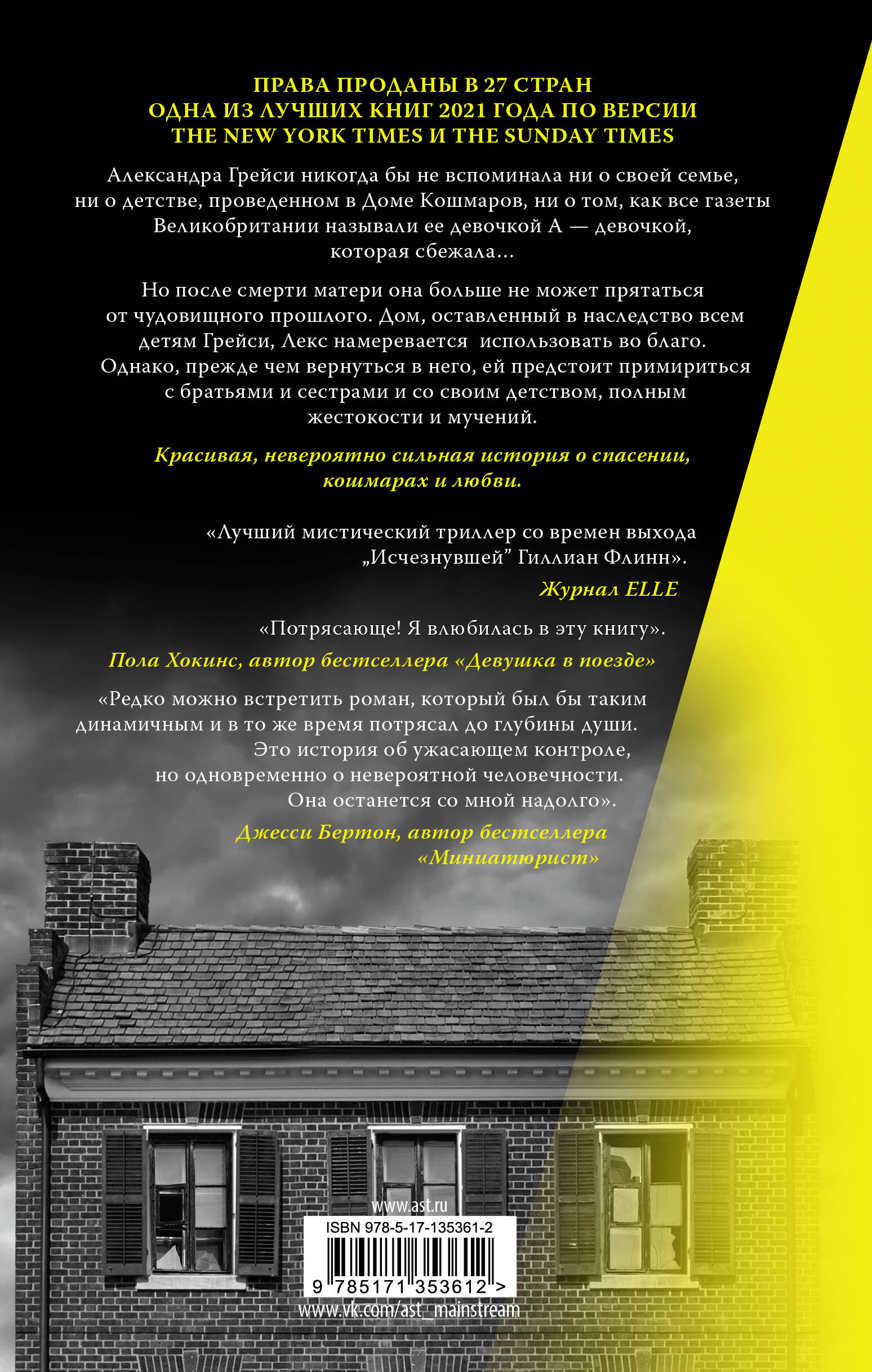 ELLE называют эту книгу лучшим триллером со времен «Исчезнувшей» Гиллиан Флинн. Критики New York Times включают ее в список самых ярких романов 2021 года. 27 стран приобрели права на ее издание. Это история Александры Грейси - девушки А, «той, которая сбежала». Выжила в темной комнате, где окна были наглухо закрыты картонками. Выжила голодая. Выжила, прикованная цепями к собственной постели. Выжила, сумев превратить в веселую игру даже унижения - удивительная способность, дарованная только детям. Но так же ужасно это звучит в контексте истории. Читайте книгу «Девушка А» - пронзительный и сильный роман о насилии родителей над собственными детьми и о невероятной воле этих детей к жизни.| Издательство | ИЗДАТЕЛЬСТВО "АСТ" |