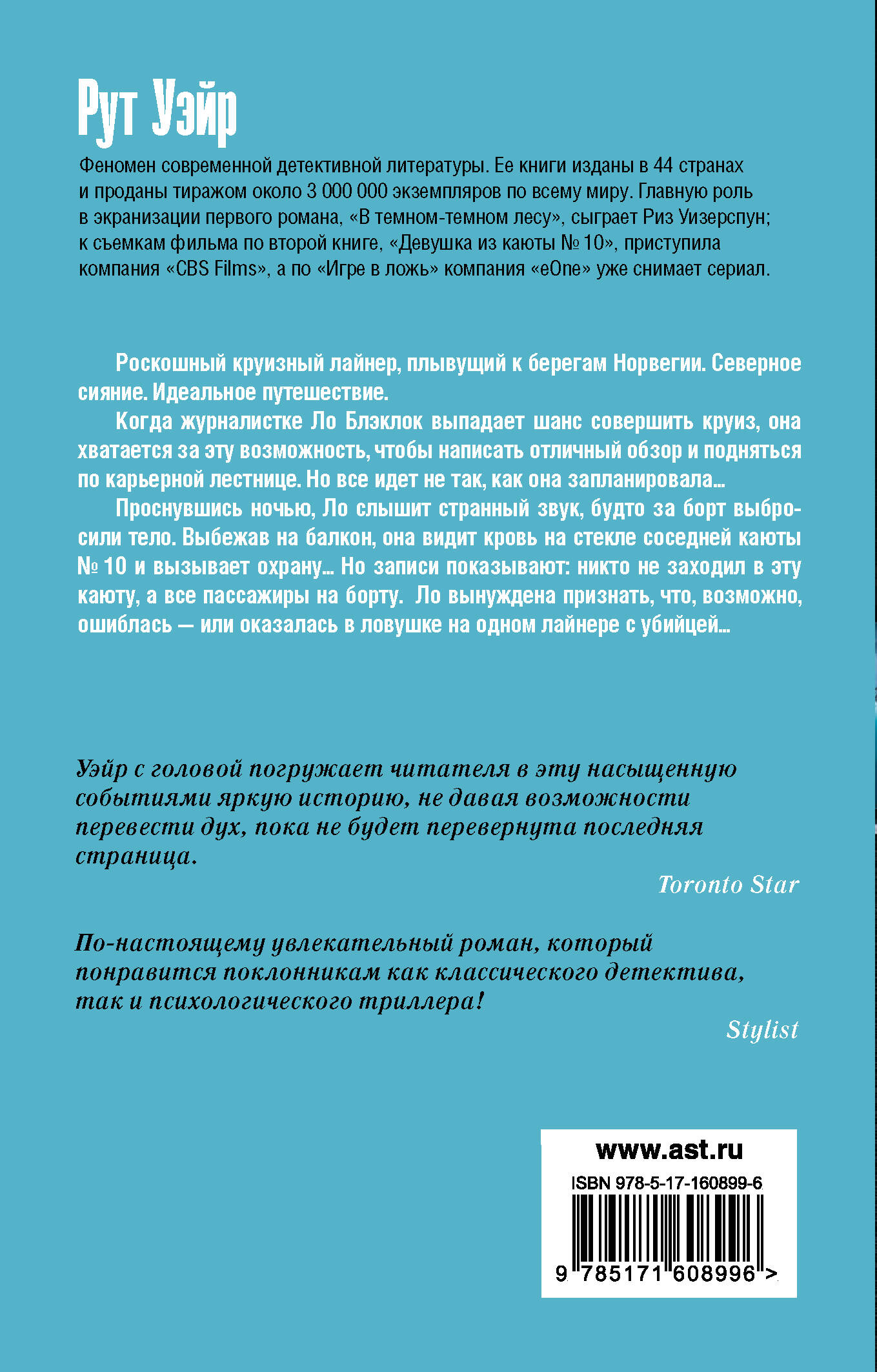 Роскошный круизный лайнер, плывущий к берегам Норвегии. Северное сияние. Идеальное путешествие. Когда журналистке Ло Блэклок выпадает шанс совершить круиз, она хватается за эту возможность, чтобы написать отличный обзор и подняться по карьерной лестнице. Но все идет не так, как она запланировала… Проснувшись ночью, Ло слышит странный звук, будто за борт выбросили тело. Выбежав на балкон, она видит кровь на стекле соседней каюты № 10 и вызывает охрану... Но записи показывают: никто не заходил в эту каюту, а все пассажиры на борту. Ло вынуждена признать, что, возможно, ошиблась - или оказалась в ловушке на одном лайнере с убийцей...| Издательство | Издательство "АСТ" |