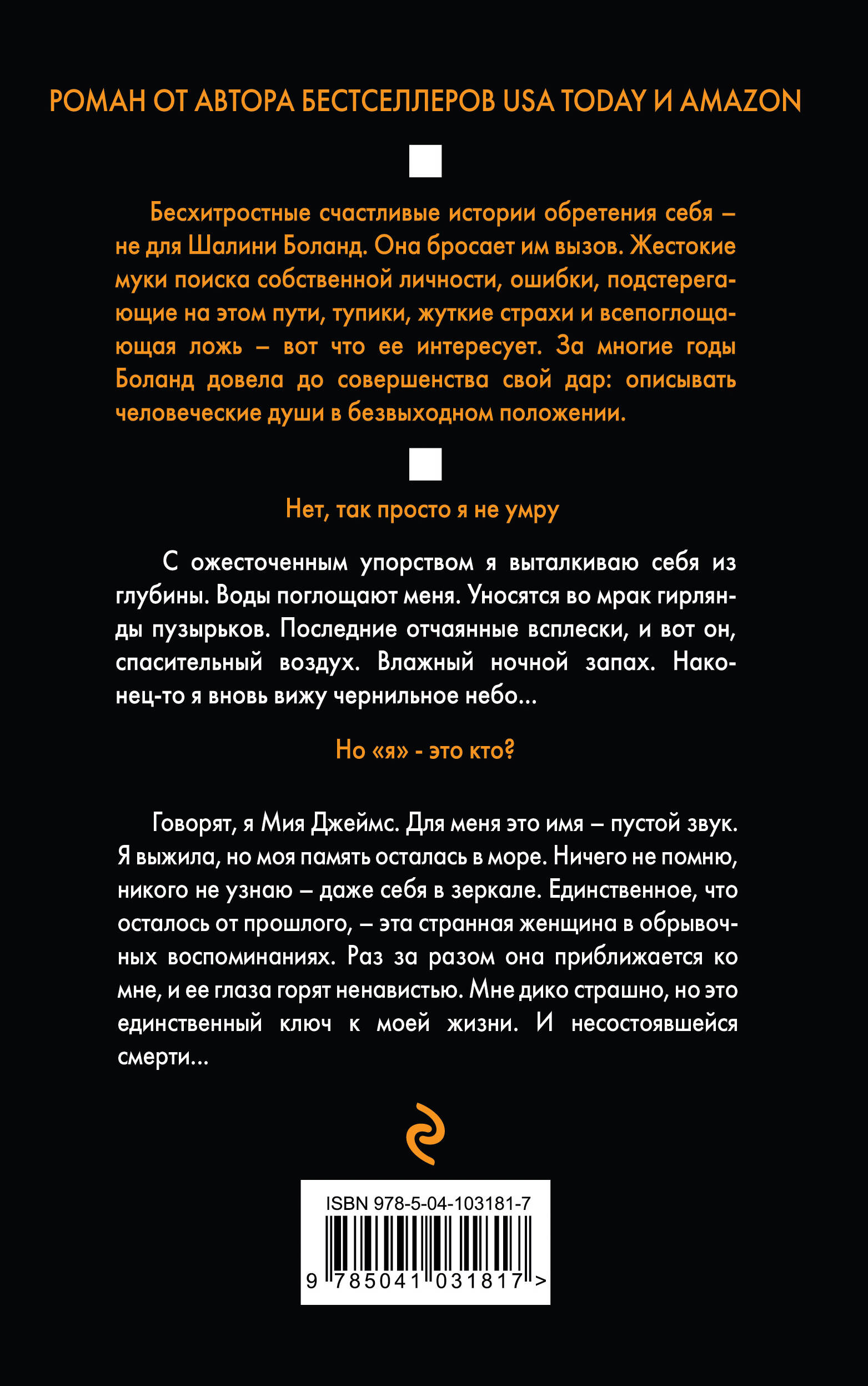 Бесхитростные счастливые истории обретения себя - не для Шалини Боланд. Она бросает им вызов. Жестокие муки поиска собственной личности, ошибки, подстерегающие на этом пути, тупики, жуткие страхи и всепоглощающая ложь - вот что ее интересует. За многие годы Боланд довела до совершенства свой дар: описывать человеческие души в безвыходном положении. Нет, так просто я не умру. С ожесточенным упорством я выталкиваю себя из глубины. Воды поглощают меня. Уносятся во мрак гирлянды пузырьков. Последние отчаянные всплески, и вот он, спасительный воздух. Влажный ночной запах. Наконец-то я вновь вижу чернильное небо… Но «я» - это кто? Говорят, я Мия Джеймс. Для меня это имя - пустой звук. Я выжила, но моя память осталась в море. Ничего не помню, никого не узнаю - даже себя в зеркале. Единственное, что осталось от прошлого - эта странная женщина в обрывочных воспоминаниях. Раз за разом она приближается ко мне, и ее глаза горят ненавистью. Мне дико страшно, но это единственный ключ к моей жизни. И несостоявшейся смерти…| Издательство | ООО "Издательство "Эксмо" |