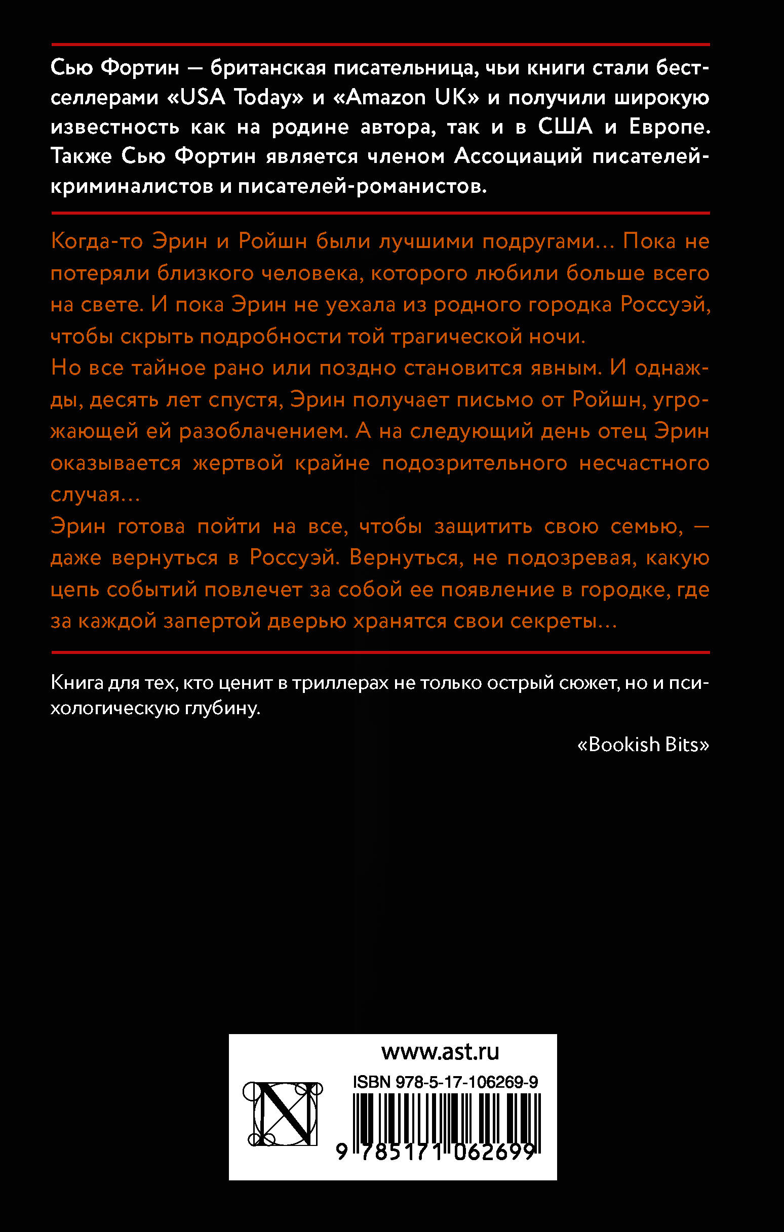 Когда-то Эрин и Ройшн были лучшими подругами… Пока не потеряли близкого человека, которого любили больше всего на свете. И пока Эрин не уехала из родного городка Россуэй, чтобы скрыть подробности той трагической ночи. Но все тайное рано или поздно становится явным. И однажды, десять лет спустя, Эрин получает письмо от Ройшн, угрожающей ей разоблачением. А на следующий день отец Эрин оказывается жертвой крайне подозрительного несчастного случая… Эрин готова пойти на все, чтобы защитить свою семью, - даже вернуться в Россуэй. Вернуться, не подозревая, какую цепь событий повлечет за собой ее появление в городке, где за каждой запертой дверью хранятся свои секреты…| Издательство | ИЗДАТЕЛЬСТВО "АСТ" |