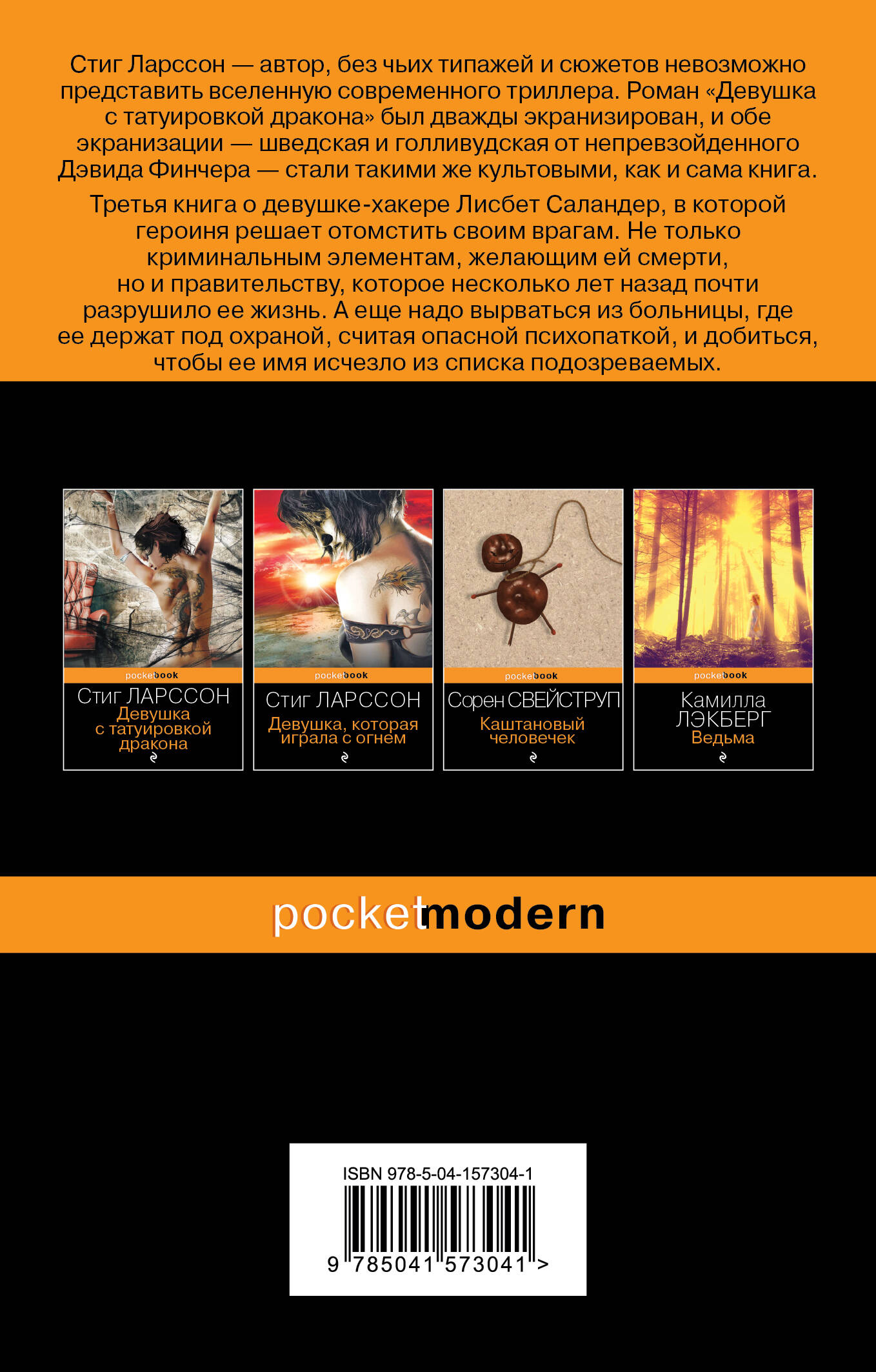 МИРОВОЙ МЕГАБЕСТСЕЛЛЕР. ТРЕТЬЯ КНИГА ИЗ КУЛЬТОВОЙ ТРИЛОГИИ «МИЛЛЕНИУМ» О ДЕВУШКЕ-ХАКЕРЕ ЛИСБЕТ САЛАНДЕР. Стиг Ларссон - автор, без чьих типажей и сюжетов невозможно представить вселенную современного триллера. Продажи его книг по всему миру перевалили за 100 000 000 экземпляров. Роман «Девушка с татуировкой дракона» был дважды экранизирован, и обе экранизации - шведская и голливудская от непревзойденного Дэвида Финчера - стали такими же культовыми, как и сама книга. Как и вся трилогия «Миллениум», раз и навсегда изменившая законы остросюжетной литературы. Лисбет Саландер решает отомстить своим врагам. Не только криминальным элементам, желающим ей смерти, но и правительству, которое несколько лет назад почти разрушило ее жизнь. А еще надо вырваться из больницы, где ее держат под охраной, считая опасной психопаткой, и добиться, чтобы ее имя исчезло из списка подозреваемых в убийстве. Поэтому ей не обойтись без помощи журналиста Микаэля Блумквиста. Только его разоблачительная статья может встряхнуть шведское общество до самых основ и переполошить правительство и спецслужбы. Тогда у Лисбет будет шанс расстаться с прошлым и добиться справедливости. «Роман Ларссона как удар молнии - сложный, умный, увлекательный... И именно потому трилогия "Миллениум" справедливо считается издательским феноменом во всем мире». - The Guardian «Не иначе как какая-то таинственная алхимия помогла Ларссону из крайне сомнительного образа сотворить одного из самых убедительных и притягательных героев современной литературы. Можно лишь гадать, что подумали бы о ней Шерлок Холмс и мисс Марпл, но Лисбет Саландер пополнила собой ряды истинно бессмертных сыщиков». - Daily Telegraph «Огромное удовольствие доставляет наблюдение за приключениями Лисбет Саландер, чей образ невероятно сложен и психологически достоверен. Это и Лара Крофт для взрослых, и Терминатор в юбке». - The Guardian «Саландер - великолепное создание: подлинный ангел мщения. И мы не знаем другого современного писателя, который так успешно избегал бы нравоучительности в динамичном повествовании». - Observer