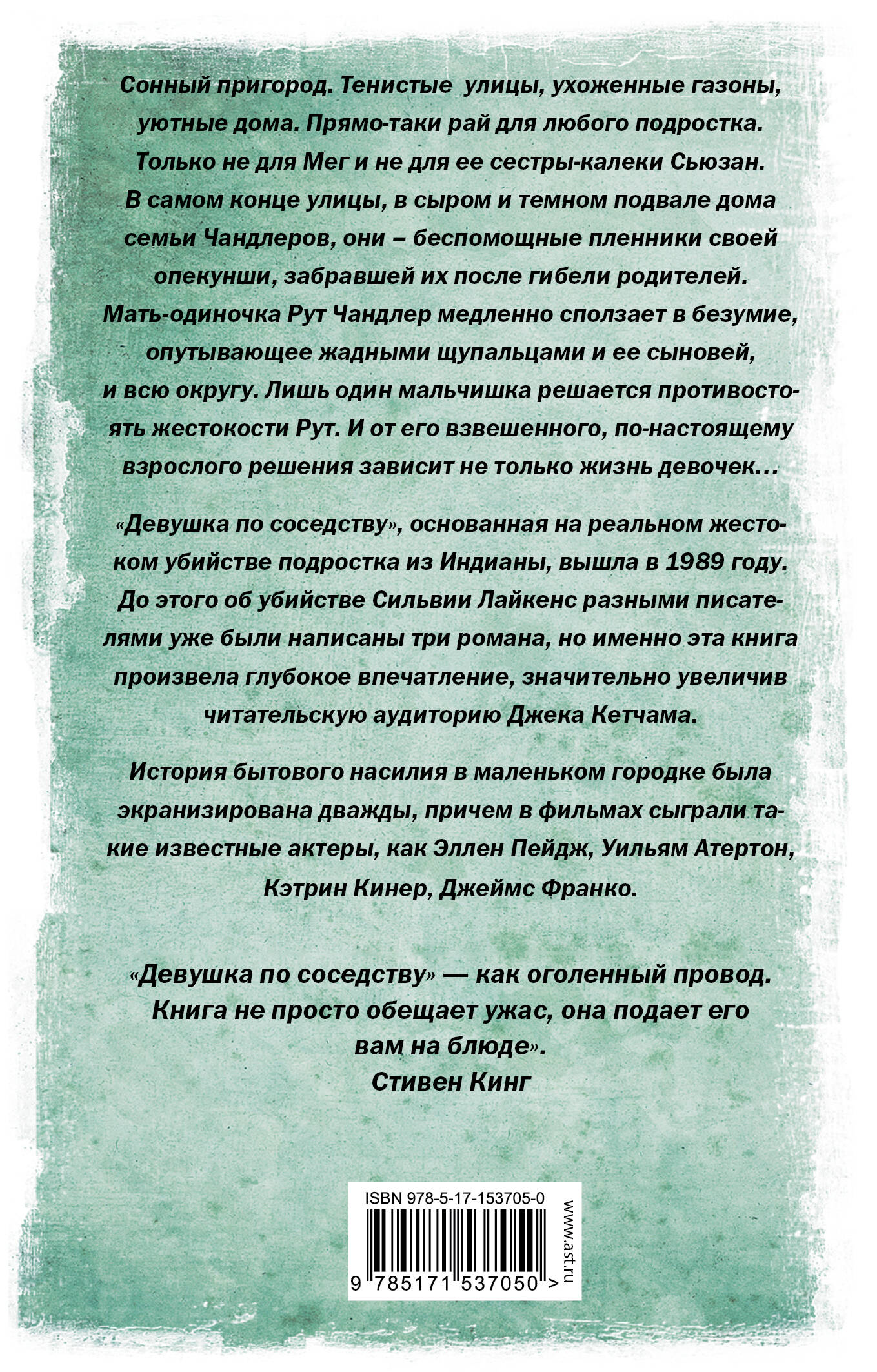 Сонный пригород. Тенистые улицы, ухоженные газоны, уютные дома. Прямо-таки рай для любого подростка. Только не для Мег и не для ее сестры-калеки Сьюзан. В самом конце улицы, в сыром и темном подвале семьи Чандлеров они - беспомощные пленники своей опекунши, забравшей их после гибели родителей. Мать-одиночка, Рут Чандлер медленно сползает в безумие, опутывающее жадными щупальцами и ее сыновей, и всю округу. Лишь один мальчишка решается противостоять жестокости Рут. И от его взвешенного, по-настоящему взрослого решения зависит не только жизнь девочек… "Девушка по соседству", основанная на реальном жестоком убийстве подростка из Индианы, вышла в 1989 году. До этого об убийстве Сильвии Лайкенс разными писателями уже было написано 3 романа, но именно эта книга произвела глубокое впечатление, значительно увеличив читательскую аудиторию Джека Кетчама. История бытового насилия в маленьком городке была экранизирована дважды, причем в фильмах сыграли такие известные актеры, как Эллен Пейдж, Уильям Атертон, Кэтрин Кинер, Джеймс Франко.