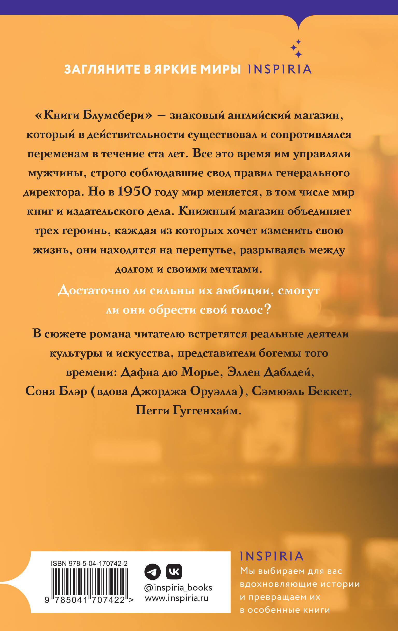 Встречайте новинку от автора книги «Общество Джейн Остен»! «Книги Блумсбери» - знаковый английский магазин, который в действительности существовал и сопротивлялся переменам в течение ста лет. Все это время им управляли мужчины, строго соблюдавшие свод правил генерального директора. Но в 1950 году мир меняется, в том числе мир книг и издательского дела. Книжный магазин объединяет трех героинь, каждая из которых хочет изменить свою жизнь, они находятся на перепутье, разрываясь между долгом и своими мечтами. Достаточно ли сильны их амбиции, смогут ли они обрести свой голос? В сюжете романа читателю встретятся реальные культурные и литературные деятели, представители богемы того времени: Дафна Дю Морье, Эллен Даблдей, Соня Блэр (вдова Джорджа Оруэлла), Сэмюэль Беккет, Пегги Гуггенхайм. Если вы хотите погрузиться в мир литературной жизни 1950-х или представить себя героем фильма «Полночь в Париже», эта книга для вас!| Издательство | ООО "Издательство "Эксмо" |