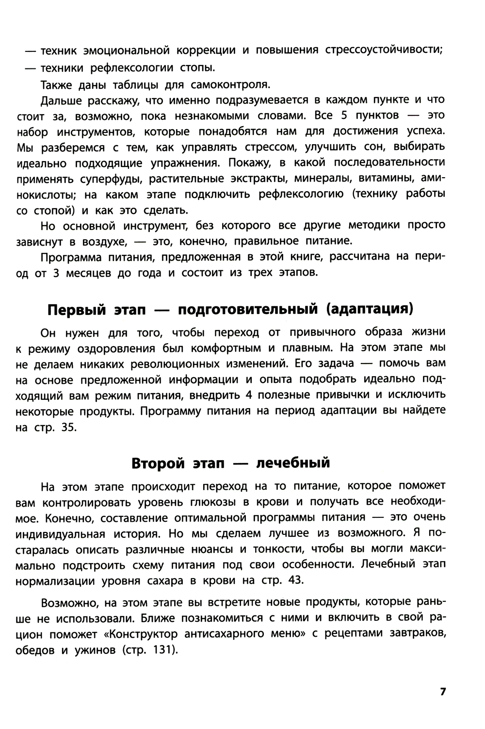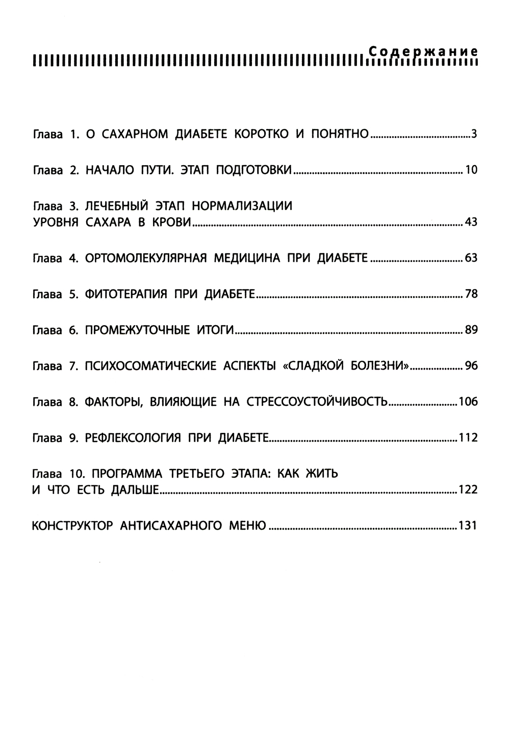 Прочитав книгу, вы сможете подойти к проблеме диабета с разных сторон. Вы найдете в ней множество рецептов, схемы с четкими критериями выбора фитокомпонентов и нутрицевтиков по удобным таблицам, "Конструктор антисахарного меню", в котором представлены 35 вариантов завтраков, обедов и ужинов; рассмотрите психологические аспекты заболевания и освоите техники рефлексологии - целительного воздействия на стопу.