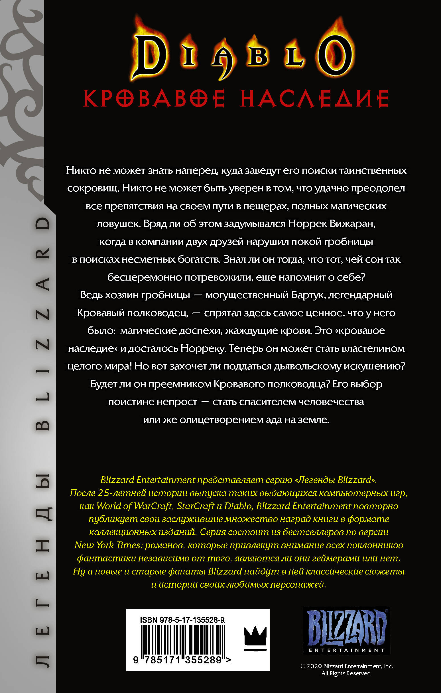 - По мотивам популярной игры Diablo от Blizzard Entertainment! - От автора бестселлеров №1 по версии The New York Times! - Книга полностью передает атмосферу игр серии Diablo. Ощутите священный ужас древних сил и встаньте на путь истинных героев! Команда отважных героев отправляется на поиски сокровищ. Во главе - Норрек Вижаран. Древняя гробница выглядит лакомым источником наживы, и вскрывая ее, команда и не предполагала, что это может стать началом опасной миссии. Норрек потревожил Кровавого Полководца - могущественного Бартука. В гробнице были спрятаны его кровавые доспехи. Тот, кто наденет их будет обладать силой, способной сокрушить весь мир. И теперь Норрек может стать олицетворением ада на земле, если поддастся искушению.| Издательство | ИЗДАТЕЛЬСТВО "АСТ" |