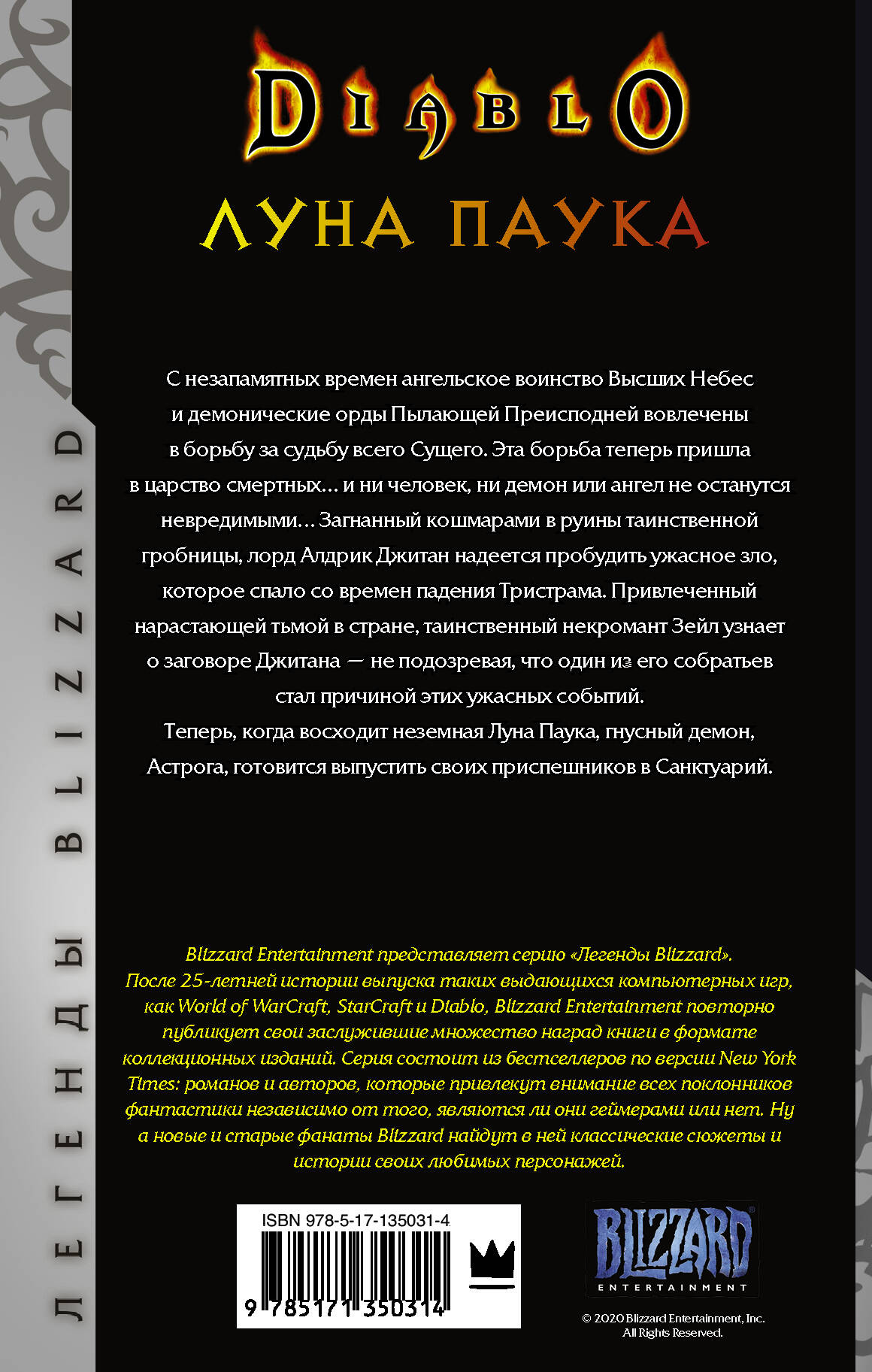 C незапамятных времён ангельское воинство Высших Небес и демонические орды Пылающей Преисподней были вовлечены в борьбу за судьбу всего Сущего. Эта борьба теперь пришла в царство смертных... и ни человек, ни демон или ангел не останутся невредимыми... Загнанный кошмарами в руины таинственной гробницы, лорд Алдрик Джитан надеется пробудить ужасное зло, которое спало со времён падения Тристрама. Привлечённый нарастающей тьмой в стране, таинственный некромант Зейл натыкается на заговор Джитана - не подозревая, что один из его собратьев стал причиной этих ужасных событий. Теперь, когда восходит неземная Луна Паука, гнусный демон, Астрога, готовится выпустить своих приспешников в Санктуарий.| Издательство | Издательство "АСТ" |