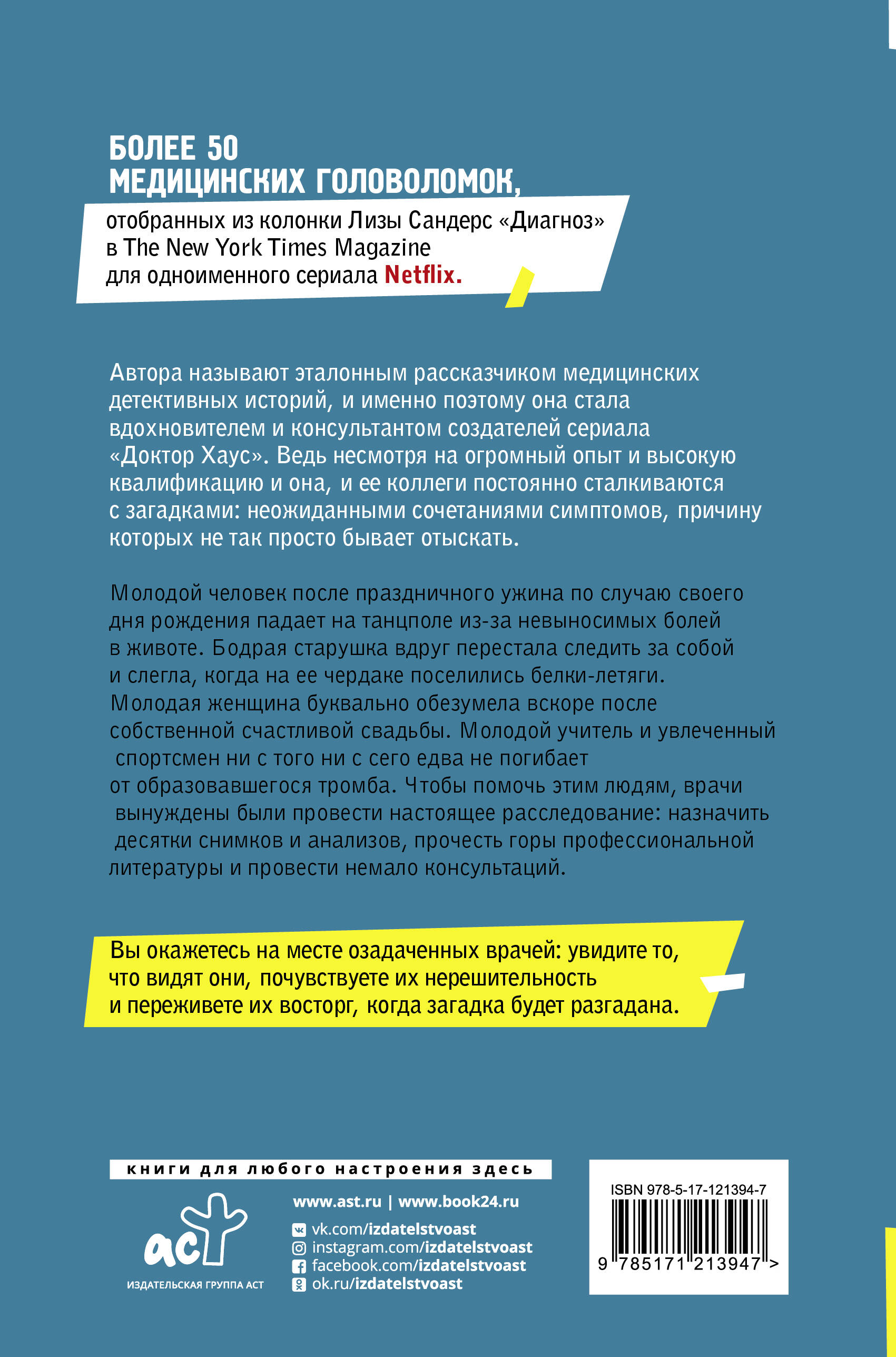 Более 50 медицинских головоломок, отобранных из колонки Лизы Сандерс "Диагноз" в The New York Times Magazine для одноименного сериала Fox TV. Автора называют эталонным рассказчиком медицинских детективных историй, и именно поэтому она стала вдохновителем и консультантом создателей сериала "Доктор Хаус". Ведь несмотря на огромный опыт и высокую квалификацию и она, и ее коллеги постоянно сталкиваются с загадками: неожиданными сочетаниями симптомов, причину которых не так просто бывает отыскать. Молодой человек после праздничного ужина по случаю своего дня рождения падает на танцполе из-за невыносимых болей в животе. Бодрая старушка вдруг перестала следить за собой и слегла, когда на ее чердаке поселились белки-летяги. Молодая женщина буквально обезумела вскоре после собственной счастливой свадьбы. Молодой учитель и увлеченный спортсмен ни с того ни с сего едва не погибает от образовавшегося тромба. Чтобы помочь этим людям, врачи вынуждены были провести настоящее расследование: назначить десятки снимков и анализов, прочесть горы профессиональной литературы и провести немало консультаций. Вы окажетесь на месте озадаченных врачей: увидите то, что видят они, почувствуете их нерешительность и переживете их восторг, когда загадка будет разгадана.| Издательство | ИЗДАТЕЛЬСТВО "АСТ" |