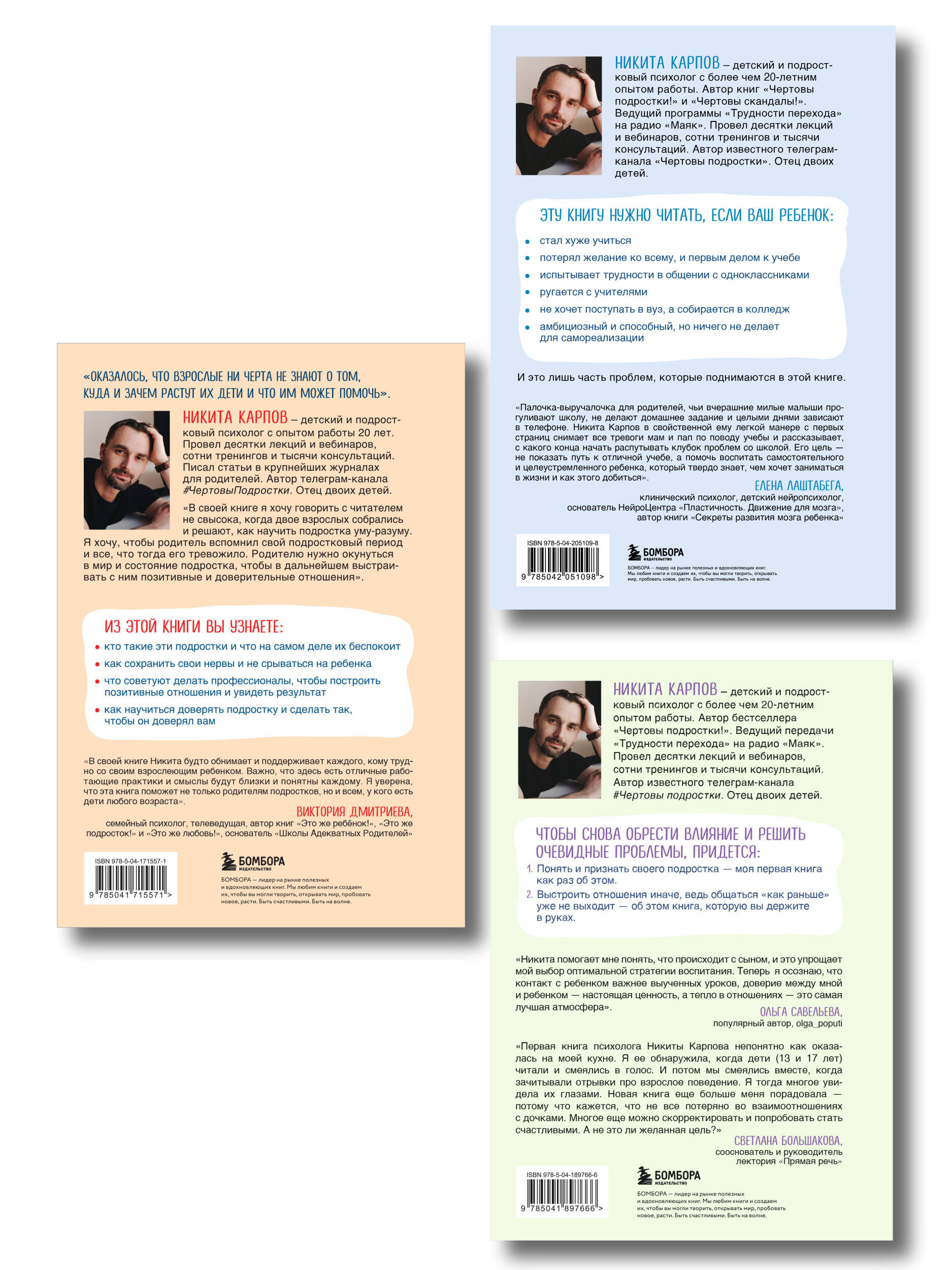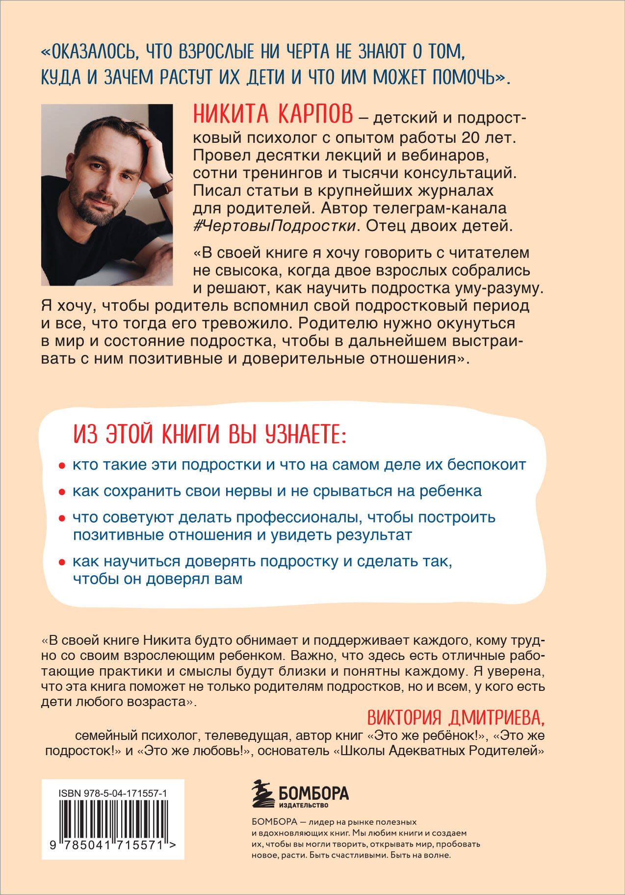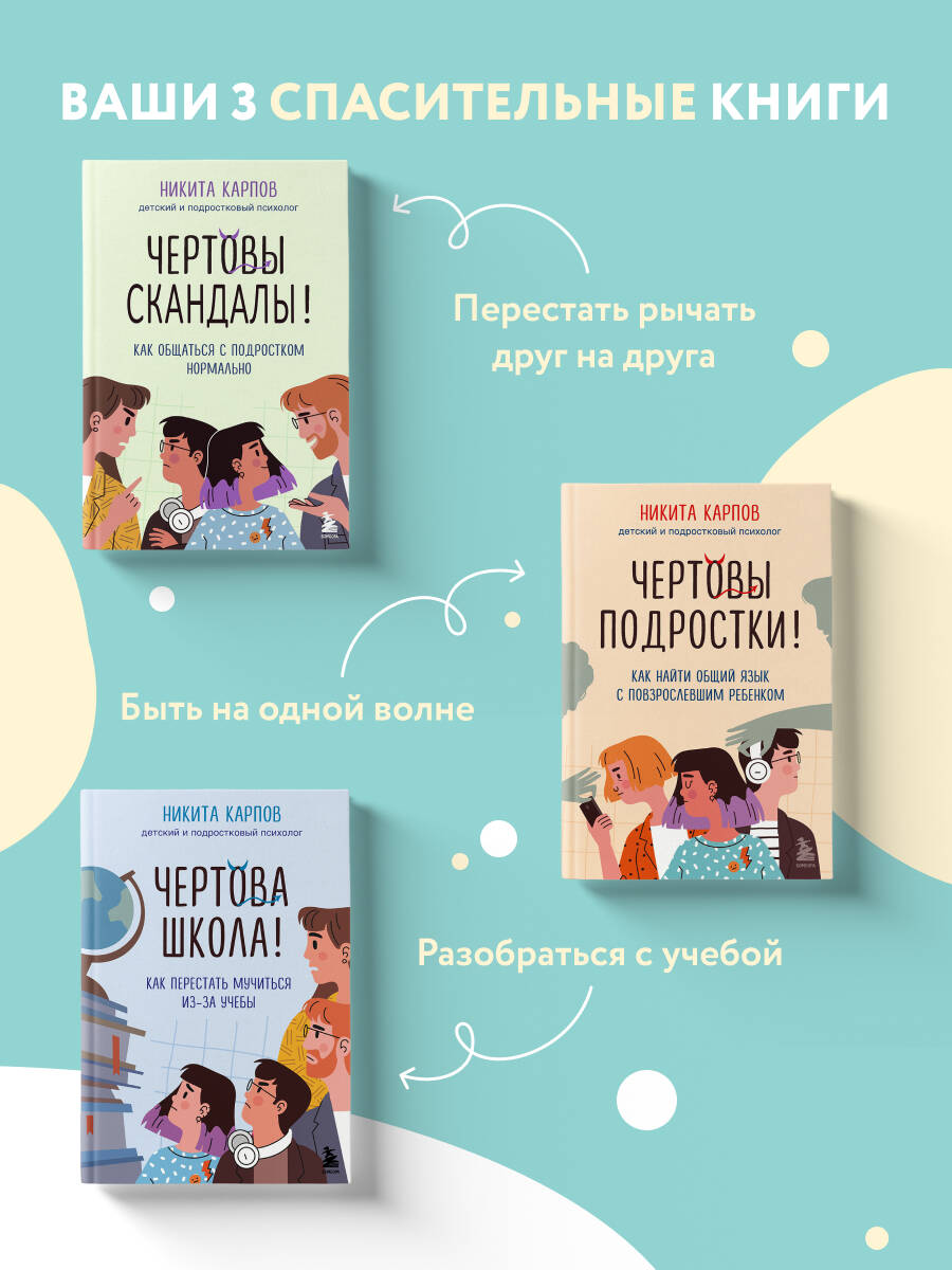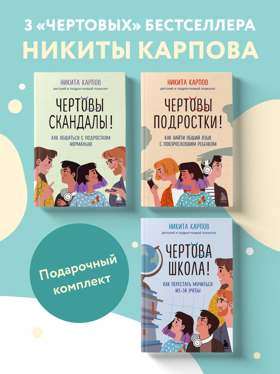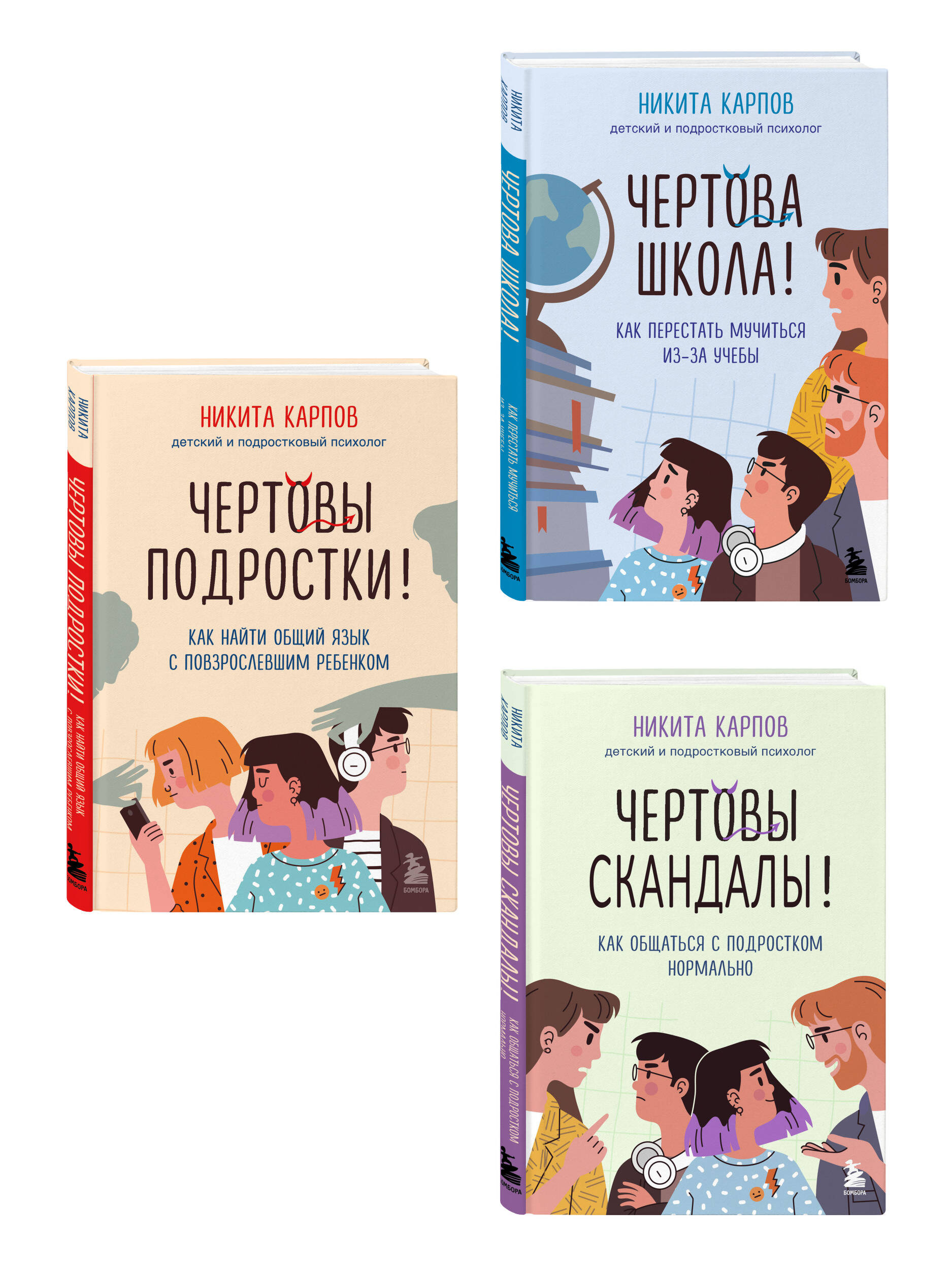КОМПЛЕКТ ИЗ 3-Х КНИГ. «Чертовы подростки! Как найти общий язык с повзрослевшим ребенком» Детский и подростковый психолог Никита Карпов знает о взрослении все. 20 лет он помогает подросткам и родителям найти общей язык и решает их проблемы. В легкой форме, с долей юмора, Никита Карпов рассказывает о реальных кейсах, профессиональных техниках и методиках, которые спасут ваши нервы, наладят крепкие доверительные отношения и помогут воспитать самостоятельного человека. Он раскроет глаза, что на самом деле пубертат - очень интересный период, от которого можно получать удовольствие и родителям, и подросткам. «Чертовы скандалы! Как общаться с подростком нормально» В своей второй книге подростковый психолог Никита Карпов обращает особое внимание на налаживание отношений и разрешение конфликтов между родителями и подростками. Маме и папе трудно принять, что их ребенок взрослеет и от этого меняется не только его поведение и приоритеты, но и стиль общения, появляется потребность в собственных границах, желание бросить вызов правилам. В своем уже полюбившемся читателям и подписчикам легком стиле, с долей юмора и при этом на полном серьезе, Никита Карпов предлагает эффективную стратегию общения, которая поможет наладить контакт даже с самым бунтарским подростком. «Чертова школа! Как перестать мучиться из-за учебы» Самая популярная проблема, с которой родители приходят в кабинет подросткового психолога, - «Мой ребенок плохо учится». В своей третьей книге известный психолог Никита Карпов предлагает раз и навсегда покончить с неуспеваемостью подростка, его хамством и инертностью, конфликтами с одноклассниками и учителями, сомнительными и нереалистичными планами после окончания школы. Вы сможете найти решение, подходящее именно для вашей семьи, и наладить контакт с повзрослевшим ребенком. В конце книги вас ждут контрольные вопросы, которые помогут начать действовать уже сейчас.| Издательство | ООО "Издательство "Эксмо" |