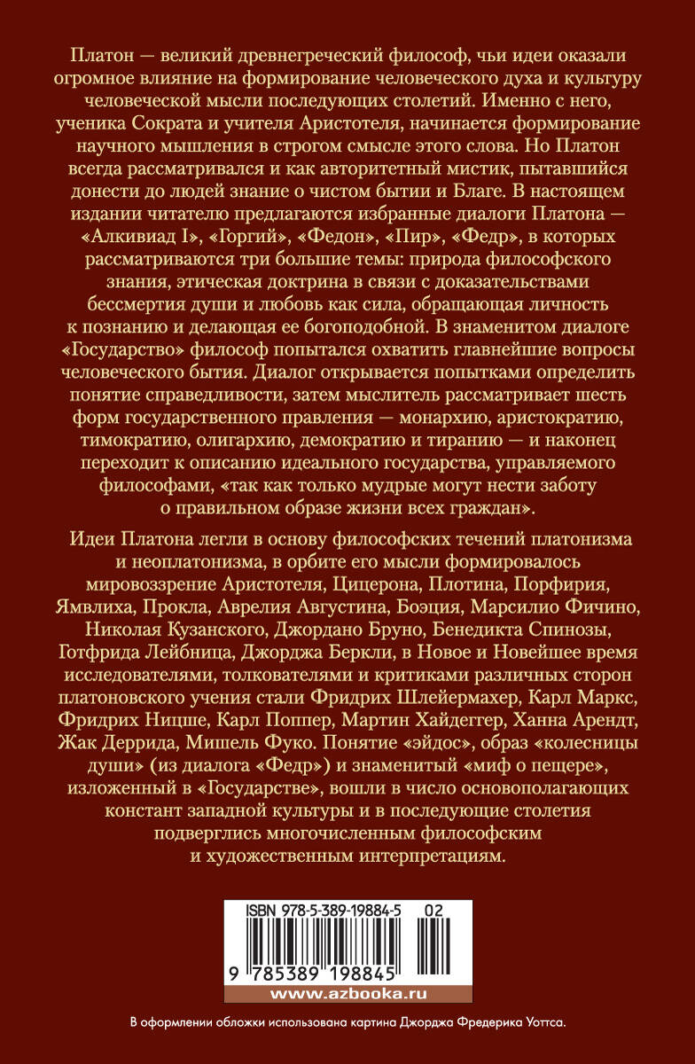 Платон - великий древнегреческий философ, чьи идеи оказали огромное влияние на формирование человеческого духа и культуру человеческой мысли последующих столетий. Именно с него, ученика Сократа и учителя Аристотеля, начинается формирование научного мышления в строгом смысле этого слова. Но Платон всегда рассматривался и как авторитетный мистик, пытавшийся донести до людей знание о чистом бытии и Благе. В настоящем издании читателю предлагаются избранные диалоги Платона - "Алкивиад I", "Горгий", "Федон", "Пир", "Федр", в которых рассматриваются три большие темы: природа философского знания, этическая доктрина в связи с доказательствами бессмертия души и любовь как сила, обращающая личность к познанию и делающая ее богоподобной. В знаменитом диалоге "Государство" философ попытался охватить главнейшие вопросы человеческого бытия. Диалог открывается попытками определить понятие справедливости, затем мыслитель рассматривает шесть форм государственного правления - монархию, аристократию, тимократию, олигархию, демократию и тиранию - и наконец переходит к описанию идеального государства, управляемого философами, "так как только мудрые могут нести заботу о правильном образе жизни всех граждан".| Издательство | Азбука-Аттикус Издат.группа ООО |