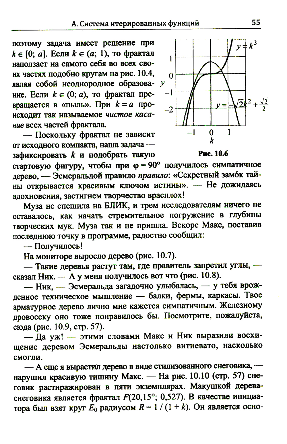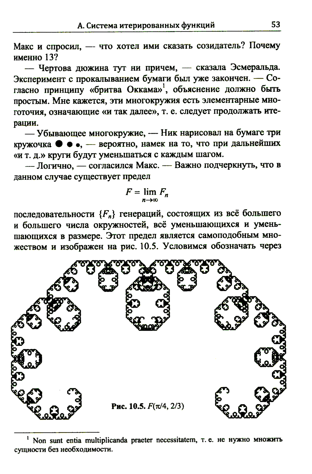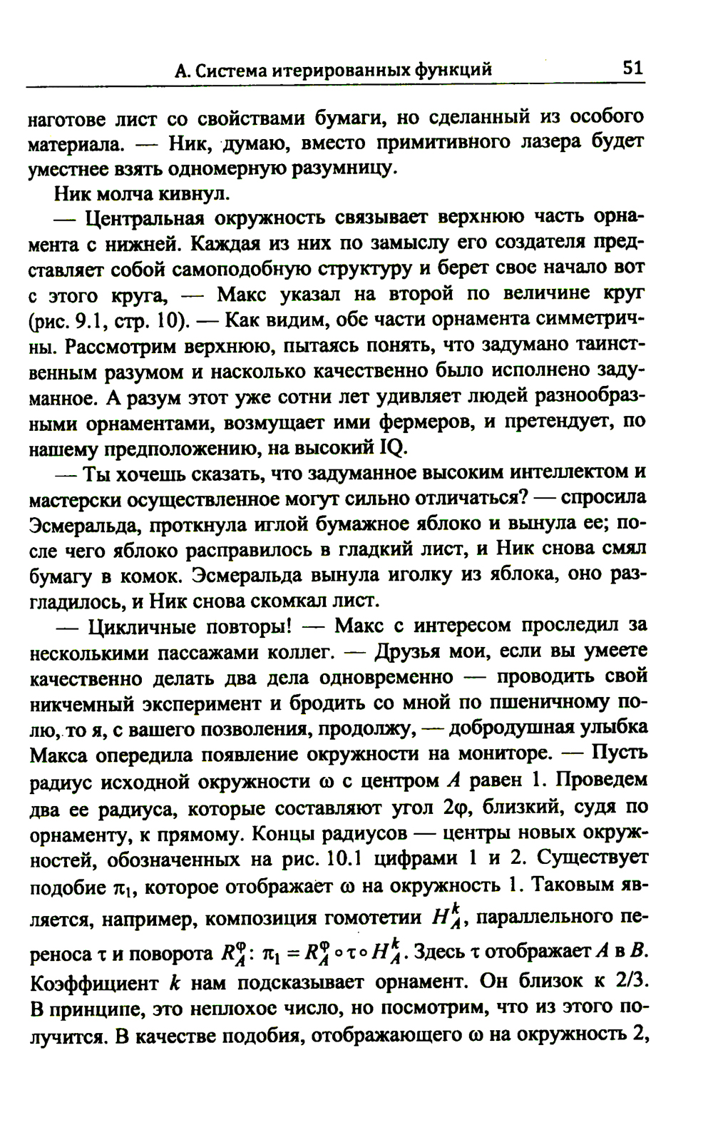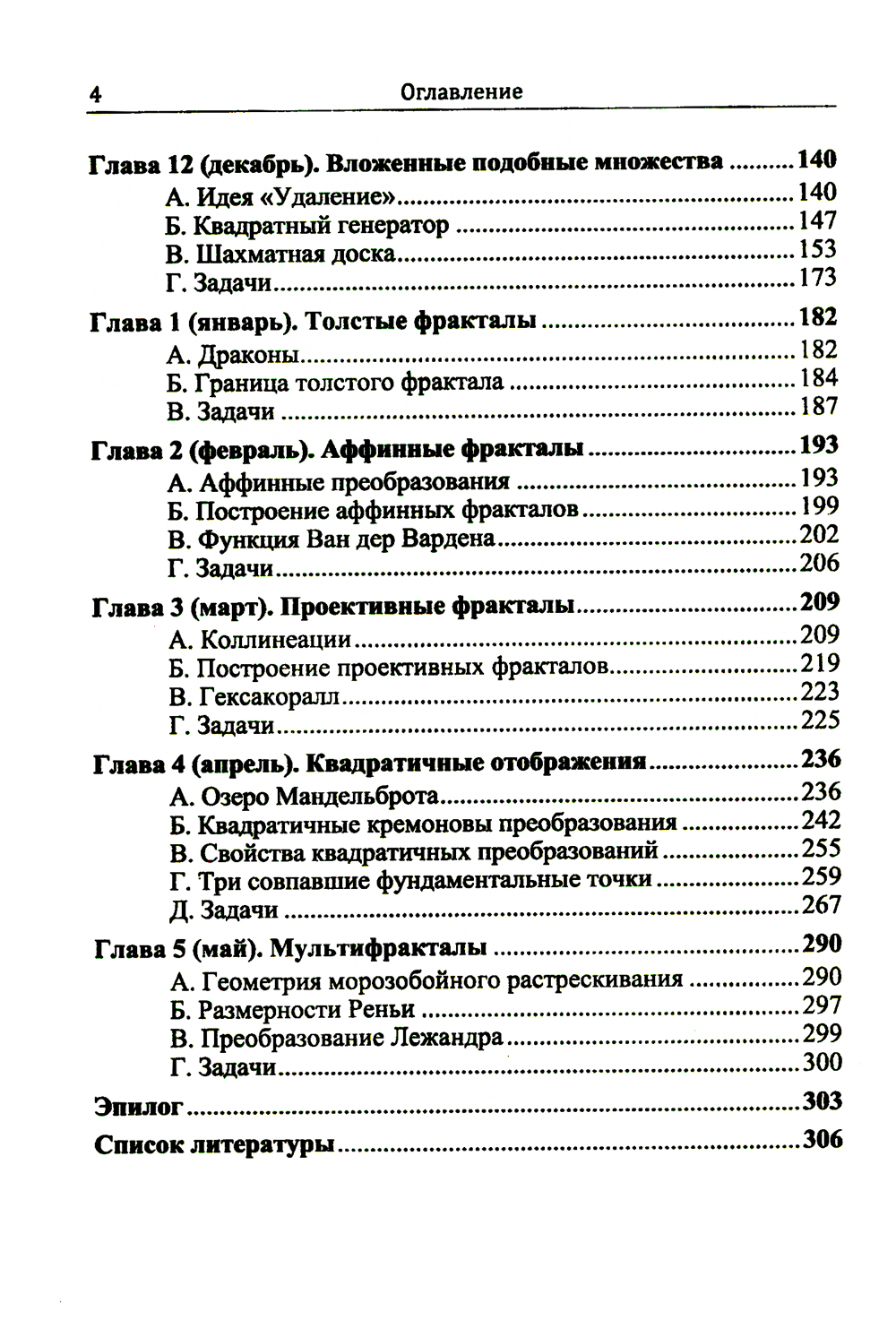 Настоящую книгу в какой-то мерс можно отнести к блестящему, хотя и своеобразному, образцу жанра «фэнтези». Три персонажа - вдумчивый Макс, креативный Ник и зеленоглазая Эсмеральда - не без иронии обсуждают глубокие идеи фрактальной геометрии, знакомя читателя с математическими джунглями, состоящими из самоподобных растений чарующей красоты. Изложение материала в форме беседы позволяет автору сказать просто о сложном, популярно о научном, ясно о туманном. В книге исследуются элементы фрактальной геометрии: понятия фрактала и мультифрактала; размерности Хаусдорфа-Бсзиковича, Минковского, Реньи; построение фракталов как аттракторов системы итерированных подобий, аффинных, проективных и квадратичных кремоновых преобразований, а также как образов булевых функций; свойства и методы исследования фрактальных структур. Рассматриваются также приложения в инженерной практике. Материал книги состоит из девяти глав, начиная с главы 9 (сентябрь) и заканчивая главой 5 (май), что позволяет читателю проводить параллель с учебным годом. Текст дополнен многочисленными (более 600!) иллюстрациями, завораживающими своей красотой и уникальностью. Эта удивительная книга потрясает и обширностью затрагиваемых автором тем, и великолепием оригинальных изображений, и захватывающим изложением предмета. Она, несомненно, будет полезна студентам, аспирантам, преподавателям, инженерам и всем, кто влюблен в математику.| Издательство | ЛЕНАНД |