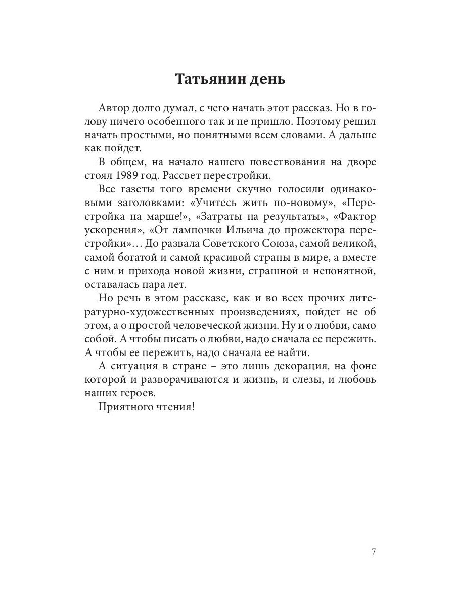 Повести «Глория» и «Татьянин день» входят в авторский цикл под общим названием «Диалоги о любви. Мужчины и женщины». Все герои этих произведений - обыкновенные люди обыкновенного возраста. Они ходят на службу, воспитывают детей, пьют водку, поют песни, пишут картины, сочиняют музыку, ухаживают за престарелыми родителями. Влюбляются, женятся и расходятся. Они работают журналистами и медсестрами, архитекторами и заводскими инженерами.| Издательство | Т8 RUGRAM |