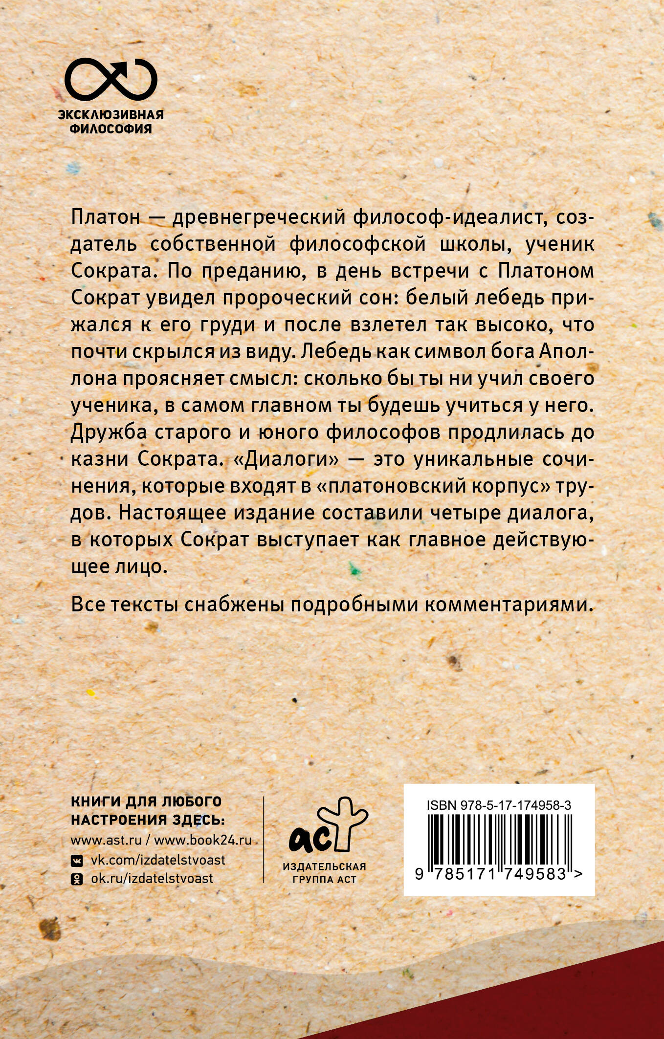 Платон (ок. 428-348 гг. до н.э.) - древнегреческий философ-идеалист, создатель собственной философской школы, ученик Сократа. По преданию, в день встречи с Платоном Сократ увидел пророческий сон: белый лебедь прижался к его груди и после взлетел так высоко, что почти скрылся из виду. Лебедь как символ бога Аполлона проясняет смысл сна: сколько бы ты ни учил своего ученика, в самом главном ты будешь учиться у него. Дружба старого и юного философов продлилась до самой казни Сократа в 399 году до н.э. "Диалоги" - это уникальные сочинения, которые входят в так называемый "платоновский корпус" трудов, дошедших до наших дней. Настоящее издание составили четыре диалога, в которых Сократ выступает как главное действующее лицо. В "Критоне" он объясняет, что нельзя совершать несправедливость не только по отношению к людям, но и по отношению к законам. В "Пире" считает, что в любви мы должны видеть не одни лишь эмоции, но и культурное начало. А в "Федре", продолжая свою мысль, говорит, что именно любовь совершенствует бессмертную душу человека и пробуждает в нем лучшие качества и стремления. В "Федоне" Сократ раскрывает свою идею о том, что нужно уважать чувство справедливости другого, не навязывая своего собственного. Все тексты снабжены подробными комментариями.| Издательство | Издательство "АСТ" |