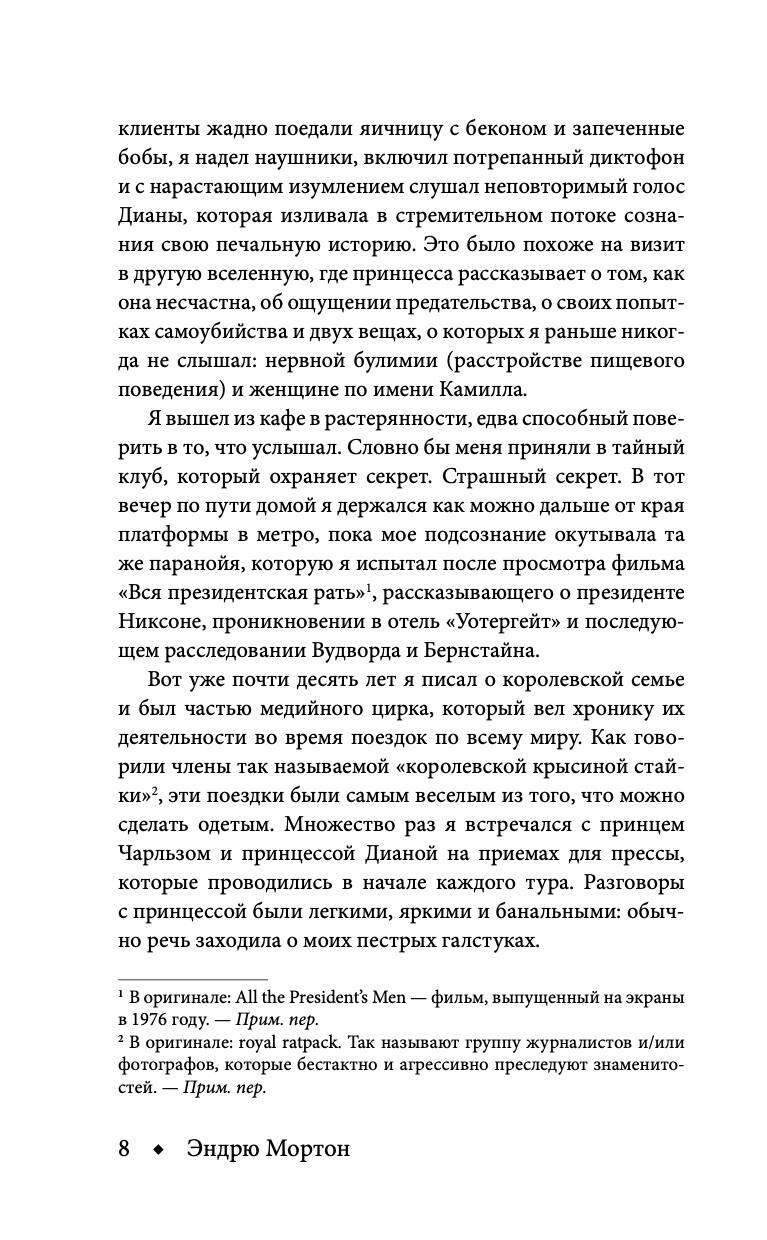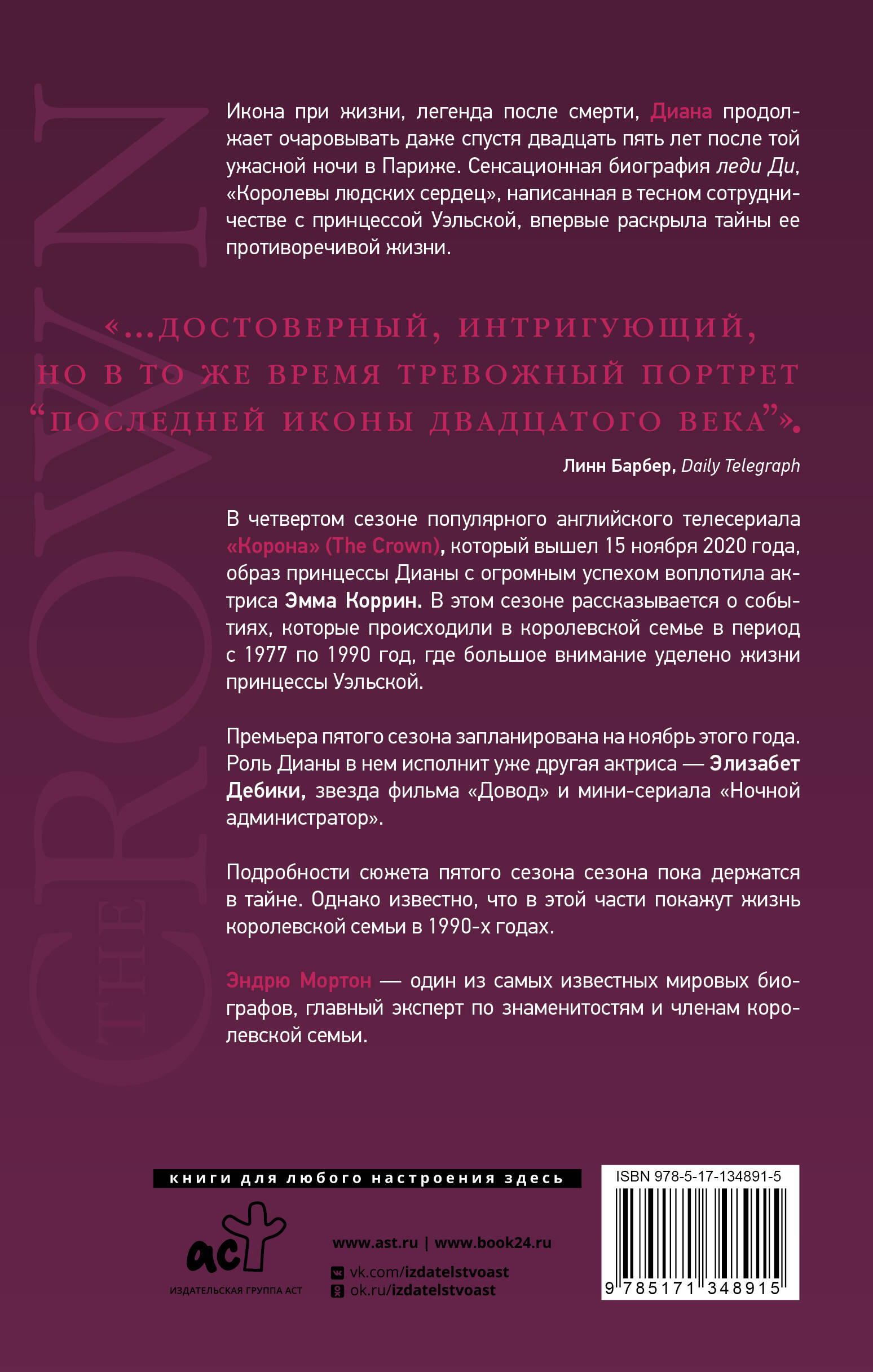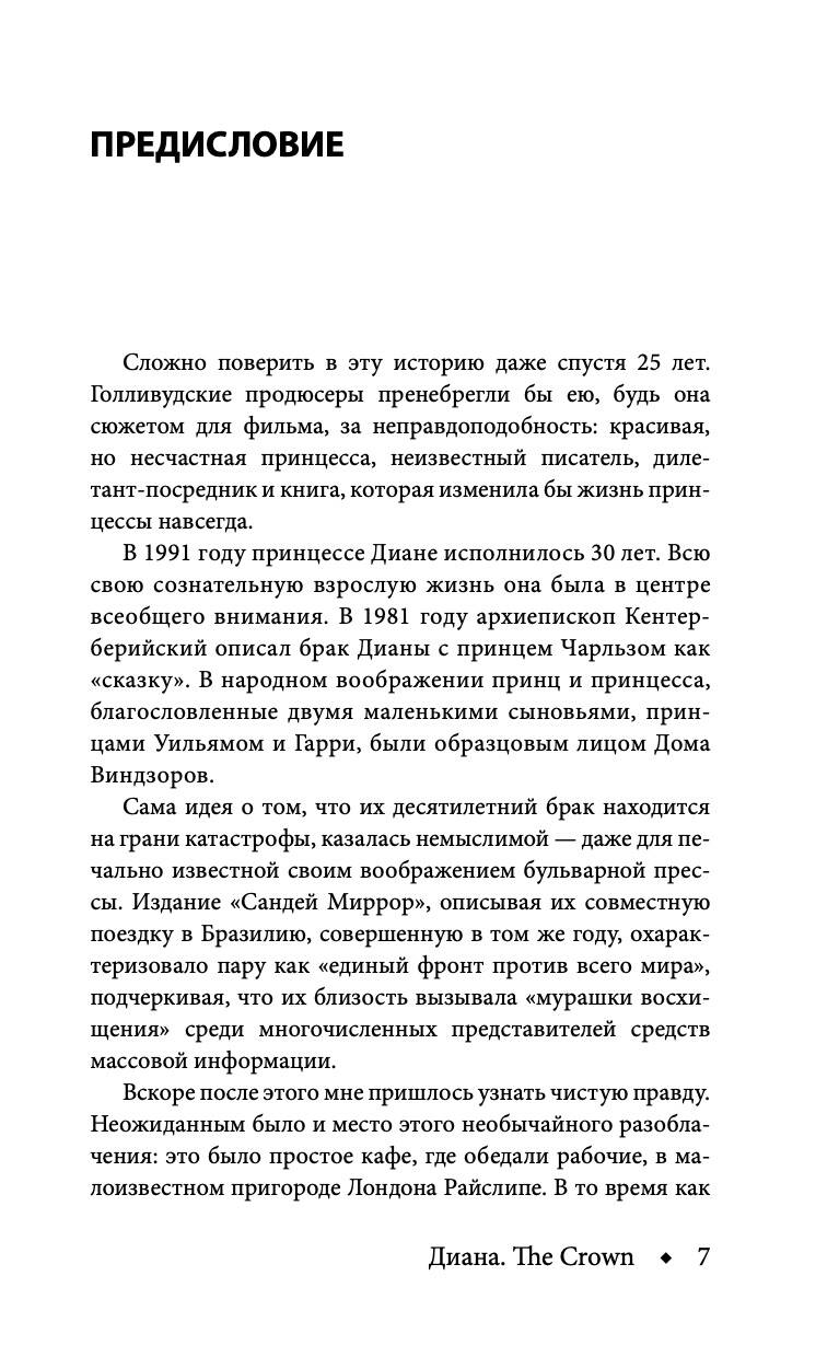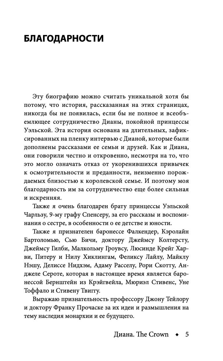 Книга «Диана. The Crown» - сенсационная биография принцессы Дианы, которая была написана при ее непосредственном участии. В издание вошли эксклюзивные материалы и факсимиле, предоставленные принцессой Уэльской автору еще при ее жизни. Эта книга стала своеобразной исповедью леди Ди, где она не смущаясь, откровенно рассказала о своем несчастливом браке, отношениях с королевской семьей, жизни в Виндзорском дворце, а также о рухнувших надеждах, постоянных страхах и нереализованных мечтах. «... достоверный, интригующий, но в то же время тревожный портрет "последней иконы XX века"» Линн Барбер, Daily Telegraph
