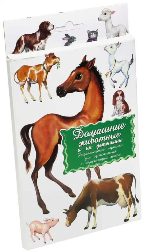 Дидактические карточки расскажут детям о различных домашних животных и их детках (собака и щенок, кошка и котенок, курица и цыплята, корова и теленок, лошадь и жеребенок, утка и утенок и др. ).