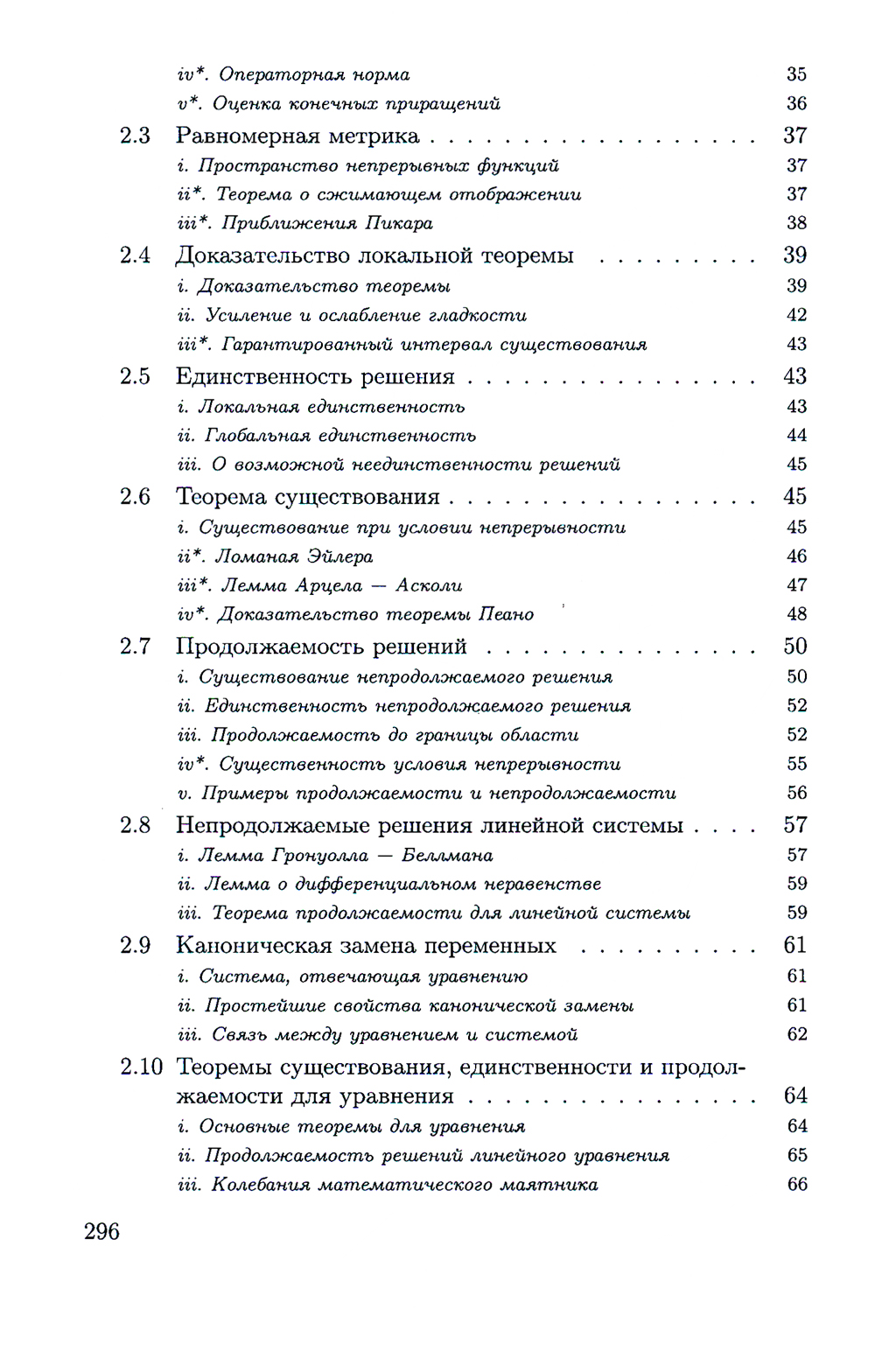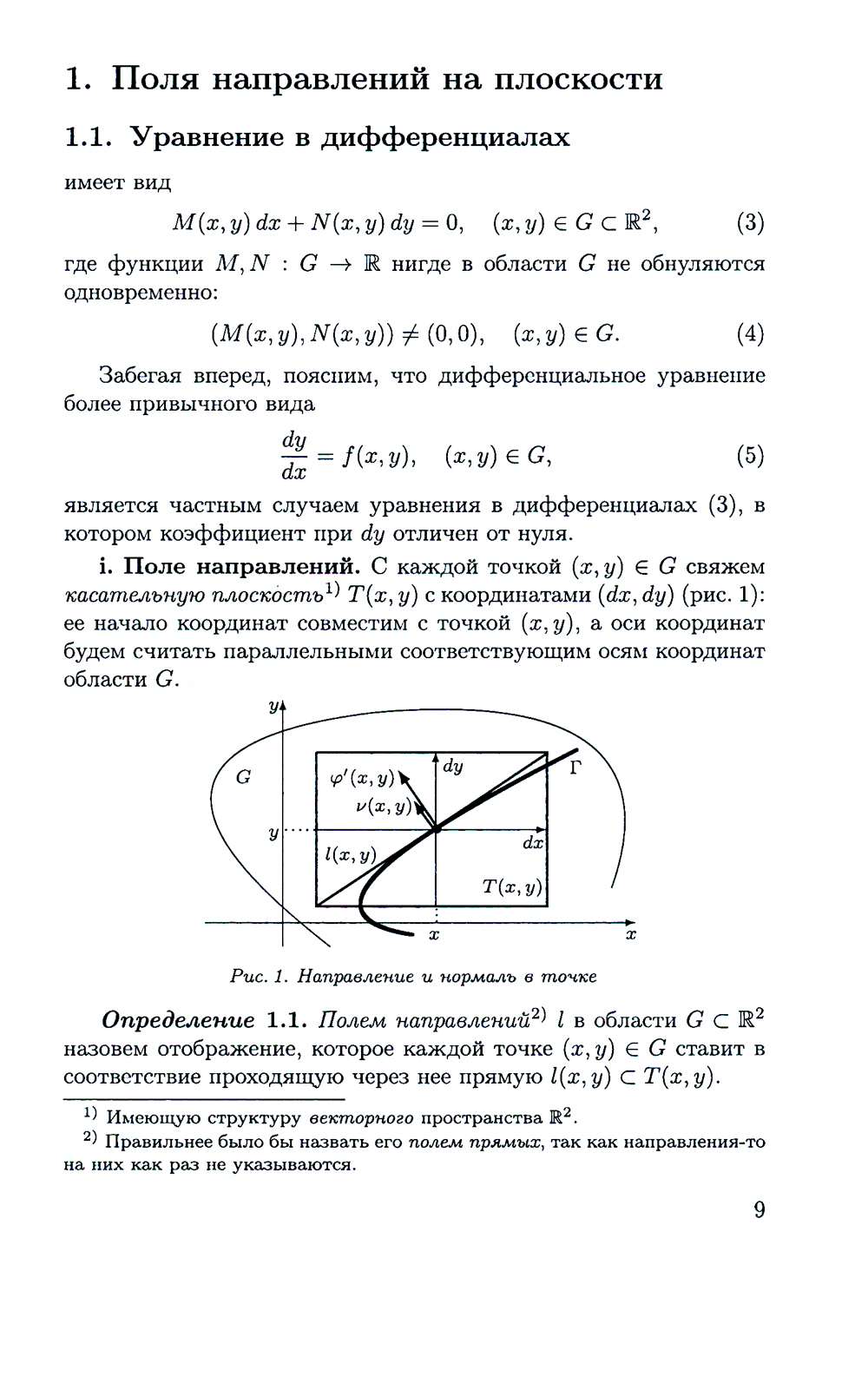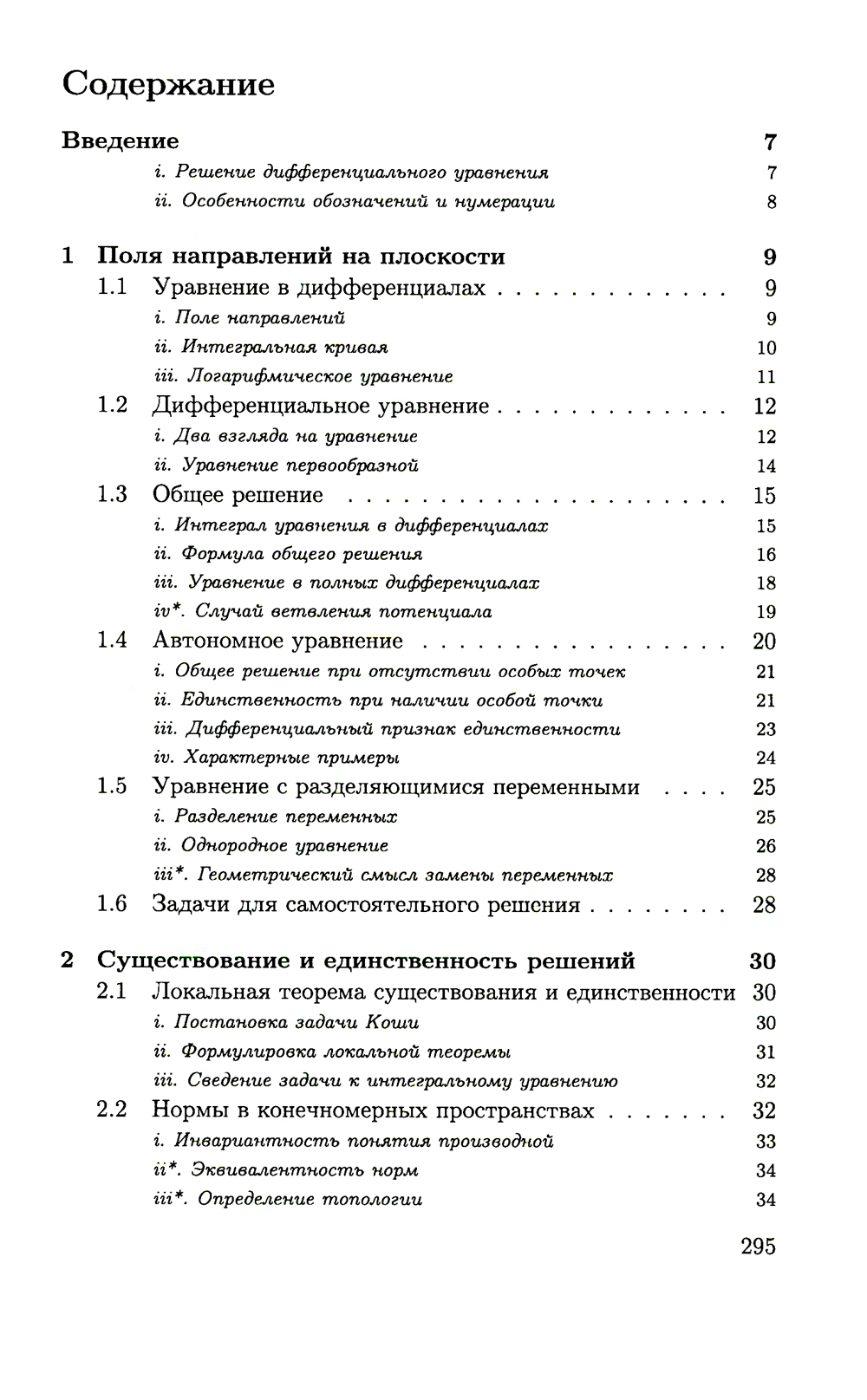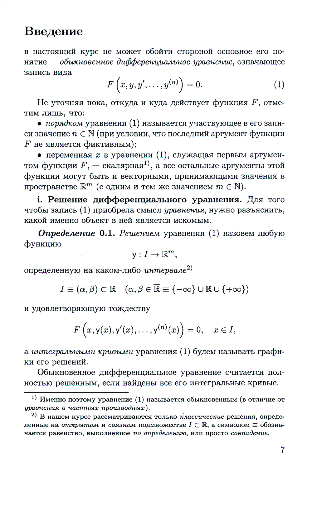 Представлен подробный конспект обязательного курса обыкновенных дифференциальных уравнений, на протяжении многих лет читавшегося автором для студентов механико-математического факультета МГУ имени М. В.Ломоносова. Учебник знакомит читателей с геометрической интерпретацией уравнения первого порядка, с первыми интегралами, особыми точками и предельными циклами автономных систем, с теорией линейных уравнений и систем, в том числе с постоянными и периодическими коэффициентами, с вопросами существования, единственности и продолжаемости решений, их непрерывности и дифференцируемости по параметру, устойчивости по Ляпунову, а также с вопросами существования и единственности решения задачи Коши для уравнения с частными производными первого порядка. Даны точные определения, аккуратно сформулированы и доказаны утверждения, строго обоснованы наиболее важные методы решения задач. Приведены все необходимые теоретические сведения, сопутствующие понятия и факты из смежных разделов математики. Предложены задачи для самостоятельного решения, позволяющие глубже проникнуть в прочитанный материал. Для студентов и аспирантов, изучающих классическую теорию обыкновенных дифференциальных уравнений.