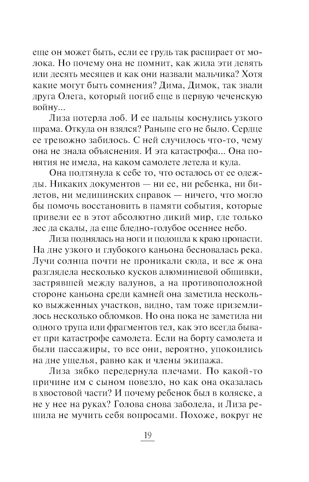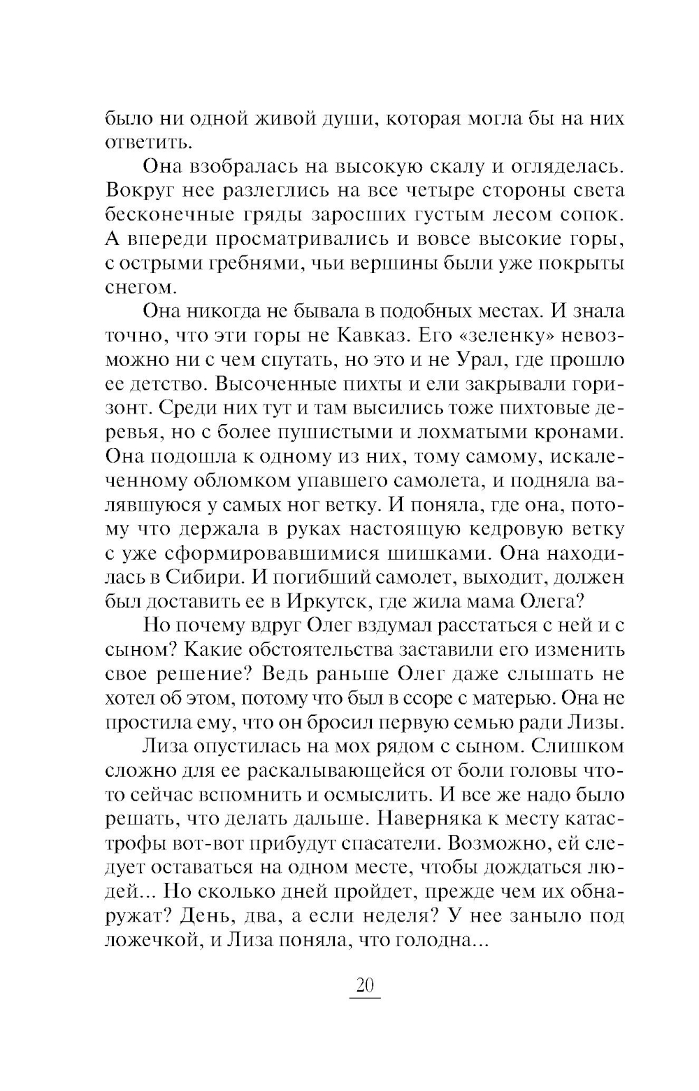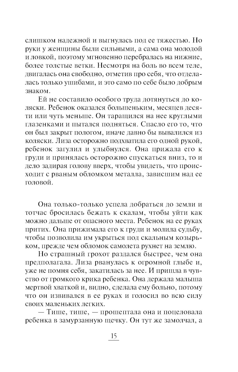 Лиза очнулась и не поняла, где она. Кругом затянутый дымом лес и обгоревшие обломки самолета… Похоже, она чудом осталась в живых после авиакатастрофы! Но куда она летела и зачем? Вспоминать было некогда: Лиза услышала детский плач. Коляска зацепилась за дерево на краю обрыва. Это же ее сын! Рискуя жизнью, Лиза спасла мальчика. Вещи, обнаруженные среди багажа упавшего самолета, помогли ей обустроить лагерь, да и опыт бойца спецназа, где она когда-то служила, чего-то стоил. Но как выбраться из глухой тайги?.. Директор крупного военного завода Морозов ждал бывшую жену с маленьким сыном. После сообщения о гибели самолета надежда оставалась только на спасателей. И она оправдалась: в тайге была обнаружена женщина с маленьким ребенком. Когда Лизу доставили в город, Морозов убедился: она спасла его сына, которого считает своим. Мужчина принял решение взять ее к себе в дом, конечно, только ради ребенка. Он продолжал упорно верить в этот самообман…| Издательство | Эксмо |