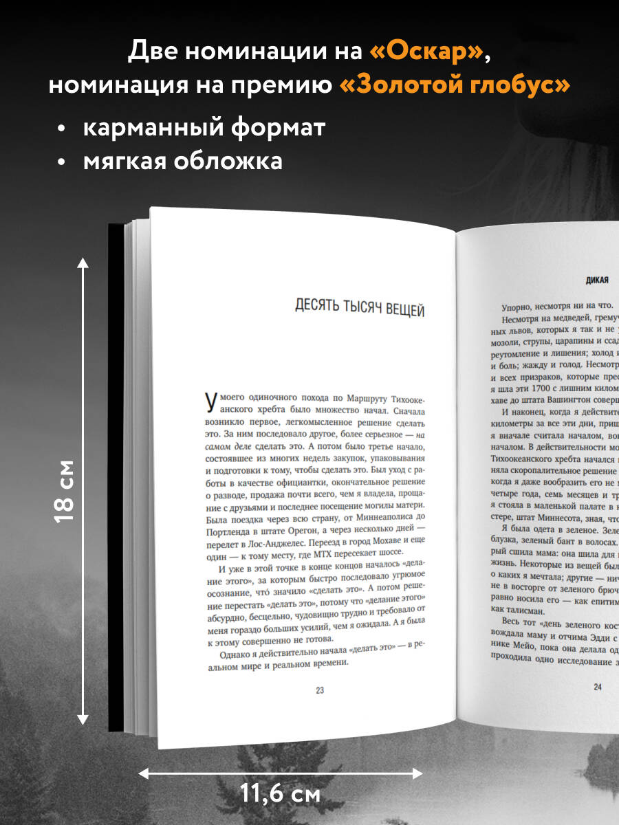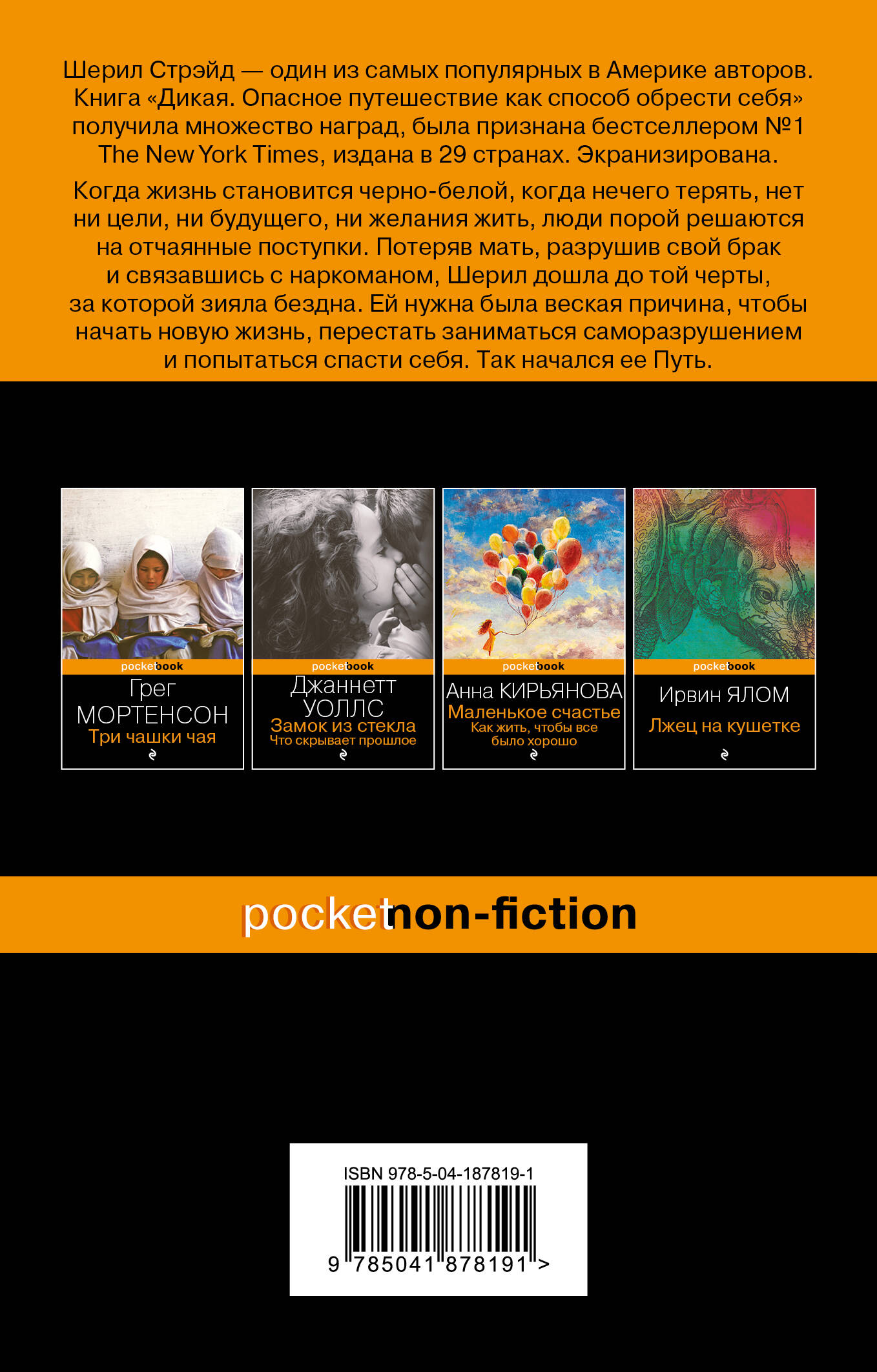 Когда жизнь становится черно-белой, когда нечего терять, нет ни цели, ни будущего, ни желания жить, люди порой решаются на отчаянные поступки. Потеряв мать, разрушив свой брак и связавшись с наркоманом, Шерил дошла до той черты, за которой зияла бездна. Ей нужна была веская причина, чтобы начать новую жизнь, перестать заниматься саморазрушением и попытаться спасти себя. И она в одиночку отправилась в пешее путешествие длиной 1770 км. Поход Шерил был не только трудным, но и опасным. Ей пришлось пройти 27 километров по палящей пустыне лишь с небольшим запасом воды, совершить несколько дневных переходов длиной в 30 километров, пройти по узкой тропе, расположенной выше 2 тысяч метров над уровнем моря, взобраться на заснеженную гору с рюкзаком, весящим 36 килограмм. Но что было сложнее - выдержать тяжелейшие условия или найти ответы на свои вопросы? Полное опасностей приключение позволило Шерил кардинально изменить свою жизнь, обрести душевное равновесие и гармонию. БЕСТСЕЛЛЕР В КАРМАННОМ ФОРМАТЕ! Издан в 29 странах, экранизирован. Две номинации на «Оскар», номинация на премию «Золотой глобус». Теперь в знаменитой серии Pocket book.| Издательство | ООО "Издательство "Эксмо" |