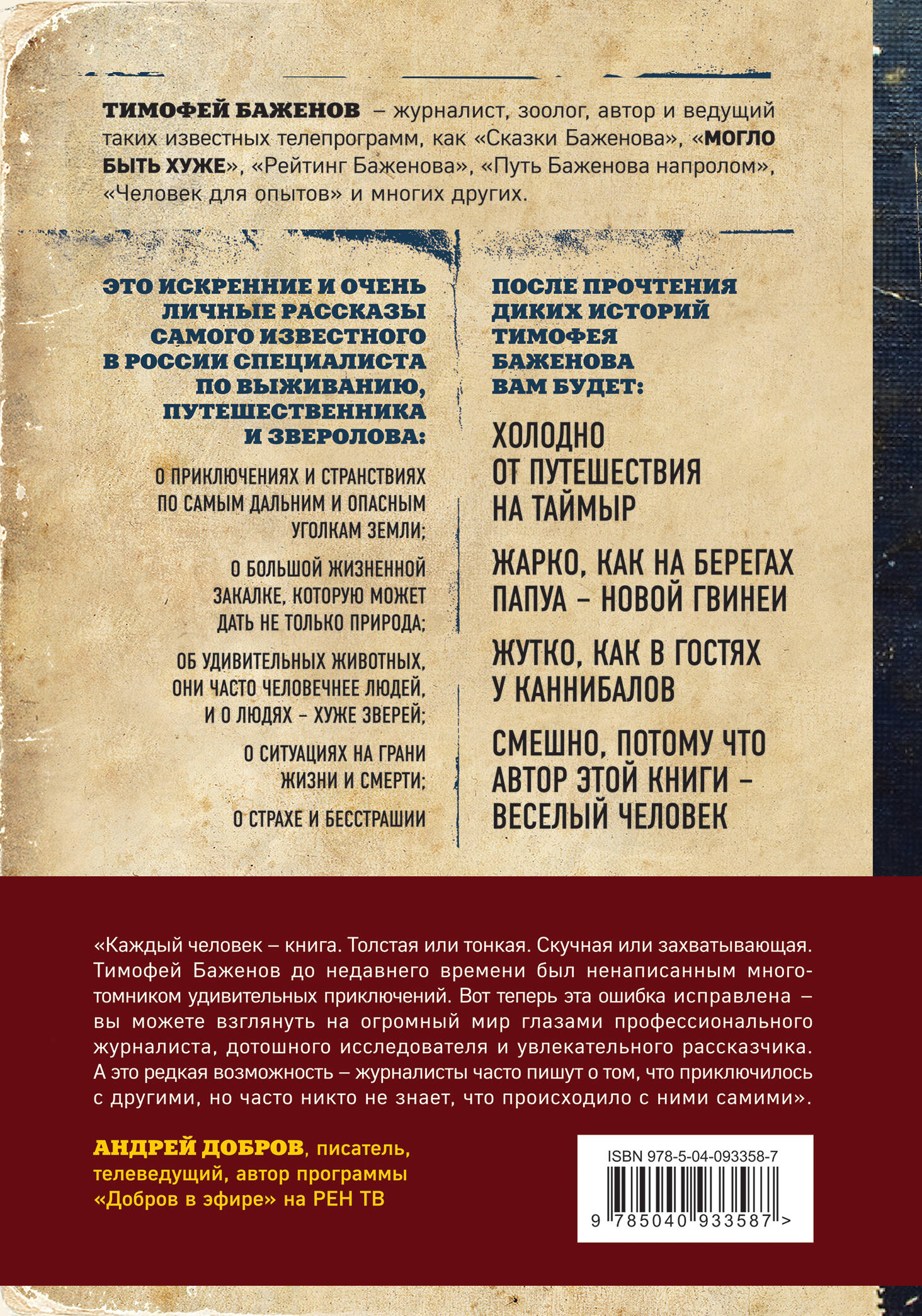 Тимофей Баженов - известный телеведущий, путешественник, зоолог, специалист по выживанию. До недавнего времени он был ненаписанным многотомником удивительных приключений. Эта книга - сборник его искренних, порой суровых, порой ироничных историй о своей жизни, путешествиях по самым таинственным уголкам Земли, удивительных встречах с дикими животными и не менее дикими людьми. Каково же это - быть настоящим мужчиной, бороться с собственными страхами и оставаться верным первобытной тяге к природе и приключениям? Откройте эту книгу и взгляните на огромный мир глазами профессионального журналиста, дотошного исследователя и увлекательного рассказчика.| Издательство | ООО "Издательство "Эксмо" |