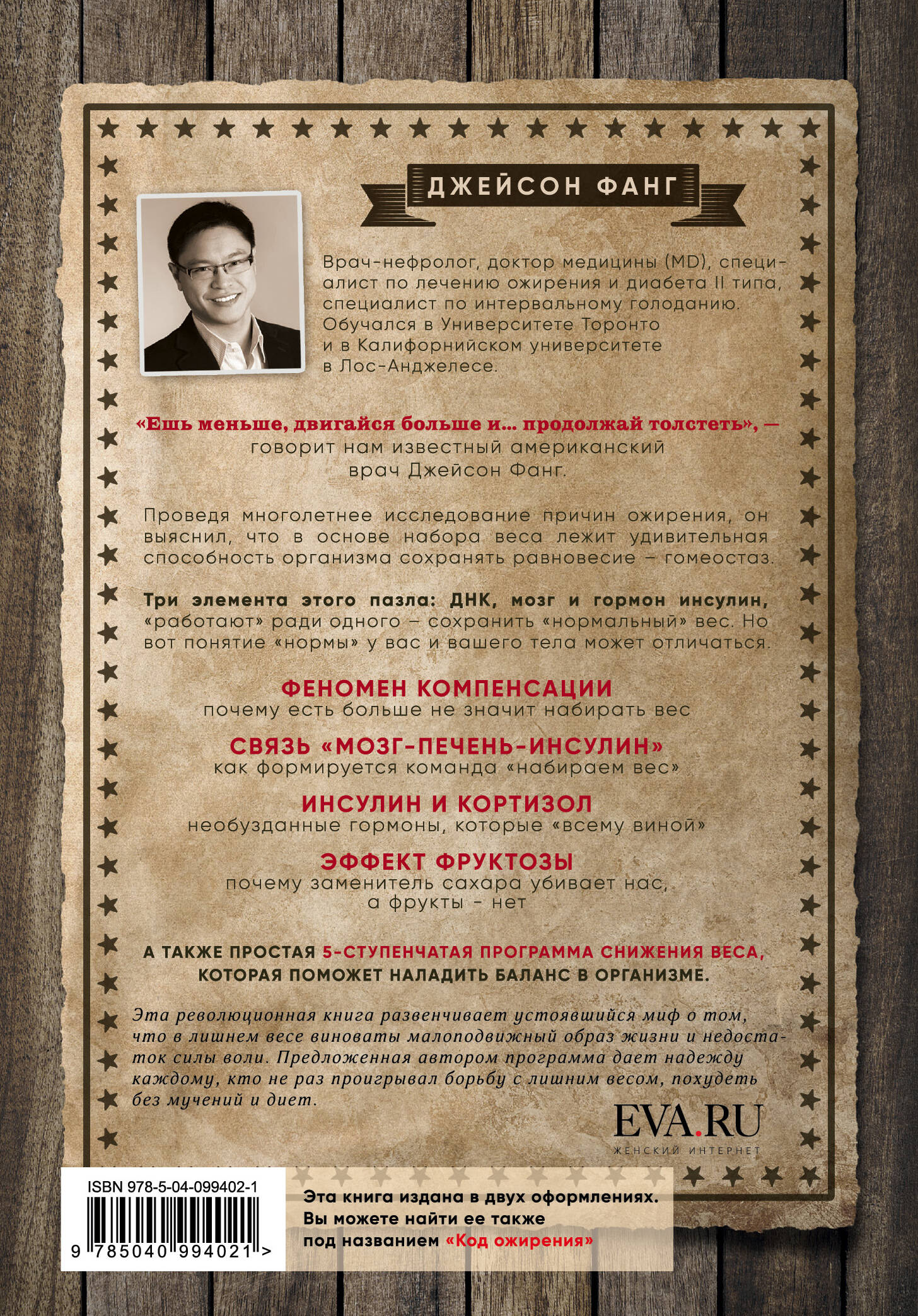 Почему люди толстеют? Привычная парадигма заключается в предположении, что мы много едим и мало двигаемся, отсюда и результат. А ну-ка попробуйте больше двигаться и меньше есть! Получилось похудеть? Конечно, нет. Особенно, когда речь идет об абдоминальном ожирении (жирок на животе и внутренних органах). Тут и на диету садятся, и голодают, а результат держится только в момент самоистязания. Доктор-нефролог, всемирно известный специалист по лечению ожирения и диабета доктор Фанг на основании 30-летних исследований доказывает нам, что причина лишнего веса кроется не в личной неспособности сдерживать себя. Главный виновник лишнего веса - гормон инсулин. Именно его деятельность дает мозгу неправильно заданное значение веса. Проще говоря, мозг считает нормой завышенный вес тела, а потому оберегает его от любых посягательств со стороны. Потому и диеты не работают в долгосрочной перспективе! Данная книга продается также в другом оформление под названием «Код ожирения». - Как же убедить мозг снизить заданное значение веса? - Как договориться со своей гормоналкой? - И почему так опасна фруктоза? Революционная книга, многолетний бестселлер во всем мире, дает ответы на эти и другие вопросы. Но главное - она помогает снизить свой вес до реальной нормы и убедить мозг дать команду организму похудеть.| Издательство | ООО "Издательство "Эксмо" |