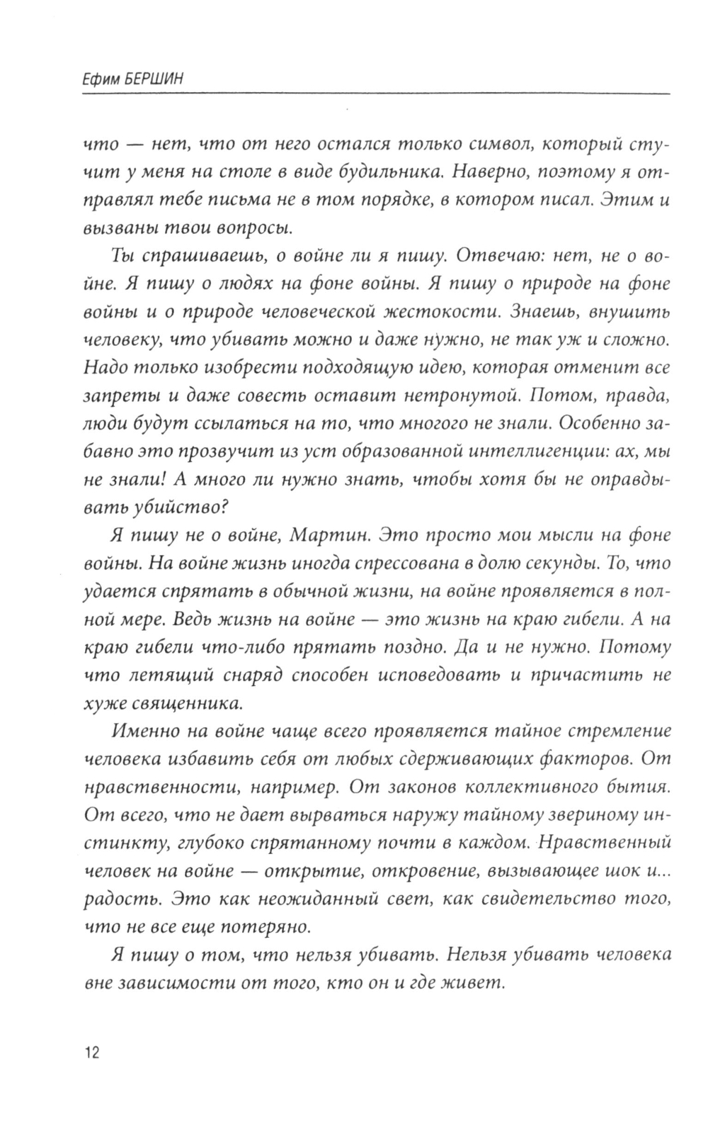«Их пришли убивать. Убивать за то, что у них есть родной язык, и они не пожелали от него отказаться. Убивать за то, что отказались сдаться новому нацизму. Убивать, наконец, за то, что они - просто другие». Поэт и журналист Ефим Бершин, работавший на этой войне репортером «Литературной газеты», стал свидетелем массового убийства простых людей новыми нацистами, которые пришли в Приднестровье, прикрываясь лозунгами о демократии и правах человека. Однако лозунги уже никого не могут ввести в заблуждение, потому что за ними - кровь. «Не убий» - вот главная идея этой книги. Война в Приднестровье была остановлена больше 30 лет назад, но настоящий мир там так и не наступил. Мир на этой земле настолько хрупок, что постоянно грозит обернуться новой войной.