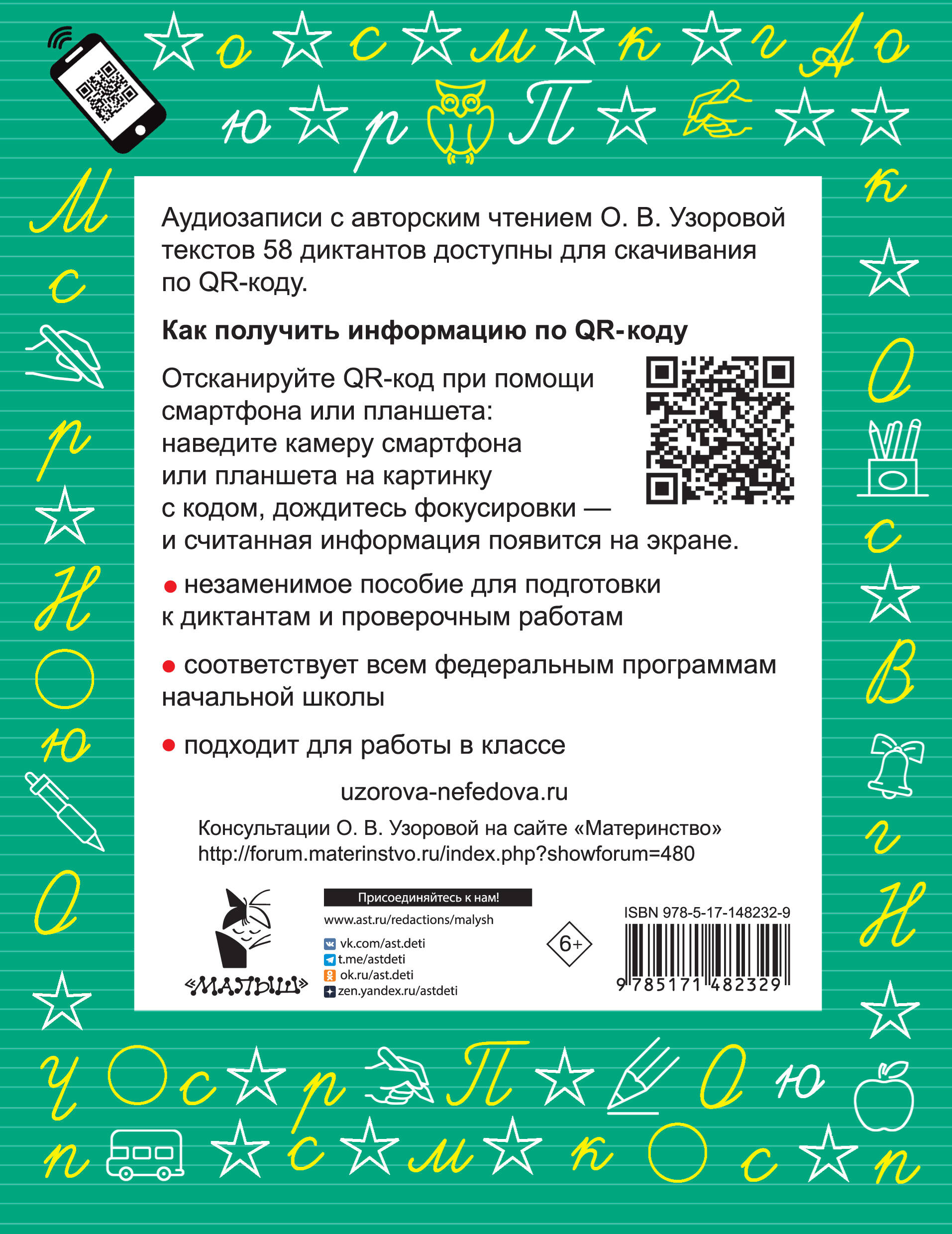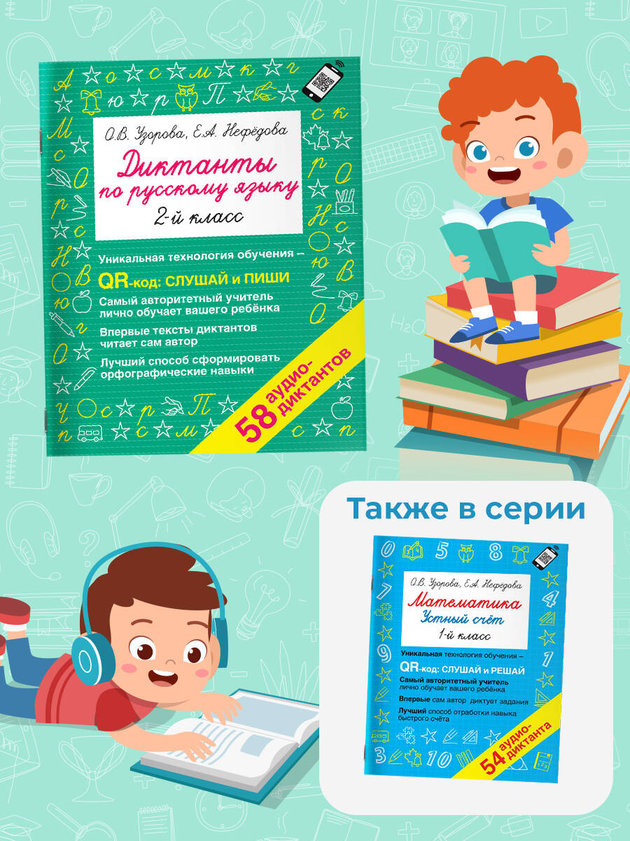 «Диктанты по русскому языку. 2-й класс. QR-код для аудиотекстов» - это сборник диктантов для учеников 2-го класса, основанный на авторской методике О. В. Узоровой. Пособие поможет учителям проверить знания учеников, а учащимся - успешно подготовиться к контрольным и проверочным работам. Для многих диктантов в книге даны QR-коды с авторским чтением текстов. Нужно навести камеру смартфона на QR-код, и сама О. В. Узорова продиктует ребёнку текст с нужной скоростью.