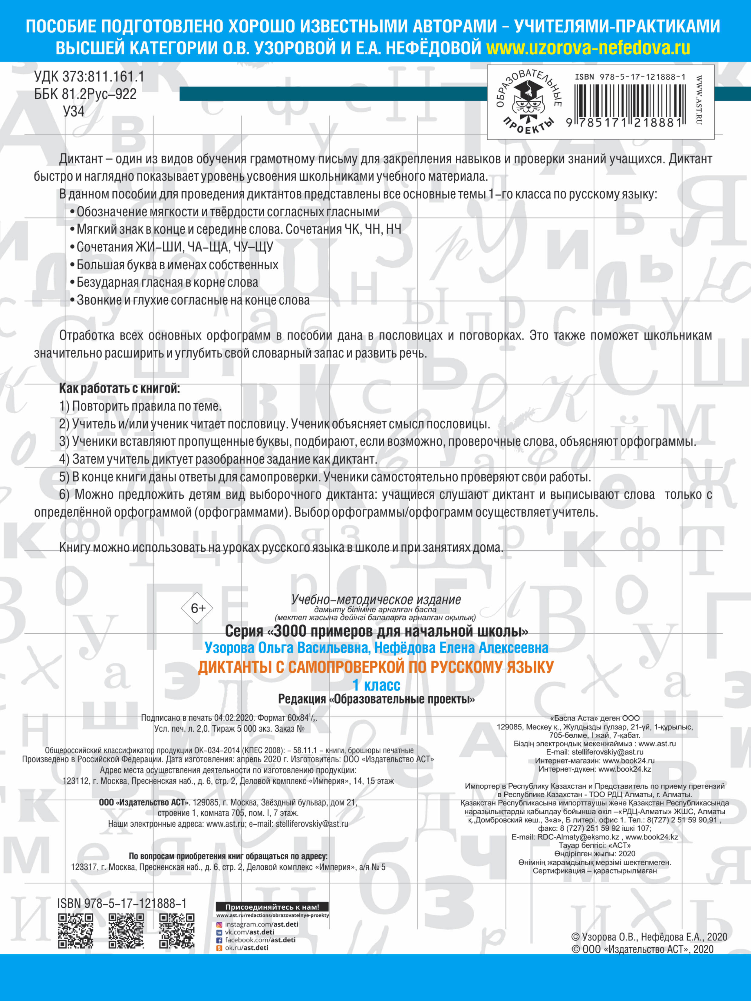 Диктант - один из видов обучения грамотному письму для закрепления навыков и проверки знаний учащихся. Диктант быстро и наглядно показывает уровень усвоения школьниками учебного материала. В данном пособии для проведения диктантов представлены все основные темы 1-го класса по русскому языку: Обозначение мягкости и твёрдости согласных гласными Мягкий знак в конце и середине слова. Сочетания ЧК, ЧН, НЧ Сочетания ЖИ-ШИ, ЧА-ЩА, ЧУ-ЩУ Большая буква в именах собственных Безударная гласная в корне слова Звонкие и глухие согласные на конце слова Отработка всех основных орфограмм в пособии дана в пословицах и поговорках. Это также поможет школьникам значительно расширить и углубить свой словарный запас и развить речь. Как работать с книгой: 1) Повторить правила по теме. 2) Учитель и/или ученик читает пословицу. Ученик объясняет смысл пословицы. 3) Ученики вставляют пропущенные буквы, подбирают, если возможно, проверочные слова, объясняют орфограммы. 4) Затем учитель диктует разобранное задание как диктант. 5) В конце книги даны ответы для самопроверки. Ученики самостоятельно проверяют свои работы. 6) Можно предложить детям вид выборочного диктанта: учащиеся слушают диктант и выписывают слова только с определённой орфограммой (или орфограммами). Выбор орфограммы/орфограмм осуществляет учитель. Книгу можно использовать на уроках русского языка в школе и при занятиях дома.| Издательство | ИЗДАТЕЛЬСТВО "АСТ" |