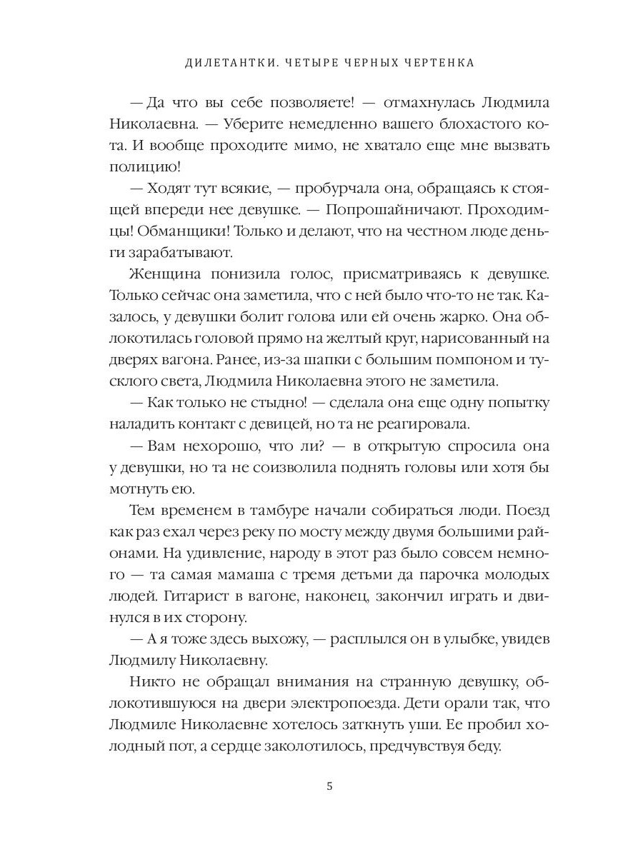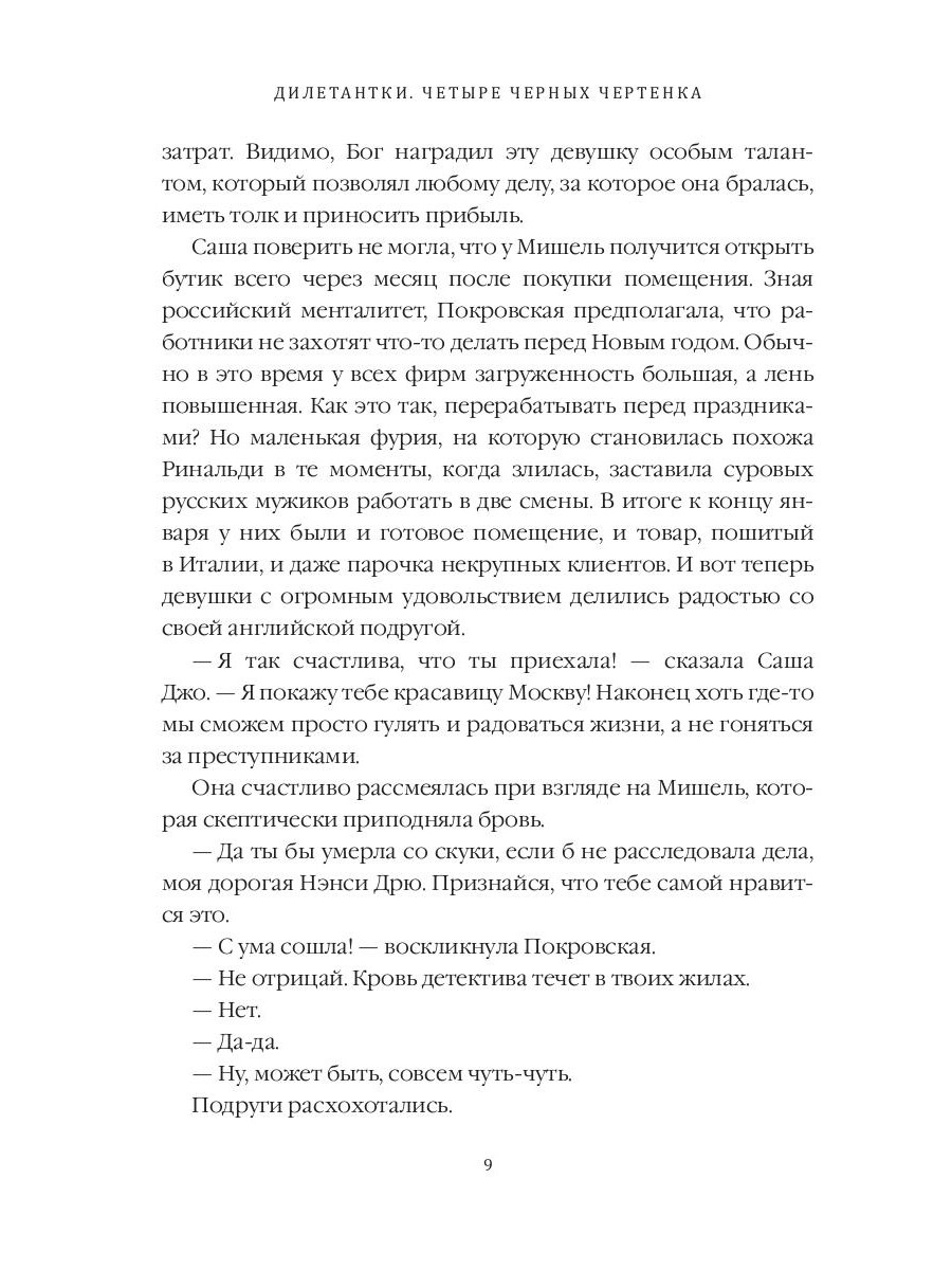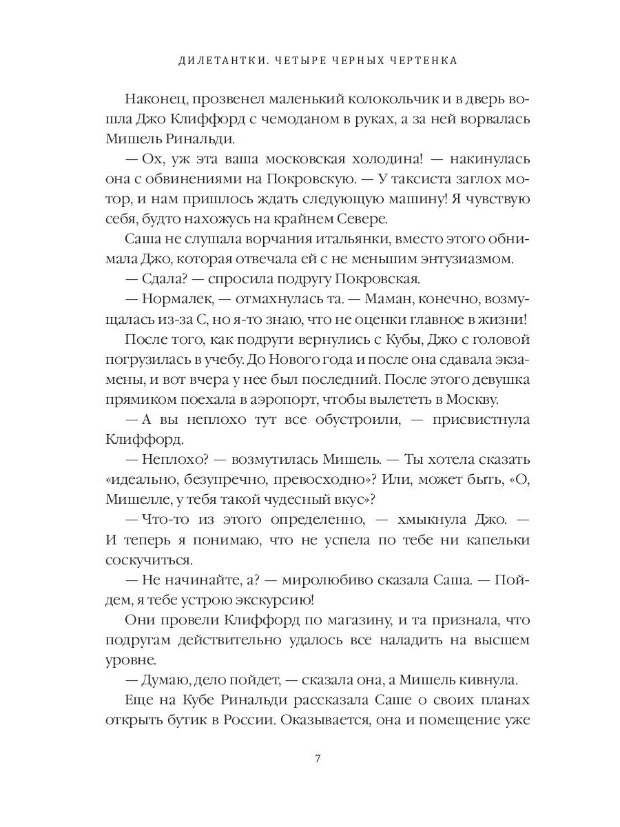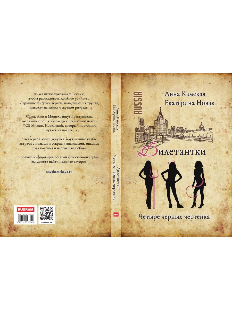 Дилетантки приехали в Россию, чтобы расследовать двойное убийство. Странные фигурки чертей, найденные на трупах, наводят на мысль о жутком ритуале. Саша, Джо и Мишель ищут преступника, но за ними по пятам следует несносный майор ФСБ Михаил Новинский, который постоянно путает их планы. В четвертой книге девушек ждут ночные клубы, встречи с новыми и старыми знакомыми, опасные приключения и настоящая любовь.| Издательство | Т8 RUGRAM |