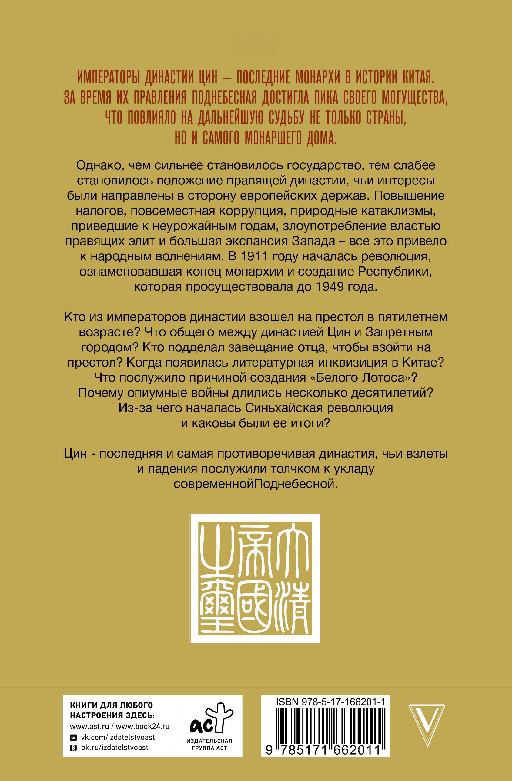 Императоры династии Цин - последние монархи в истории Китая. За время их правления Поднебесная достигла пика своего могущества, что повлияло на дальнейшую судьбу не только страны, но и самого монаршего дома. Однако, чем сильнее становилось государство, тем слабее становилось положение правящей династии, чьи интересы были направлены в сторону европейских держав. Повышение налогов, повсеместная коррупция, природные катаклизмы, приведшие к неурожайным годам, злоупотребление властью правящих элит и большая экспансия Запада - все это привело к народным волнениям. В 1911 году началась революция, ознаменовавшая конец монархии и создание Республики, которая просуществовала до 1949 года. Кто из императоров династии взошел на престол в пятилетнем возрасте? Что общего между династией Цин и Запретным городом? Кто подделал завещание отца, чтобы взойти на престол? Когда появилась литературная инквизиция в Китае? Что послужило причиной создания "Белого Лотоса"? Почему опиумные войны длились несколько десятилетий? Из-за чего началась Синьхайская революция и каковы были ее итоги? Цин - последняя и самая противоречивая династия, чьи взлеты и падения послужили толчком к укладу современной Поднебесной.| Издательство | Издательство "АСТ" |