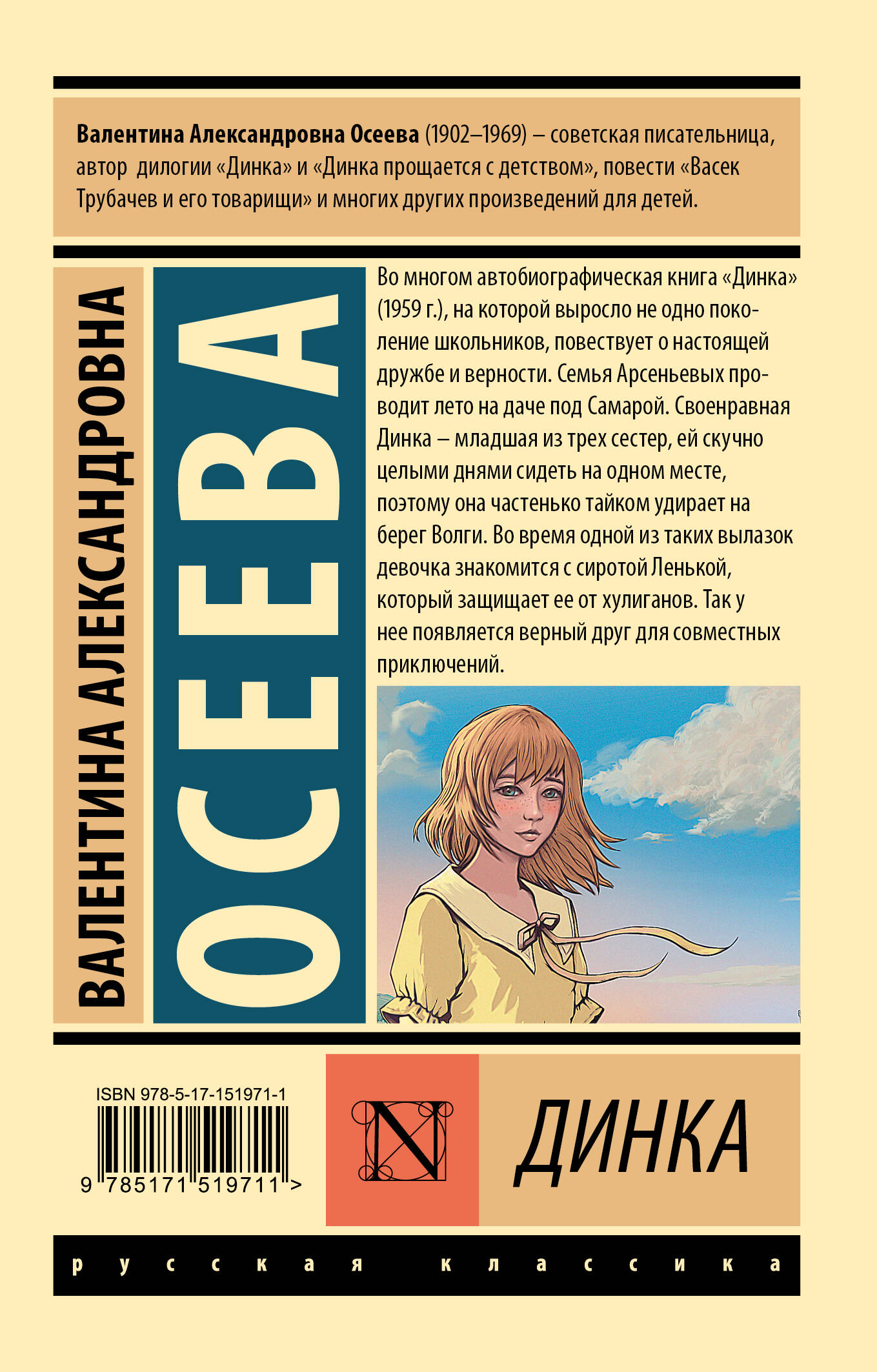 Во многом автобиографическая книга "Динка" (1959 г.), на которой выросло не одно поколение школьников, повествует о настоящей дружбе и верности. Семья Арсеньевых проводит лето на даче под Самарой. Своенравная Динка - младшая из трех сестер, ей скучно целыми днями сидеть на одном месте, поэтому она частенько тайком удирает на берег Волги. Во время одной из таких вылазок девочка знакомится с сиротой Ленькой, который защищает ее от хулиганов. Так у нее появляется верный друг для совместных приключений.| Издательство | ИЗДАТЕЛЬСТВО "АСТ" |