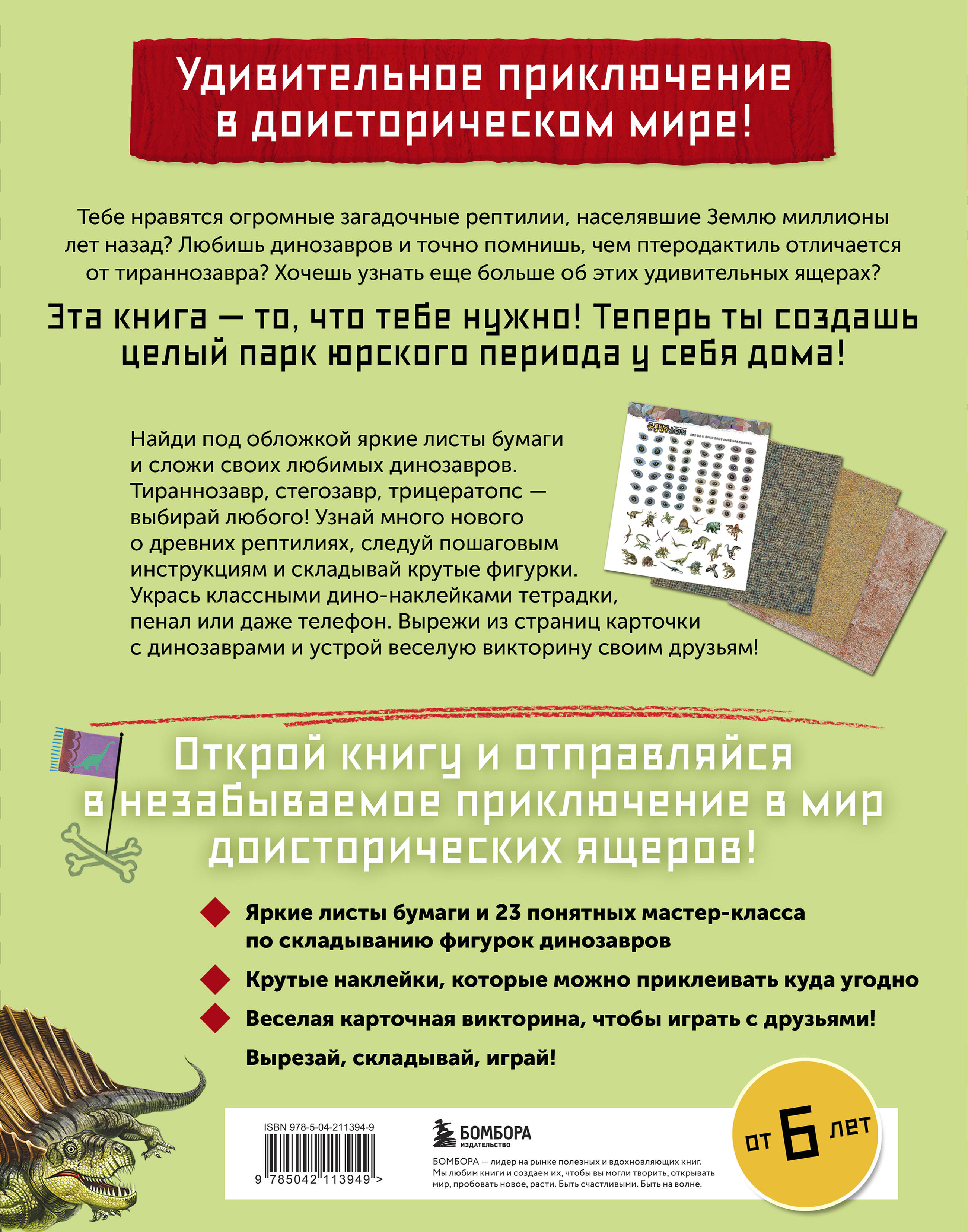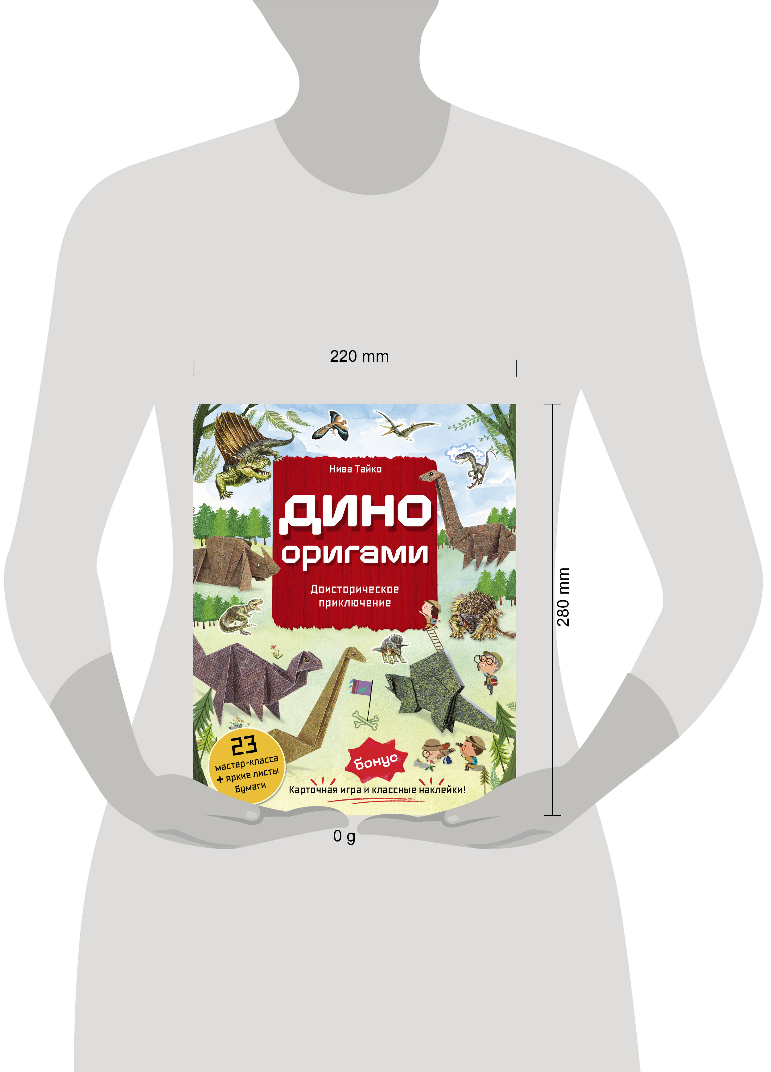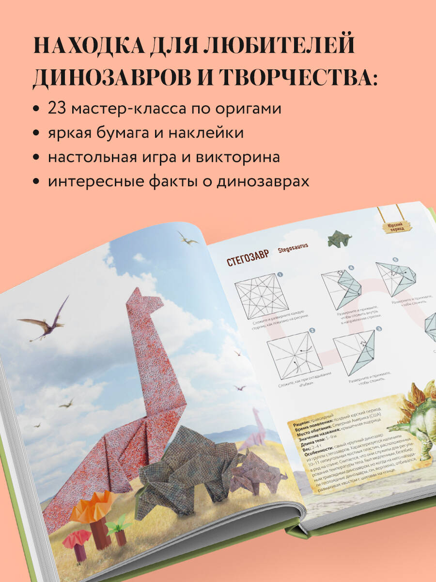 Создай дино-парк из бумаги и отправляйся в захватывающее доисторическое путешествие! Любишь динозавров и мечтаешь создать свой собственный парк Юрского периода? Эта книга поможет тебе! Внутри ты найдешь 23 понятных мастер-класса по складыванию оригами. Создай своих любимых динозавров: тираннозавра, стегозавра, трицератопса и многих других. Следуй пошаговым инструкциям, используй яркие листы бумаги и складывай удивительных древних рептилий своими руками! Но это еще не все! В книге тебя ждут крутые наклейки, которыми можно украсить тетрадки, пенал или даже телефон. А еще - карточки с динозаврами для веселой викторины. Ими можно не только проверить свои знания, но и поиграть с друзьями. Узнавай интересные факты и собирай свою коллекцию доисторических существ! • Яркие листы бумаги и 23 понятных мастер-класса по складыванию фигурок динозавров. • Крутые наклейки, которые можно приклеивать куда угодно. • Веселая карточная викторина, чтобы играть с друзьями! Эта книга - не просто сборник оригами, а целое путешествие в мир древних существ! Складывай, играй, наклеивай и узнавай новое о динозаврах. Открывай книгу и начинай свое доисторическое приключение прямо сейчас!| Издательство | ООО "Издательство "Эксмо" |