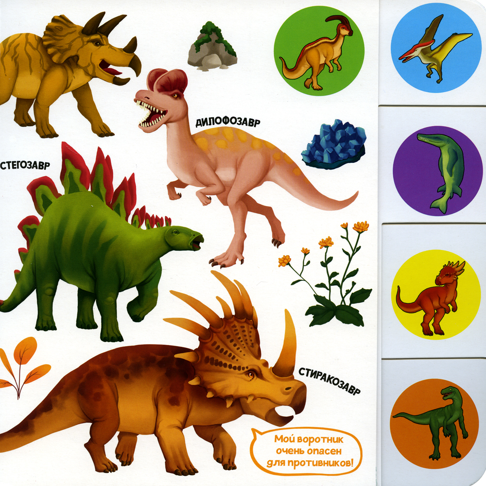 Фотографии и реалистичные картинки, используемые в данной книге, помогут сформировать у ребёнка правильное впечатление о транспорте, животных и динозаврах, а оригинальная постраничная вырубка обязательно привлечёт внимание малыша.