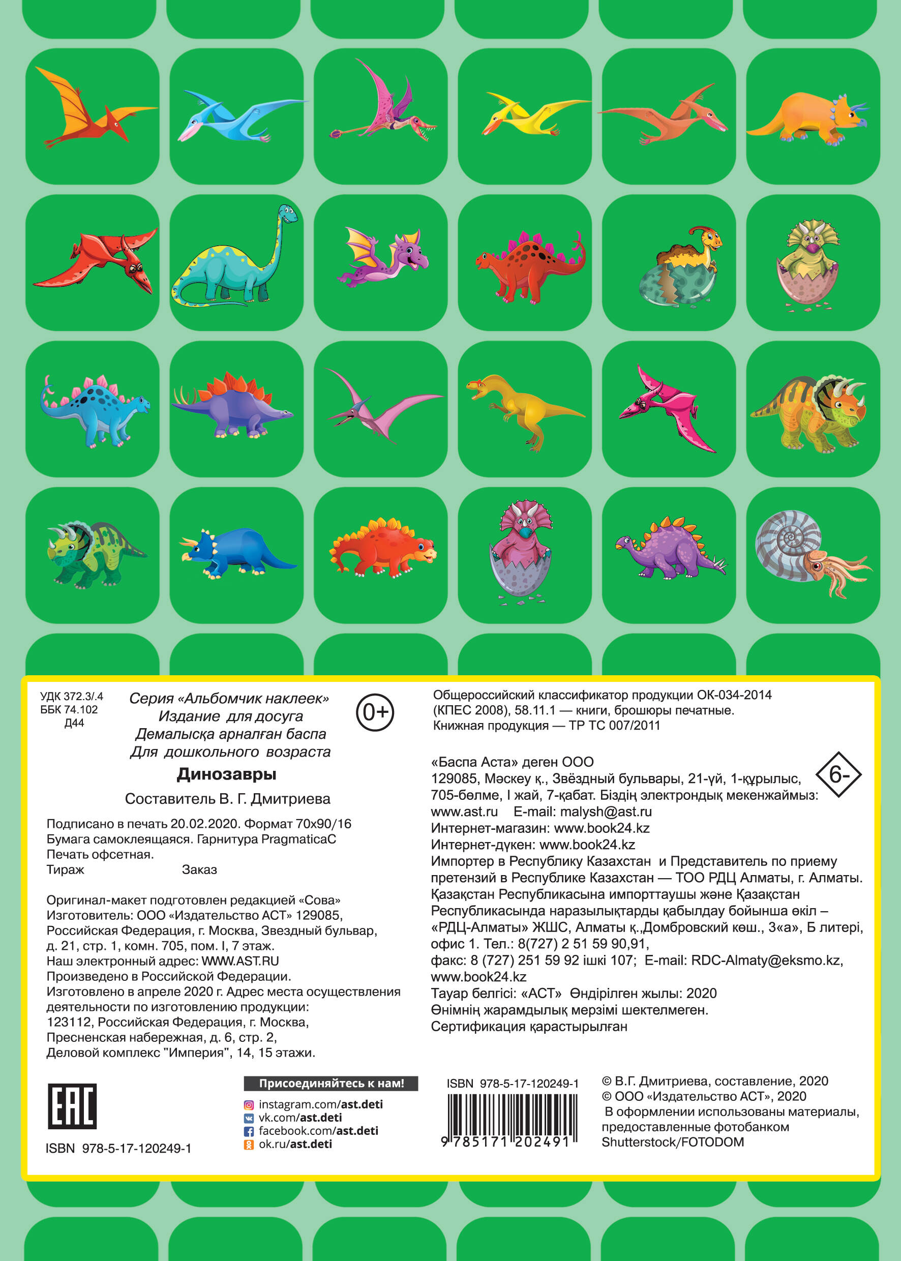 О чем эта книга Прекрасно иллюстрированный альбомчик наклеек познакомит ребенка с миром динозавров. Кому эта книга будет интересна Красочно иллюстрированный альбомчик наклеек динозавров порадует маленьких фантазёров и метчателей. Каковы особенности этой книги • Более 55 наклеек ярких иллюстраций Древнего мира. • Набор наклеек доисторических животных сделает игры с книжкой увлекательными и полезными. • Альбомчик наклеек поможет раскрыть интеллектуальный и творческий потенциал ребёнка, развить воображение, память, логику, мелкую моторику и расширить кругозор, подарит много положительных эмоций.| Издательство | ИЗДАТЕЛЬСТВО "АСТ" |