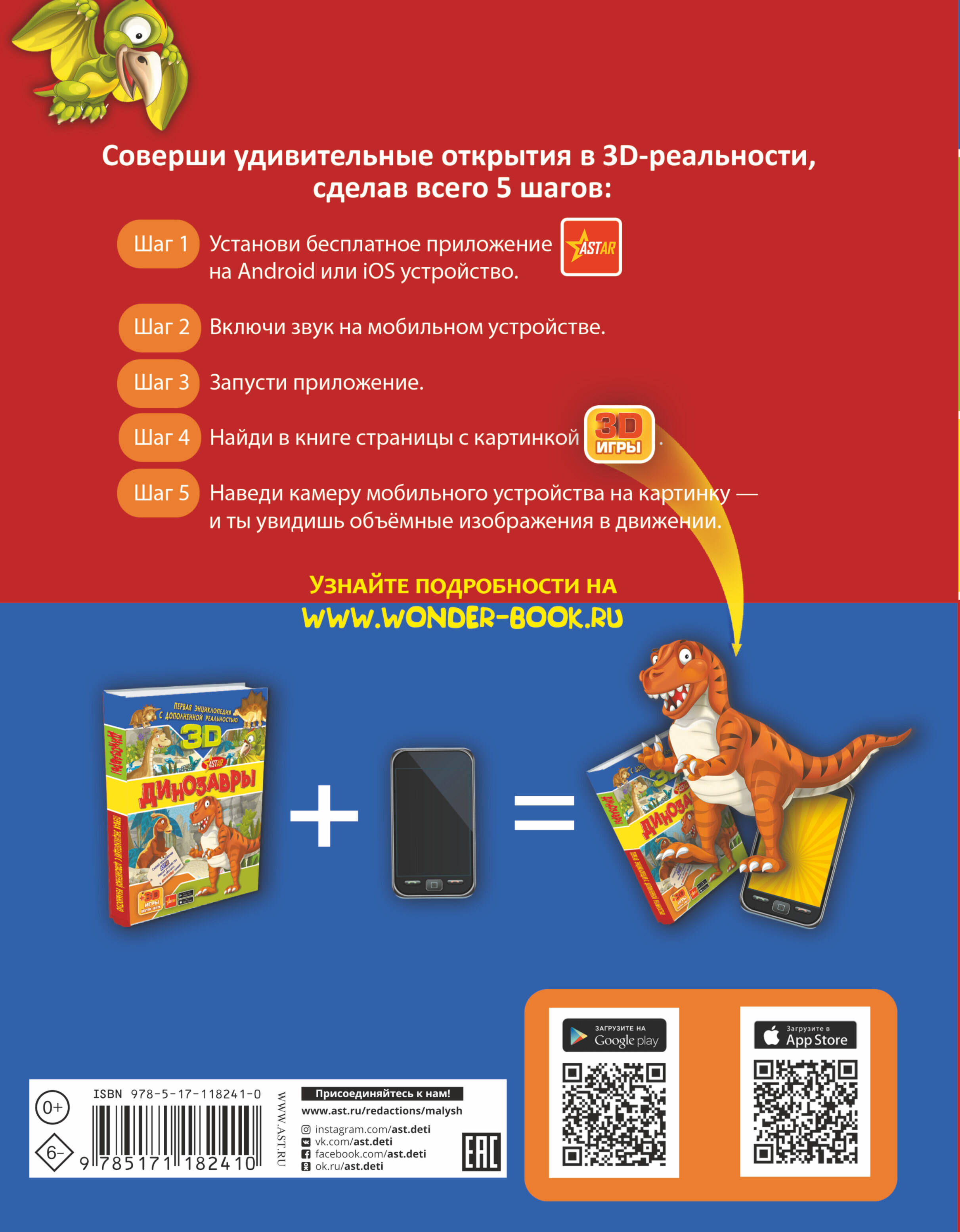 Это не просто книга о динозаврах, а настоящая интерактивная 3D-энциклопедия! Ее можно читать, изучать по движущимся объемным картинкам и даже лично пообщаться с героями -- ископаемыми ящерами. Выполни несложные инструкции, и ты поздороваешься со спинозавром, померишься ростом с зауроподом, удивишься полету птеродактиля и понаблюдаешь, как охотится дифолозавр. А кроме этих и множества других открытий, читателя ожидает настоящий сюрприз -- редкий шанс сделать селфи с самым грозным доисторическим животным. Как же его зовут? Прочти эту книгу, и ты узнаешь это! Для дошкольного возраста.| Издательство | Издательство "АСТ" |