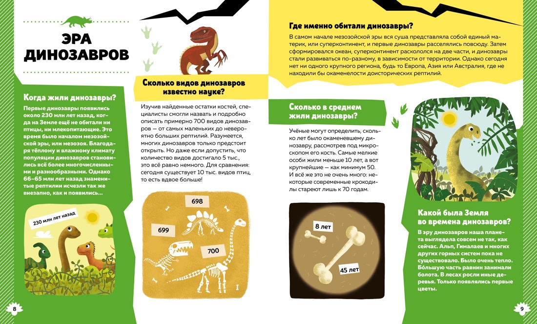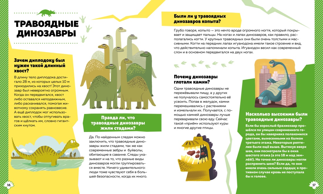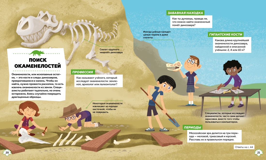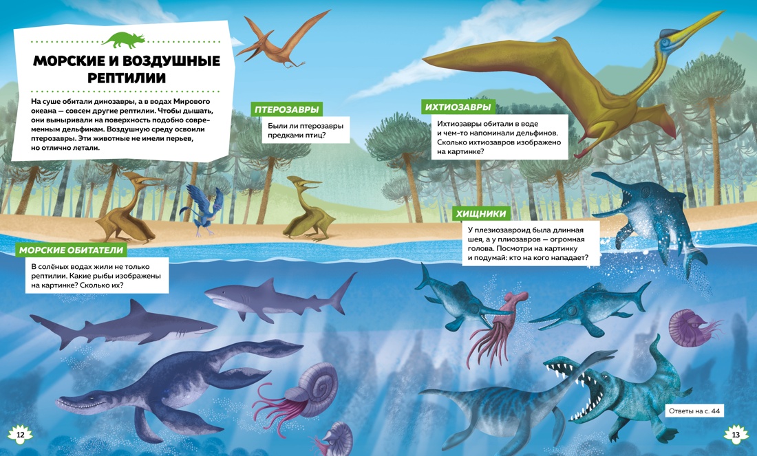 Правда ли, что динозавры умели летать? Зачем они глотали камни и щёлкали хвостами? Почему знаменитые ящеры исчезли с лица земли? И как учёные придумали им имена? Динозавры господствовали на нашей планете больше ста миллионов лет. Зубастый ти-рекс соседствовал с рогатым трицератопсом, а когтистый аллозавр - с длинношеим диплодоком. Узнай, как выглядели травоядные гиганты и свирепые хищники мезозоя. Изучи их повадки и образ жизни. На страницах этой книги собраны удивительные факты, любопытные вопросы и увлекательные задания. Добро пожаловать в мир динозавров!