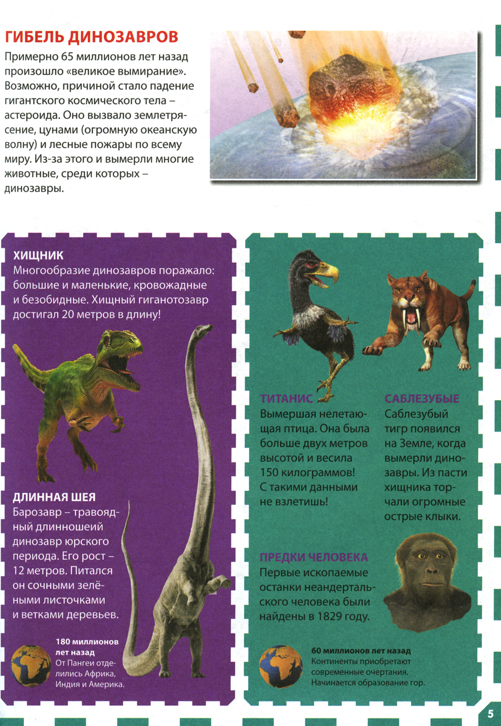 «Динозавры» - это книга о загадочных ящерах, живших на нашей планете миллионы лет назад. На страницах нашей энциклопедии вы узнаете, какие динозавры были громадными, как многоэтажный дом, а какие - маленькими, как курица, когда они появились и почему исчезли, познакомитесь со свирепым хищником гиганотозавром и мирным великаном барозавром, пернатым каудиптериксом и рогатым трицератопсом.